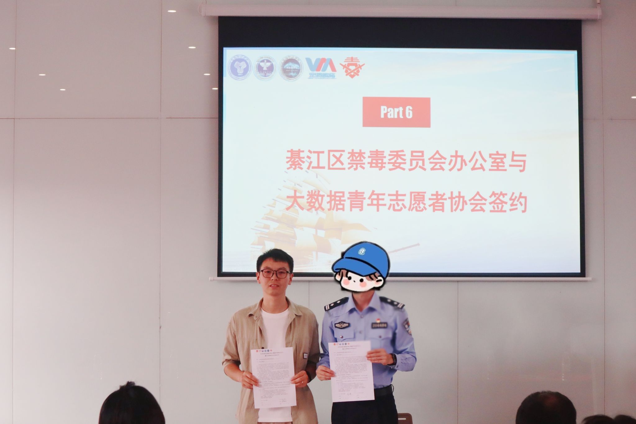 活动最后,綦江区禁毒支队领导与大数据学院李进老师上台,共同提笔签字,签署綦江区禁毒委员会办公室与大数据学院的社会实践活动协议。双方共同达成一致,在未来禁毒志愿活动、禁毒宣传推广、禁毒普及教育、禁毒宣讲进高校等活动中加强友好交流与合作,诠释青年学生抵制毒品决心,体现大学生志愿者“奉献、友爱、互助、进步”志愿精神,共享禁毒志愿服务成果,为綦江禁毒工作奉献移通志愿力量、移通学子力量。