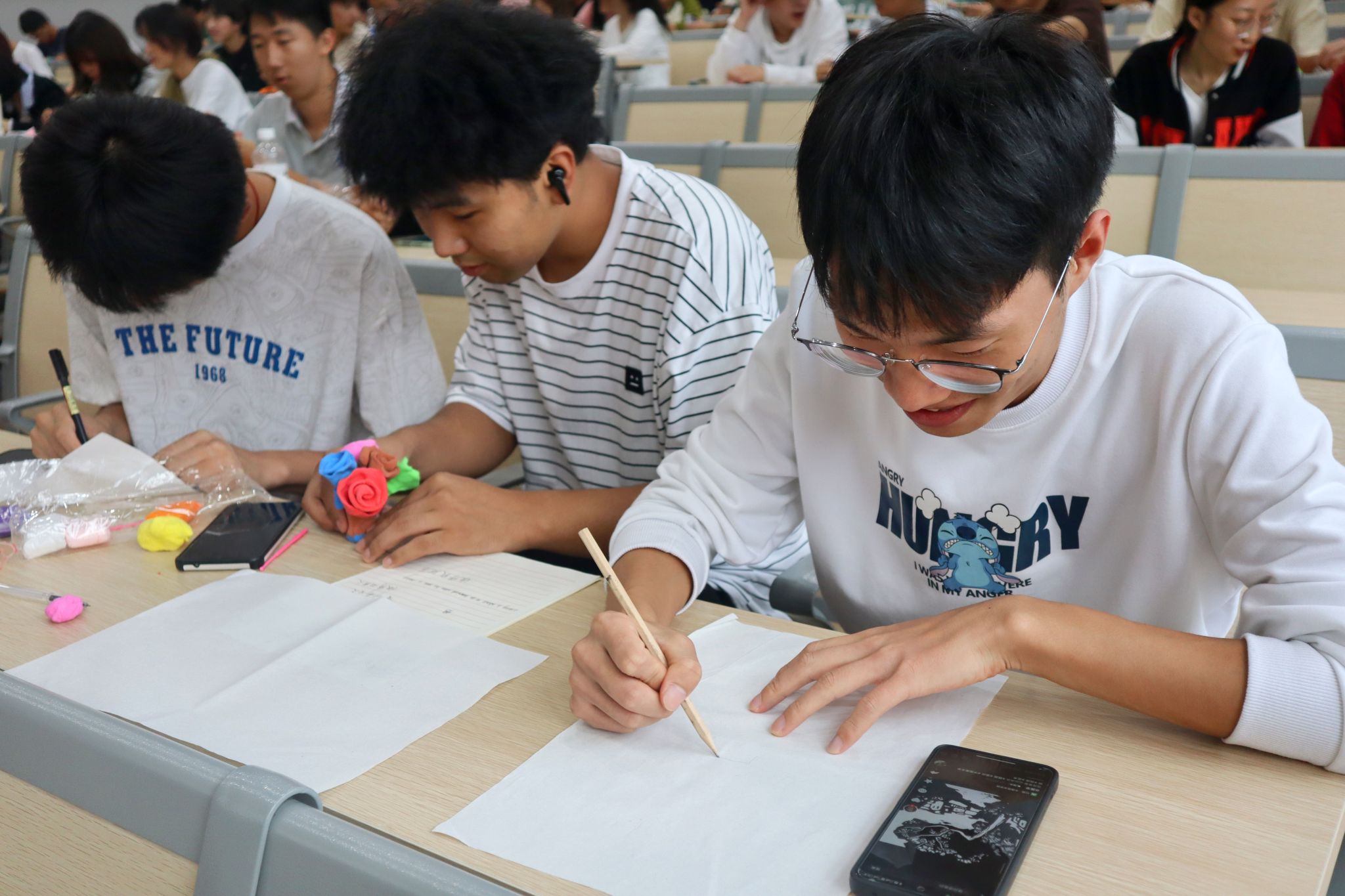 版画通过木刻的艺术形式,记录时代的故事,留下了鲜明的时代脚印。宣讲员在介绍著名版画作品时,着重介绍了版画家李桦的《怒吼吧,中国》,这是一幅反映中国抗日战争的艺术作品,创作于1935年,这幅作品呈现了一个身着中山装的中国士兵,面向天空高呼的场景。在后来的历史中成为了一种精神的象征。颜色对比的强烈、明快、朴素是木刻有生命力的艺术语言,这也是版画的意义。同学们随后也拿上宣纸、笔等工具,开始了版画体验。