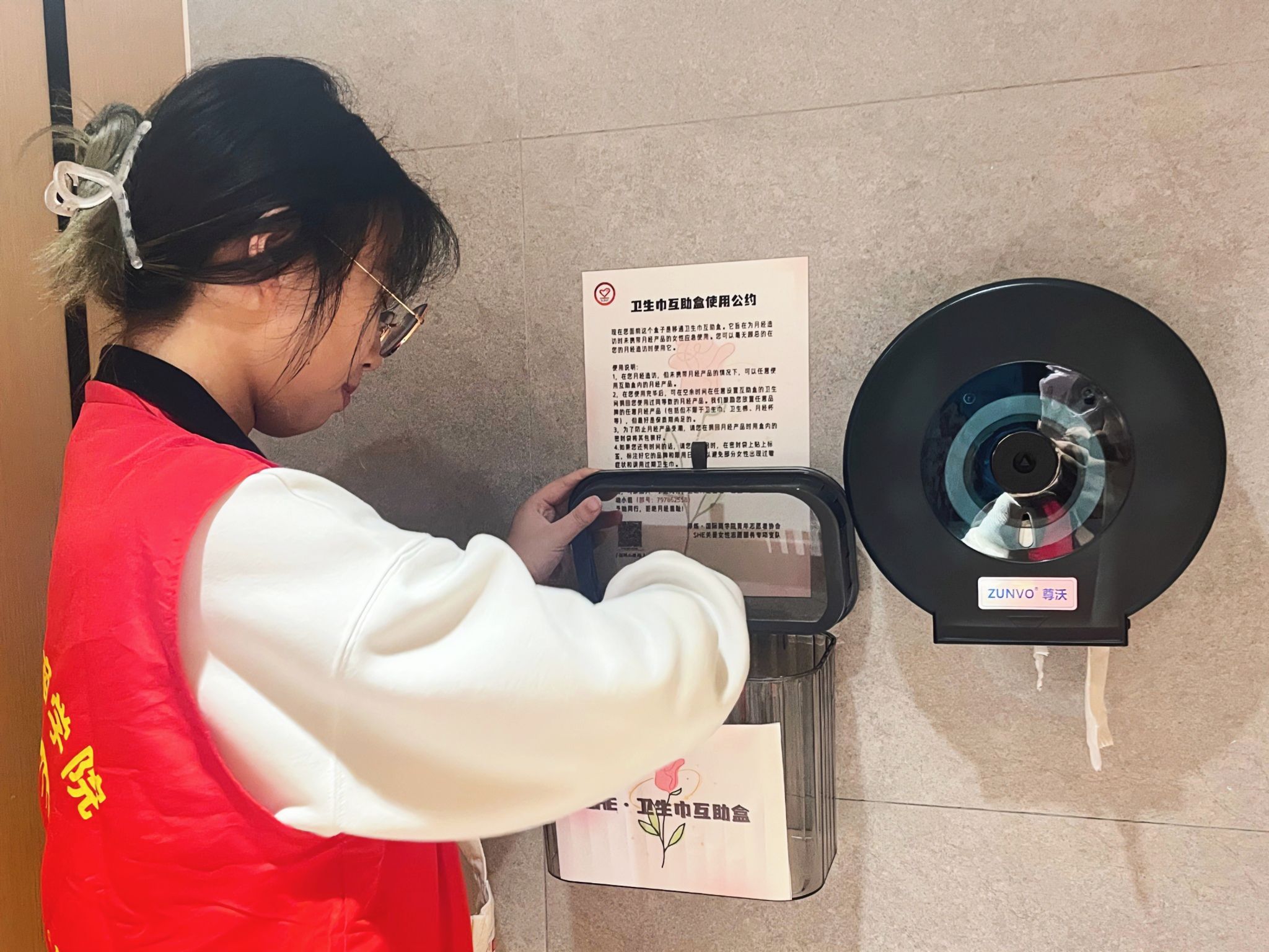 呵护女性,“SHE”关爱女性志愿服务专项支队义不容辞,经过一个小时的努力,志愿者们成功完成了重庆移通学院南校区的卫生巾补充活动,让每一栋教学楼、每一层卫生间都有志愿者用爱放置的卫生巾,为全校女性师生提供便利和帮助。卫生巾互助盒提倡大家“取一还一·爱与互助”的原则,让爱延续。