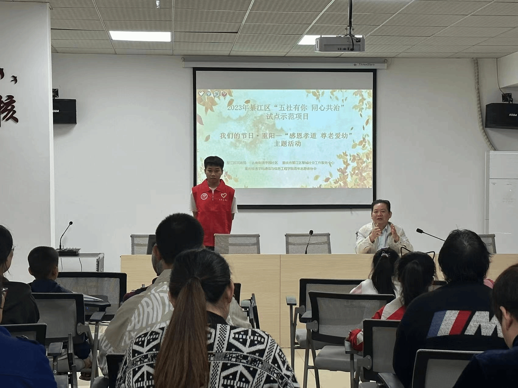 为让青少年儿童了解重阳节传统习俗,让其懂得感恩与回报。2023年10月21日通信与信息工程学院青年志愿者协会的志愿者前往古南街道枣园社区中心进行“暖在金秋,爱在重阳”的主题宣讲活动,此次活动共计30余人参加,活动受益人数50余人。