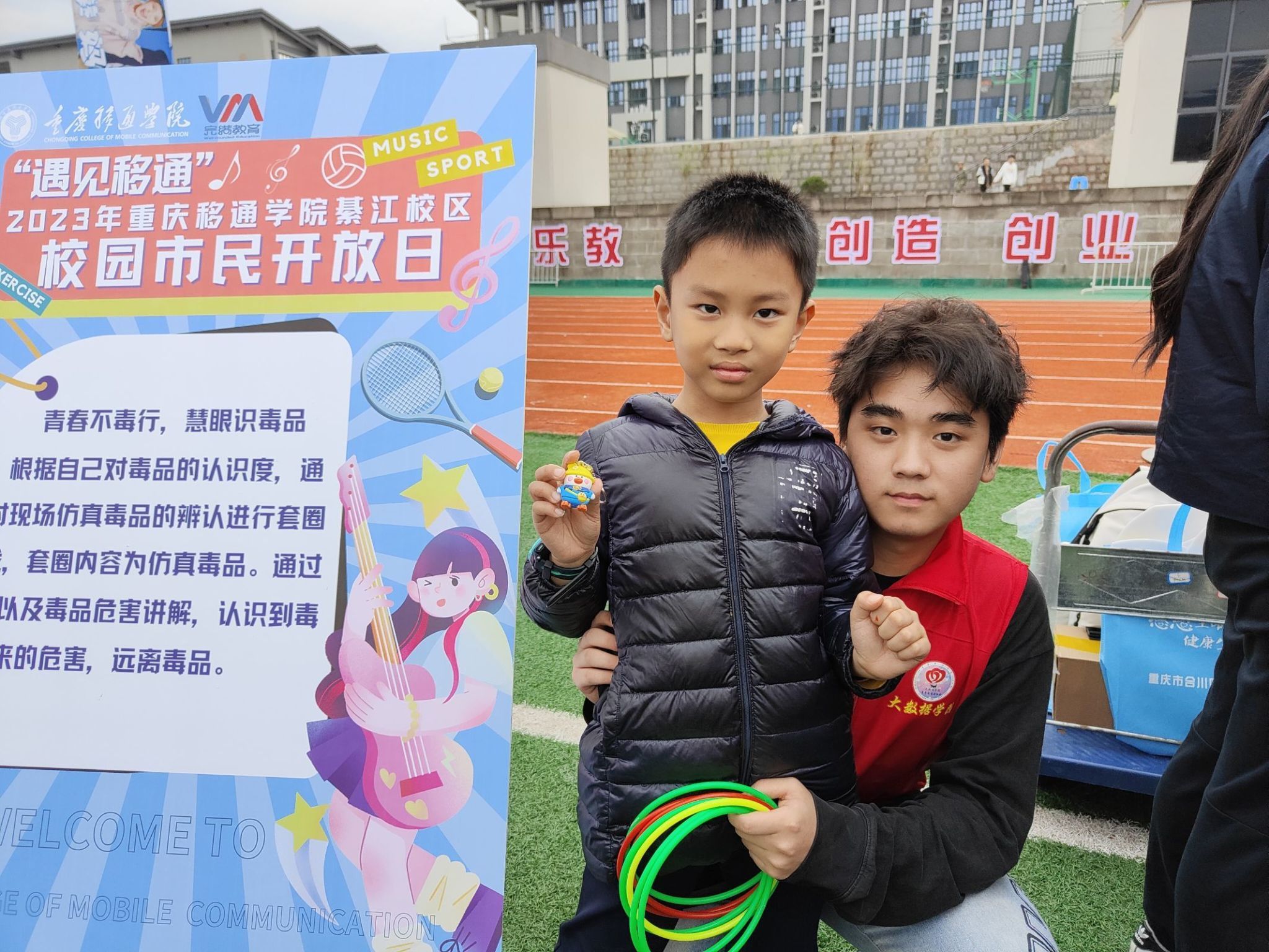 2023年10月28日下午,重庆移通学院綦江校区举办市民开放日活动,大数据学院青年志愿者协会联合 “e”心禁毒志愿服务专项支队前往校园足球场摆设多个点位,让市民朋友们了解到移通学院大数据学院志愿者们的风貌。通过参与游戏互动、套圈获奖等方式,让市民朋友们了解毒品知识,学会辨认毒品,保护自己。在活动中将由志愿者引导市民朋友们进行游戏,并根据套圈的准确度送出精美小奖品。通过这个充满趣味的套圈小游戏,让市民们了解到了各种各样的毒品,也越发明白要“珍爱生命,远离毒品”的道理。
