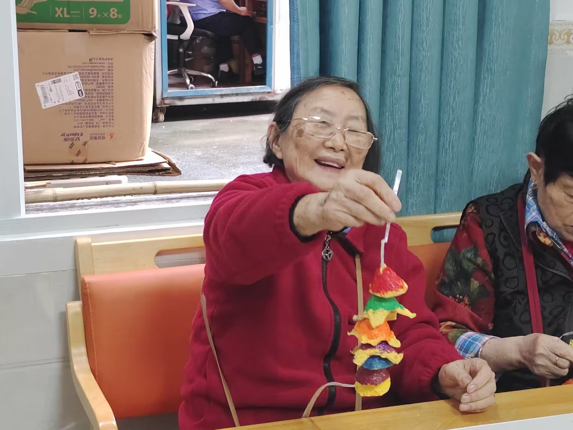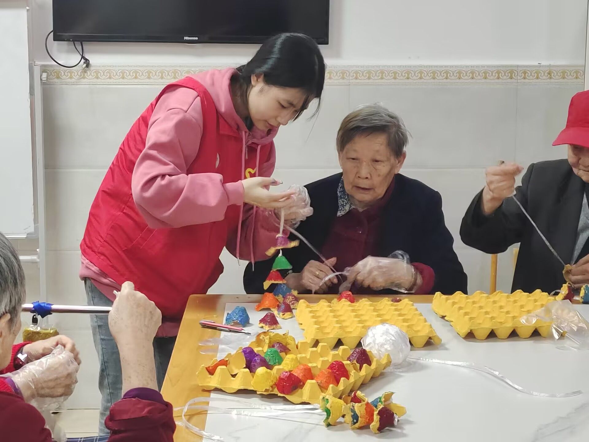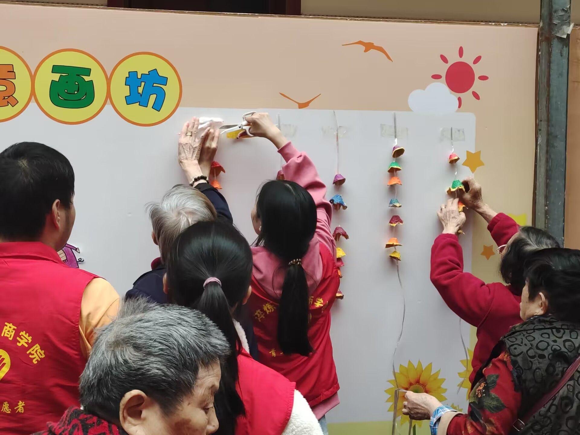 “以手造物,以物寄情”。手作物件之所以动人,在于赋予了手的温度和人的情怀,志愿者带领爷爷奶奶们做起了手工创作,邀请爷爷奶奶们共赴一场时光之约,与志愿者们碰撞内心,同时做手工的方式也可以培养爷爷奶奶们的动手能力,增强大脑的活跃程度。在一片其乐融融的氛围中,志愿者们将与爷爷奶奶们共同完成的作品挂上了展示栏,大家成就感满满。