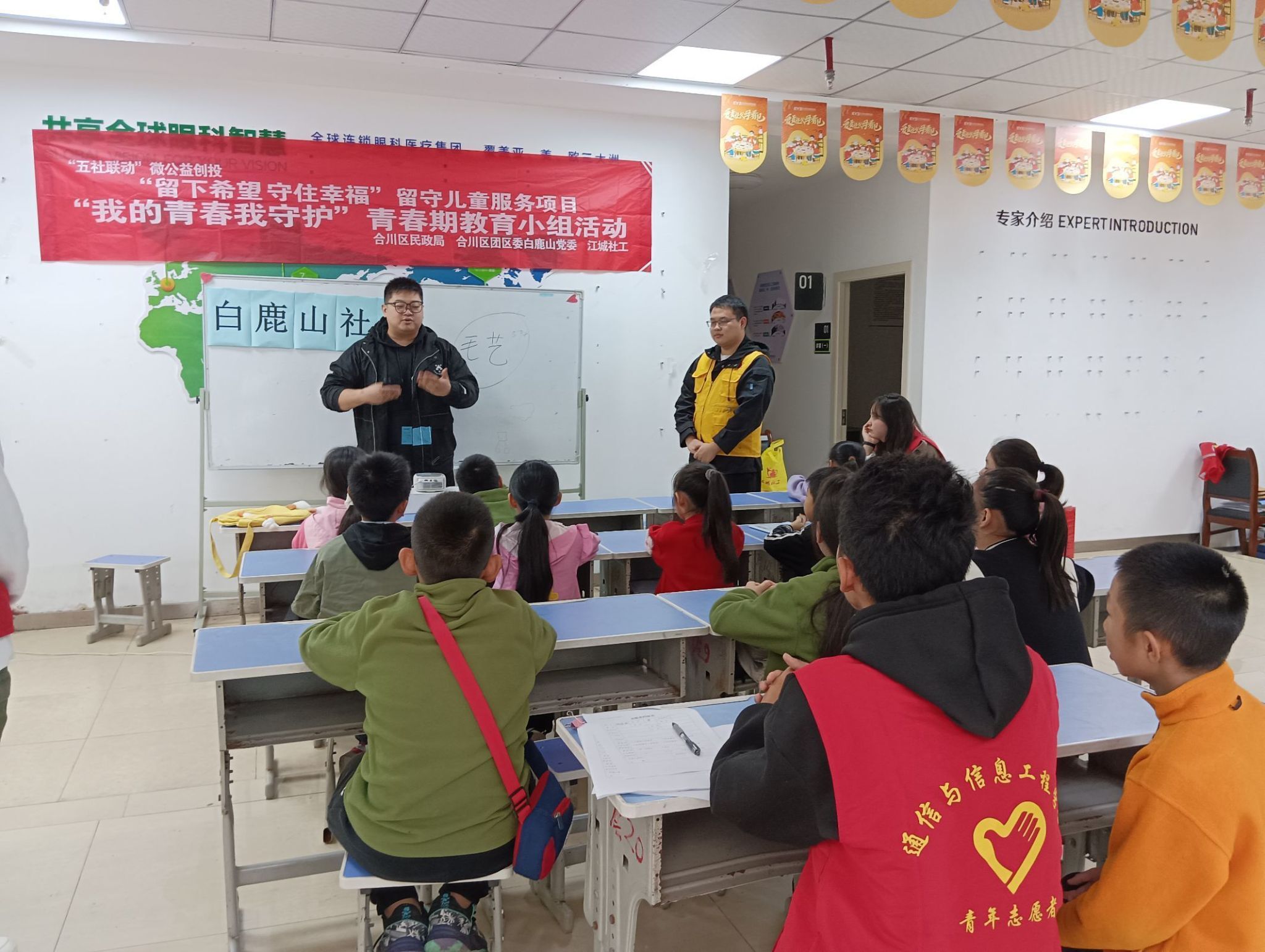 青春期是每个人成长道路上的重要阶段,充满挑战和机遇,在这人生的转折点,青春期的教育显得尤为重要。为帮助青少年儿童更好的应对身心变化,塑造健康人格,2023年10月28日,通信与信息工程学院青年志愿者协会“白鹿课堂”支教社区留守儿童志愿服务专项支队前往合川区白鹿山社区青少年之家活动室开展“留下希望守住幸福”留守儿童服务项目——“我的青春我守护”青春期教育小组活动。