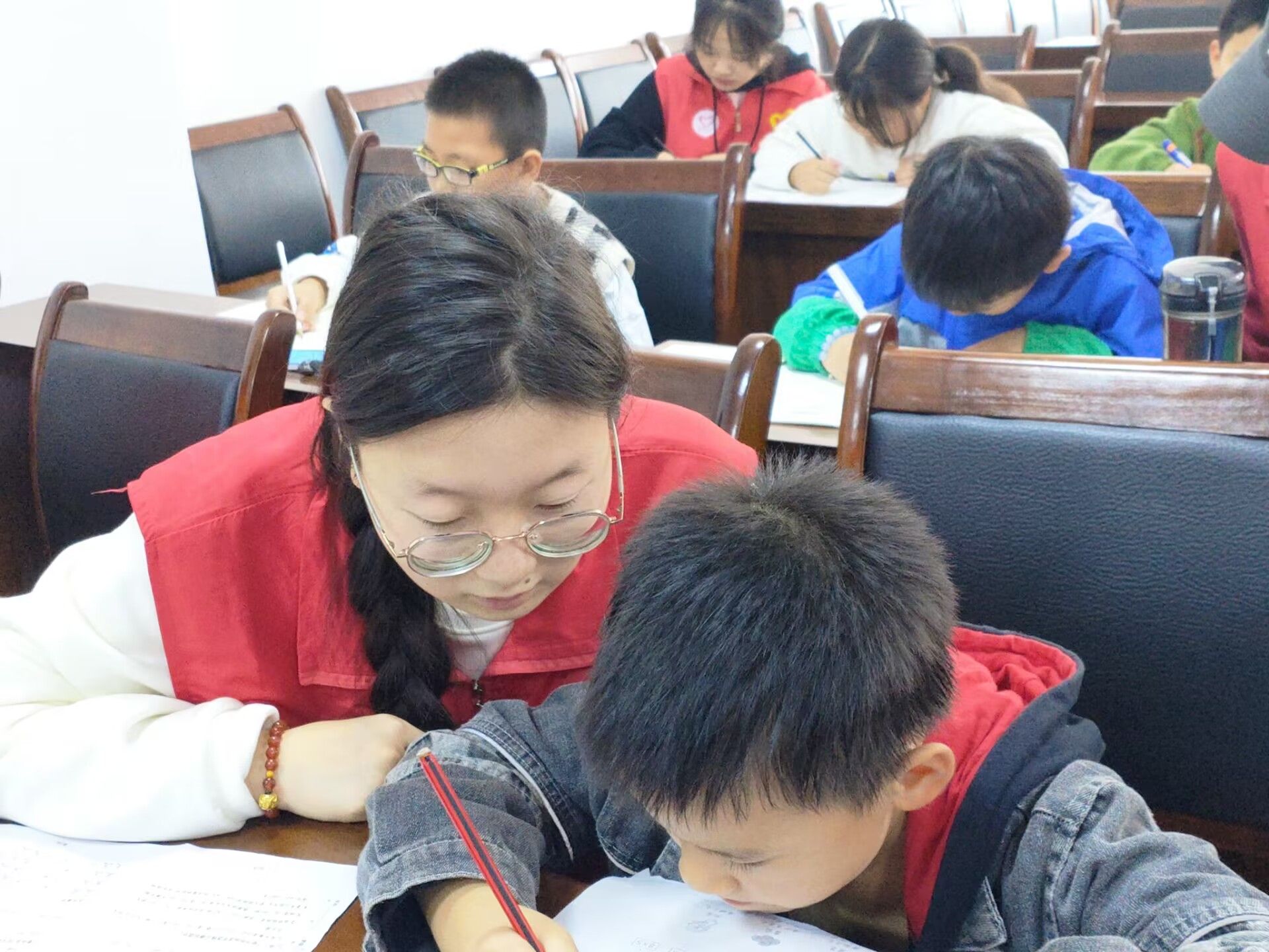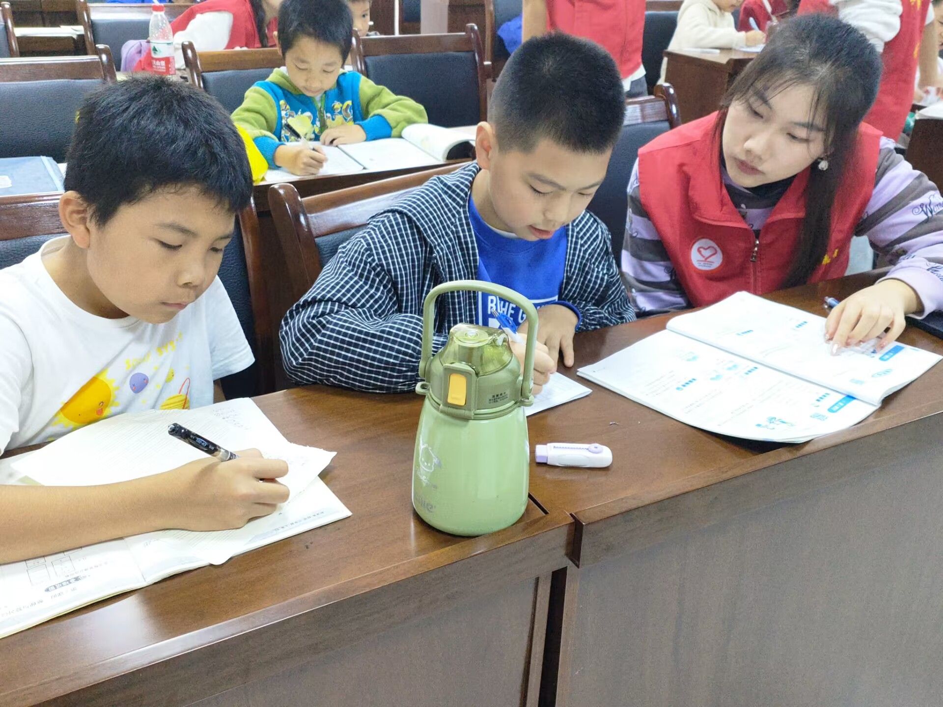 在课堂上,孩子们坐在一起,认真的写着作业,志愿者们从旁辅导,一边维持秩序,一边为孩子们答疑解惑。对于小朋友们写作业过程中出现的问题,志愿者们用浅显易懂的方式为小朋友们讲解清楚,耐心解答孩子们提出的各种问题。孩子们写完作业后,志愿者们热心地为小朋友们检查作业,包括语文、数学、英语等课程,鼓励孩子们通过对解题方法的掌握,尽力做到自己攻克难题,更针对假期作业中的疑难点问题,给小朋友们逐一做出讲解,细致地辅导让孩子们感受到了浓浓的关爱。