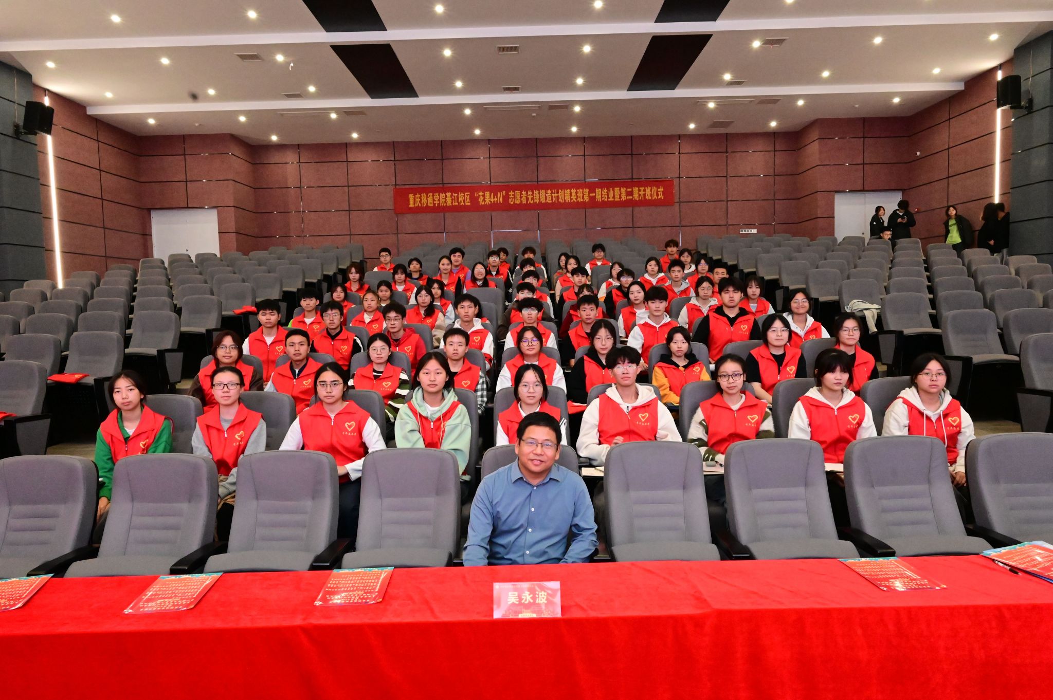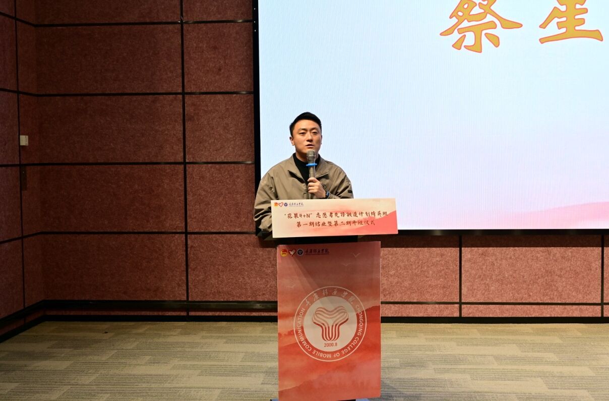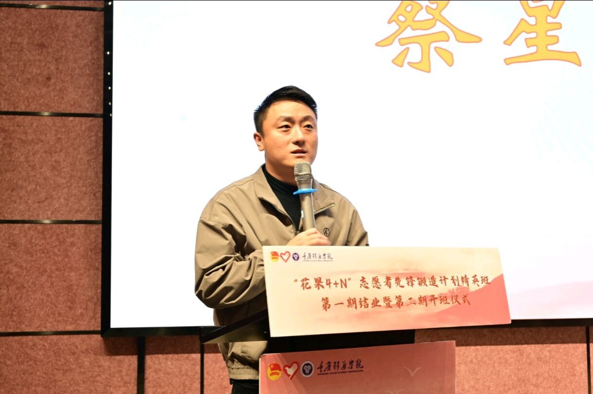 表彰先进争先锋,共赴美好在一“綦”。校团委副书记蔡星宇老师为“花果4+N”志愿者先锋锻造计划精英班第一期45名学员颁发结业证书并与同学们进行合影留念,为“花果4+N”志愿者先锋锻造计划精英班第一期画上完满的句号。回顾过去,展望未来。“花果4+N”志愿者先锋锻造计划精英班第一期学员代表江文豪同学在分享中提到“我选择加入精英班是想在志愿服务这条道路上走得再远一点。”他表示希望在今后志愿服务成长的路上,认识到更多志同道合的志愿者小伙伴们,通过加强对校园志愿服务的了解与认识,发挥志愿骨干的领导作用,带动移通志愿服务组织发展,扩大志愿服务影响范围,让“移通红”成为移通学子的一道光!