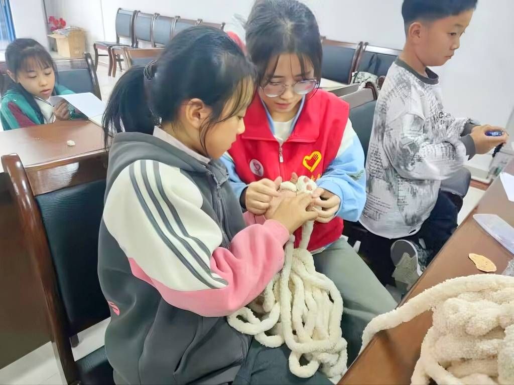 送一条围巾,温暖一个冬天。在01团支部班长带着同学们围坐在一起,开展着织围巾的小活动。有的同学一边看着视频学习一边织着围巾,有的同学则发挥着心灵手巧的特长,小朋友们手拿一团线一双织针,说说笑笑地编织着手里的“爱心牌”围巾。从一定程度上也锻炼了小朋友们的动手能力,丰富了小朋友们的课后生活。