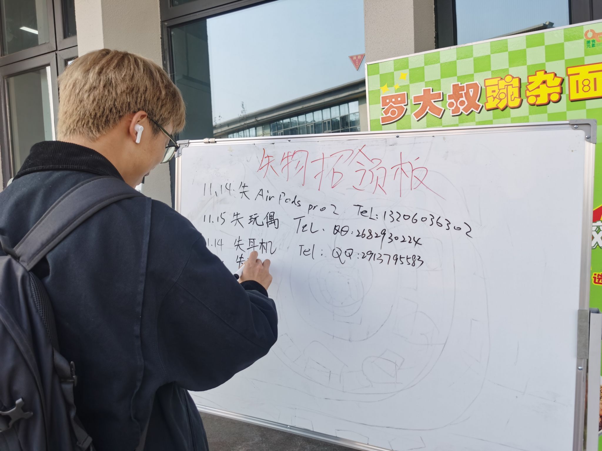 为了帮助同学们找回自己丢失的物品,提高同学们对物品的保管意识和拾金不昧的精神,造就美好和谐的完满校园。我们此次选用一种特殊的工具帮助我们来实现这一目的,它就是双面白板。双面白板,顾名思义,它具有两个表面,这种设备以其独特的特性,赋予了我们一种全新的活动方式,让我们看到了“双面人生”的可能性。2023年11月15日至19日,送“我”回家·失物招领志愿服务专项支队与大数据学院宣传调研部在各食堂门口,共同联合举办了一场独具特色的“双面白板的双面人生”活动。此次活动旨在通过设立特别的白板,帮助同学们找回丢失的物品,并增加同学们之间的互动,丰富校园生活。