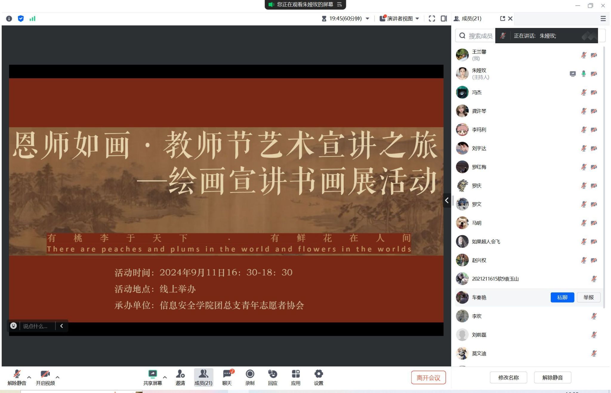 绘画,是一种独特的艺术表达形式。它是一种无声的语言,以色彩和线条为音符,奏响情感与思想的乐章。而此次绘画与教师节相结合,又会碰撞出怎样的火花呢?绘画中的每一笔一划,都凝聚着参与者对老师深深的爱戴。活动中,宣讲者对绘画形式娓娓道来,展示了中华文明突出的连续性、创新性、统一性、和平性和包容性。