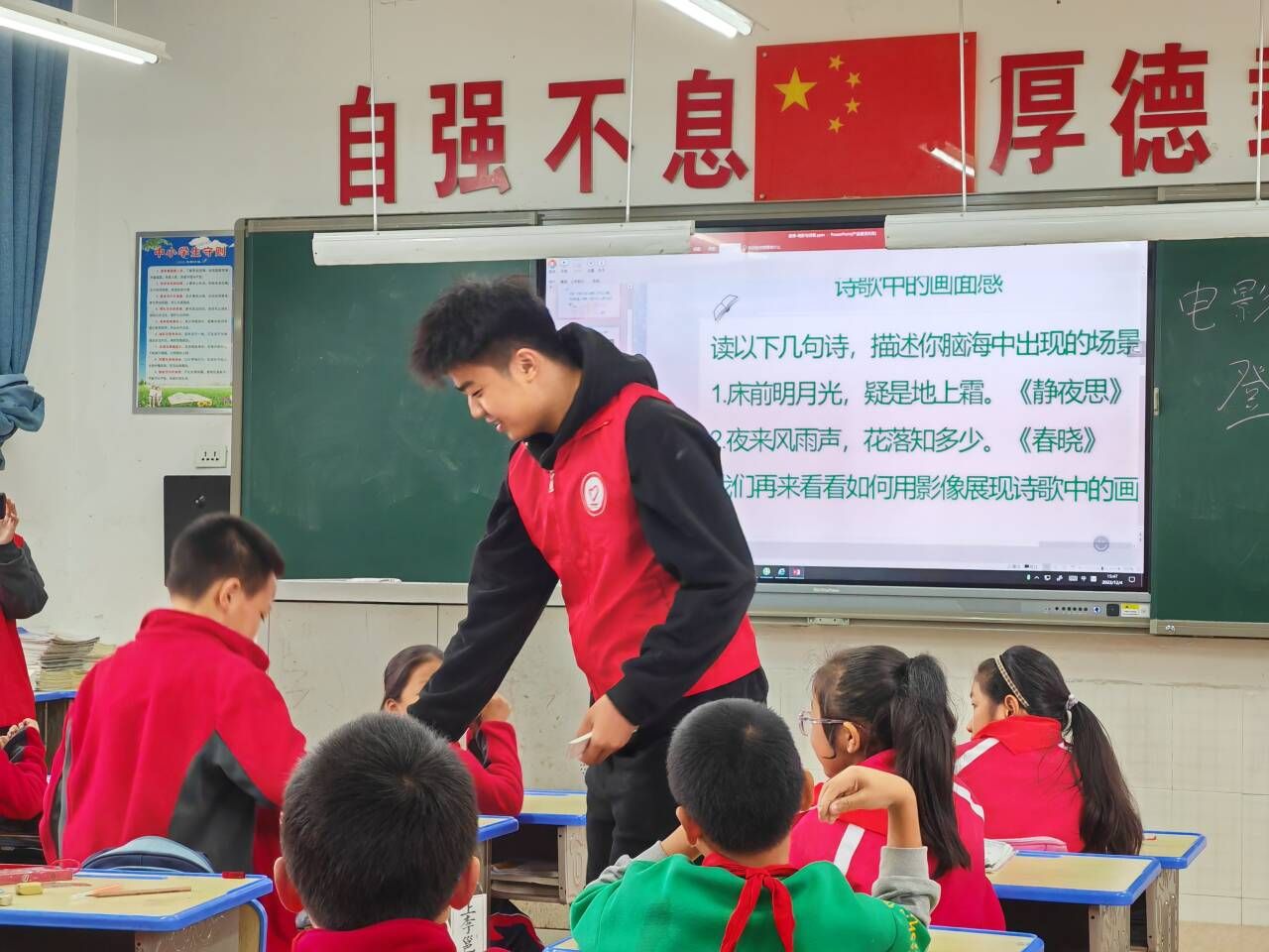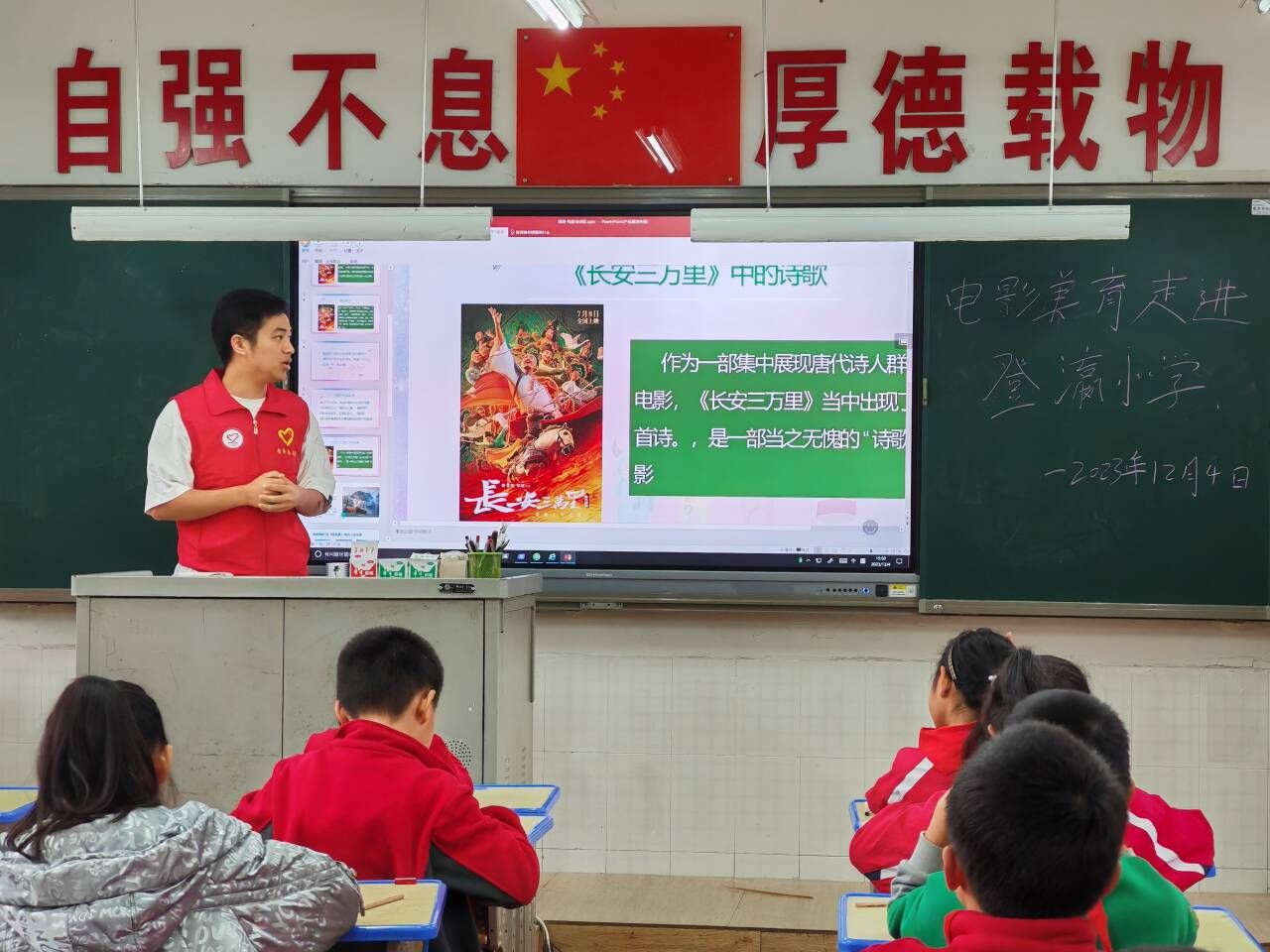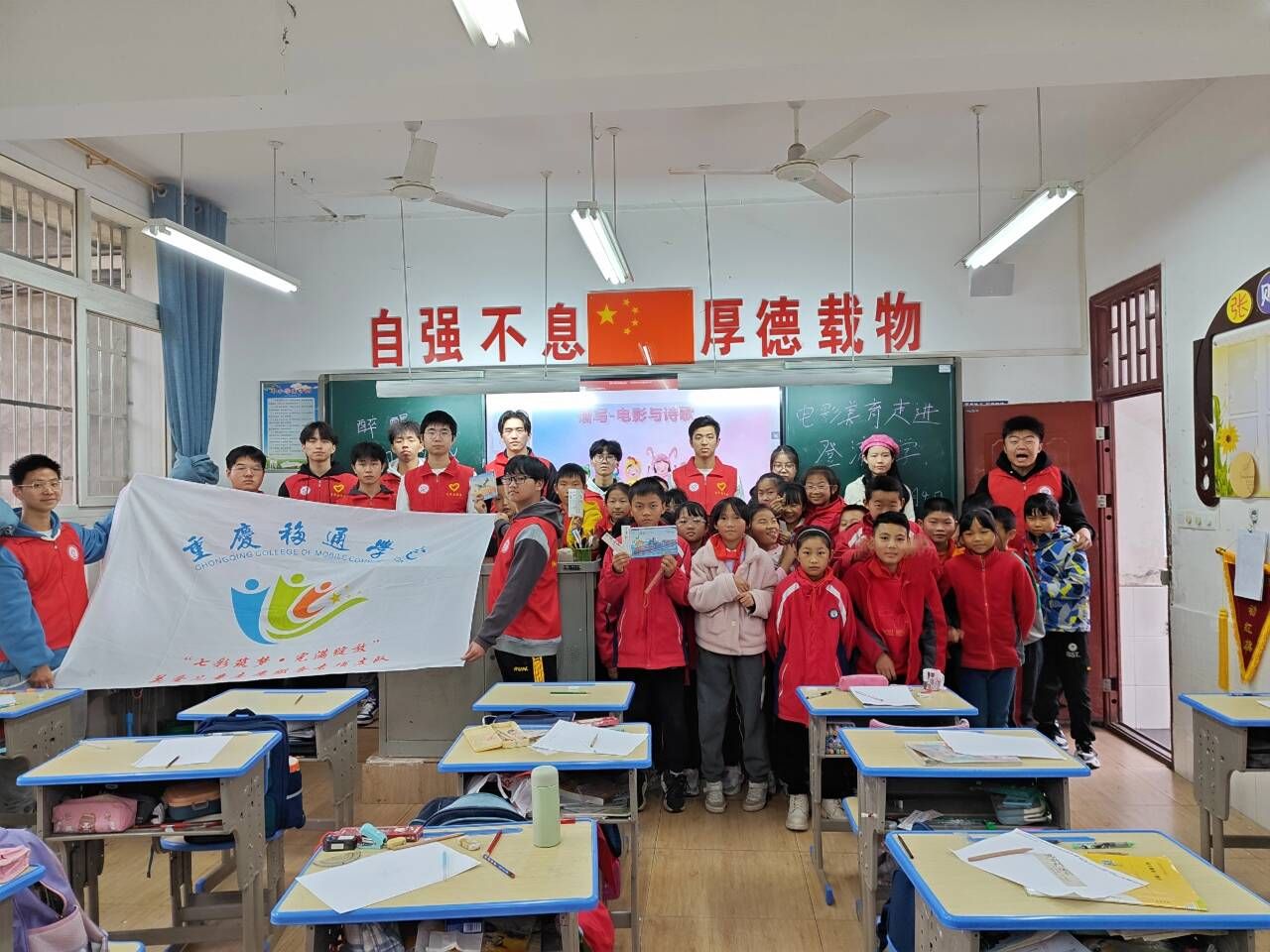 电影,以其生动的画面和引人人胜的故事,为孩子们展现了一个更广阔的世界。为让孩子们在轻松愉快的氛围中学习知识,让其更好地理解和尊重多元文化。2023年12月4日,重庆移通淬炼商学院青年志愿者协会“七彩筑梦·完满绽放”关爱儿童志愿服务专项支队携电影协会在重庆市綦江区登瀛小学开展了“诗歌与电影”电影美育活动。