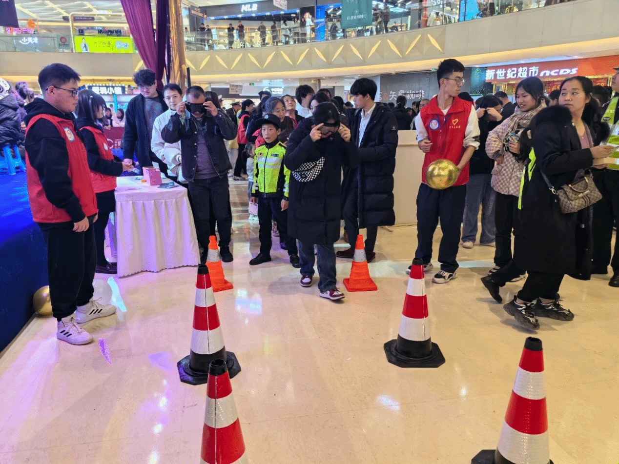 现场互动体验区一共设置了四个体验区域。在交通标识连连看小游戏中,参与者需正确说出交通标志卡上内容,可以加深参与者对交通标志的印象,考察参与者正确辨识交通标志的能力。在酒驾体验知危险小游戏中,参与者佩戴酒驾眼镜按“8”字形通过路障,切身体会饮酒后驾车的高风险,增强群众“喝酒不开车,开车不喝酒”的良好交通安全意识。在知识答题与互动中,参与者回答交通知识方面的问题,在游戏中趣味学习交通安全知识,增强自身安全意识,熟悉交通法规,形成文明出行的好习惯。