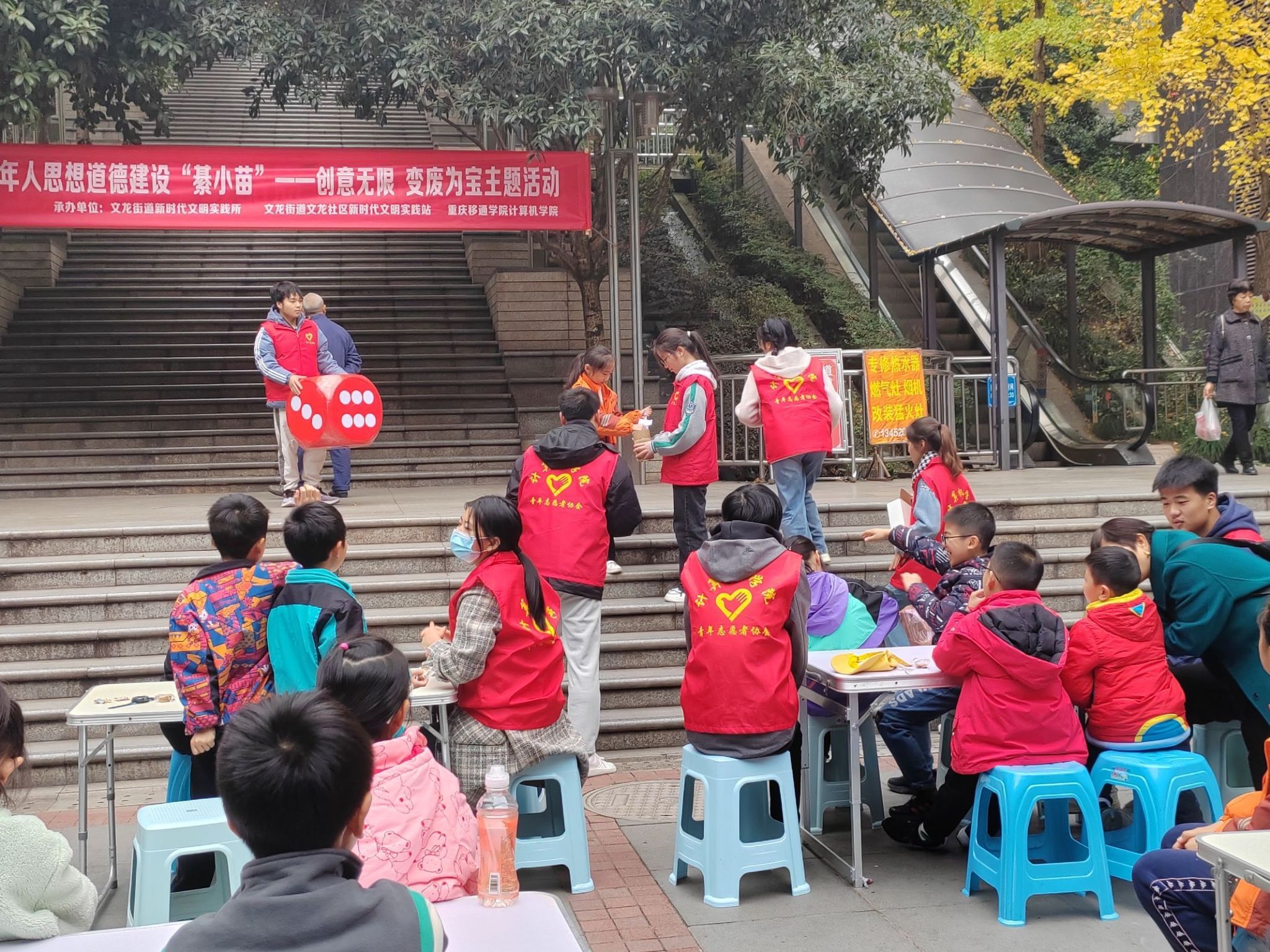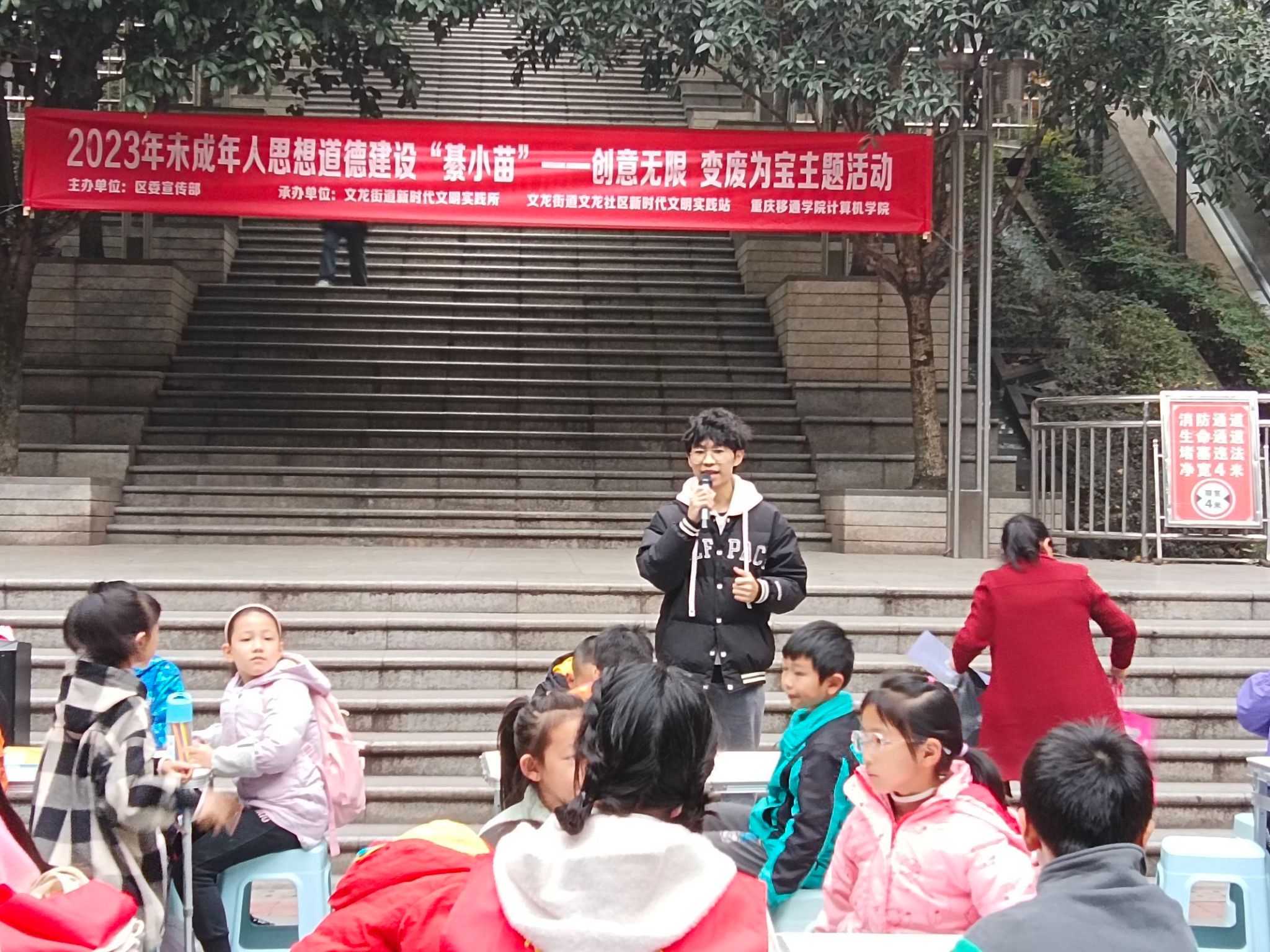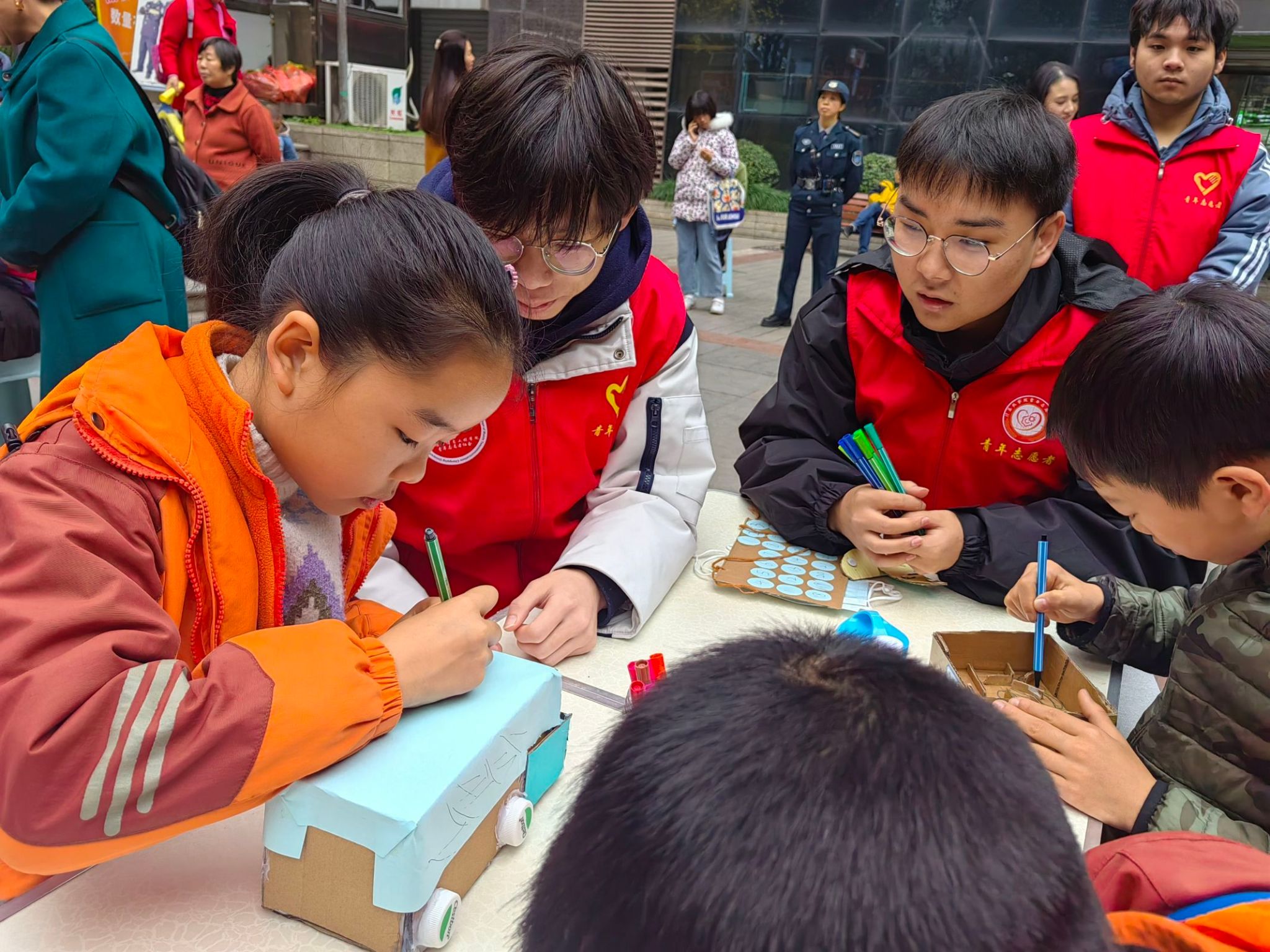都说:垃圾是放错了地方的宝贝。一点巧思、一份创意、一些实践就能给那些随处可见、平凡无奇的废品赋予新的生命。2023年12月11日,通信与信息工程学院“绿色指尖”低碳节能志愿服务专项支队的志愿者们前往文龙社区对社区居民小学生开展废品回收、废物利用宣讲及手工活动。此次活动诚邀DIY手工社、书画社社员共同参与,让孩子们体会到艺术的魅力,同时借此次活动让同学们更加注重对于环境的保护。本次活动累计参与人数30余人,活动受益人数200余人。