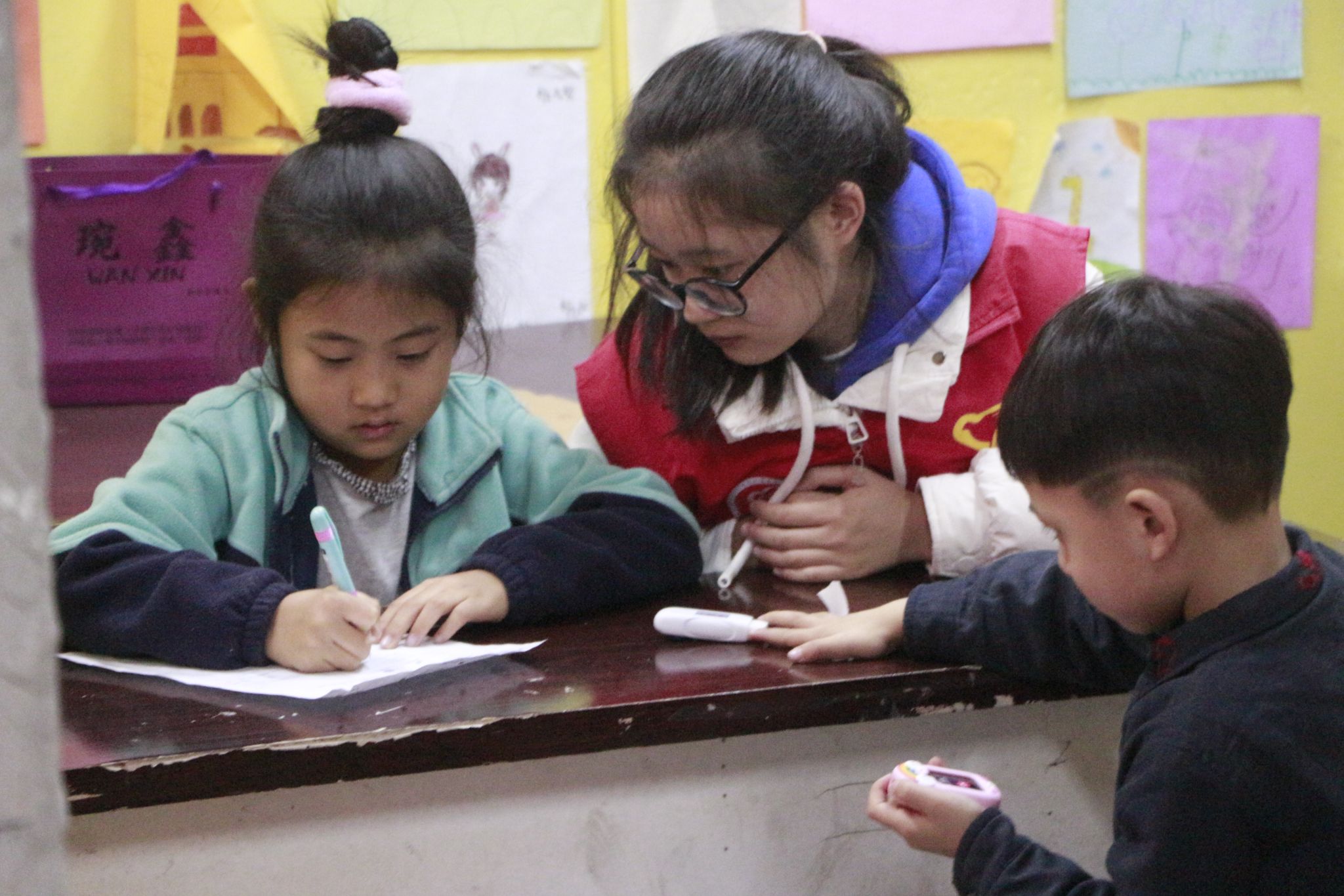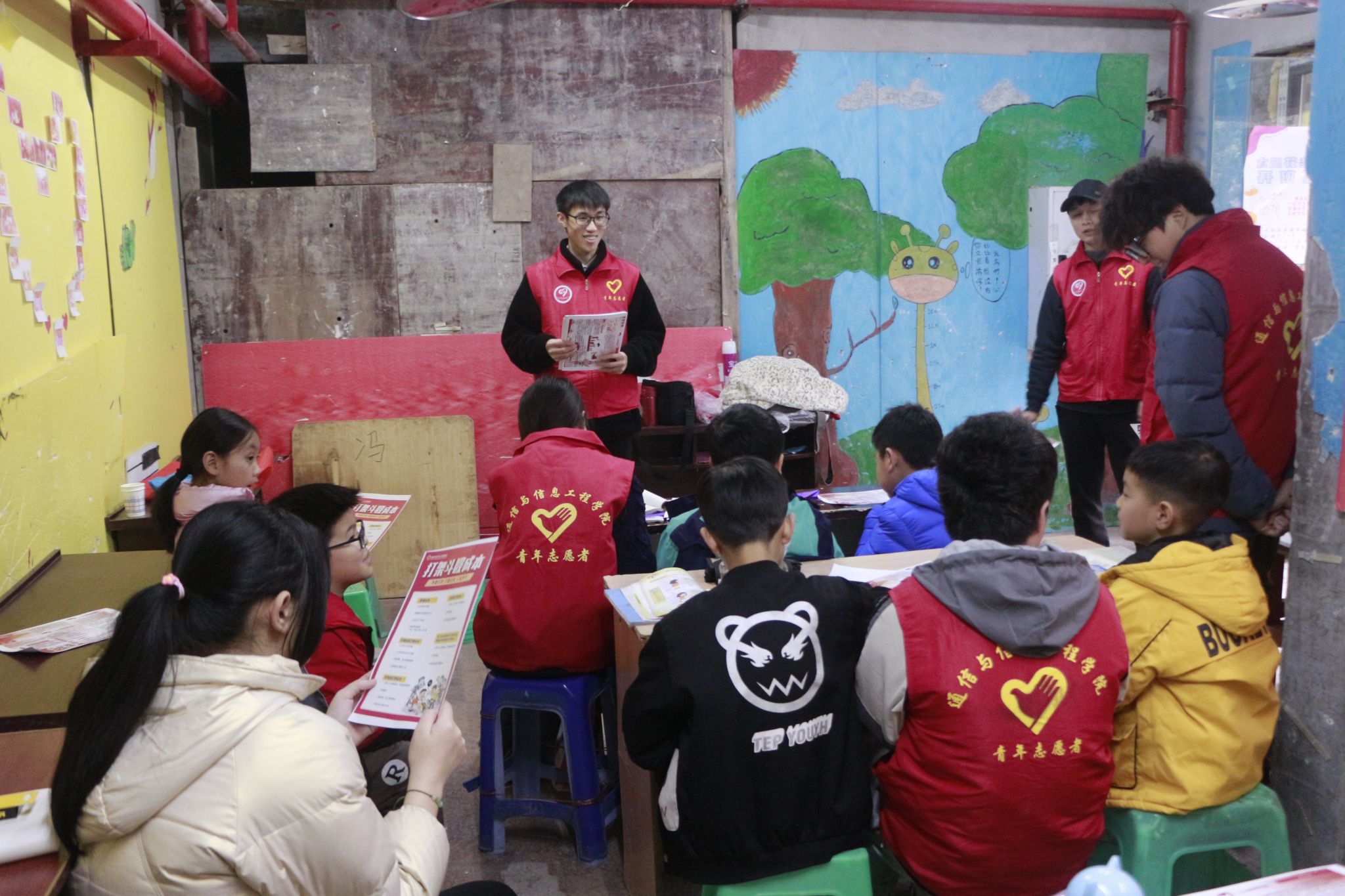 在完成对小朋友的课后作业辅导之后,主题教育正式启动。志愿者们以详尽的讲解和互动问答的方式,向小朋友们介绍关于“一二·九”运动的详细过程,并引导他们以手抄报绘画的形式来表达对这段历史的感悟和理解。此举旨在引领小朋友们更深入地学习和了解“一二·九”运动,培养其爱国意识。