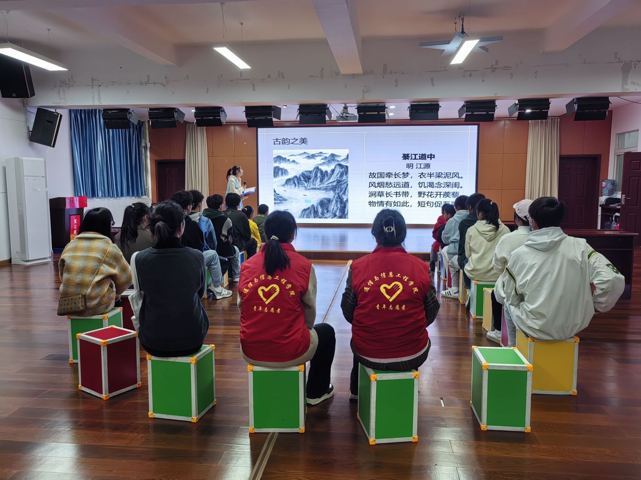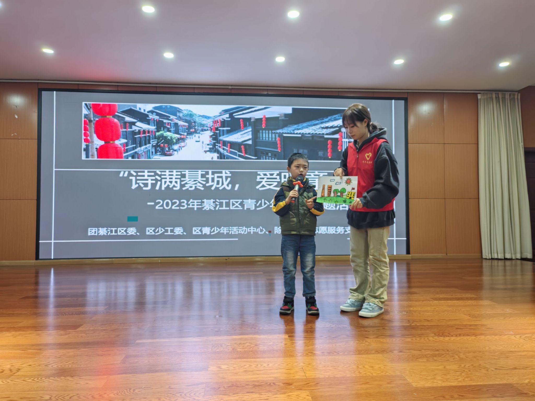 五千年文化,三千年诗韵。文人手中卷卷书册、笔下点点文墨,胸中山川丘壑……这是独属于中国人的浪漫。中国是一个诗国,而诗歌更是当地传统文化的重要载体之以其独特的抒情方式,高度凝练的语句,集中地反映着社会生活。为了让孩子们了解和认识本地文化,帮助同学们更好地理解自己的文化背景,培养对本地文化的认知和认同感。为此2023年11月18日下午16点,“除尘拾墨”校园图书馆志愿服务专项支队在綦江区青少年活动中心开展“诗满綦城,爱暖童心”诗歌主题活动。支队志愿者经过多方收集,将綦江当地相关的诗歌制作PPT形式,通过生动的讲解,有趣的互动,参与活动的小朋友学在其中,乐在其中。我们相信,通过创造性转化、创新性发展,星星之火终可燎原,无比丰富的綦江诗歌一定能焕发更加璀璨的光彩,而文化传播的种子也会在孩子们的心中生根发芽。