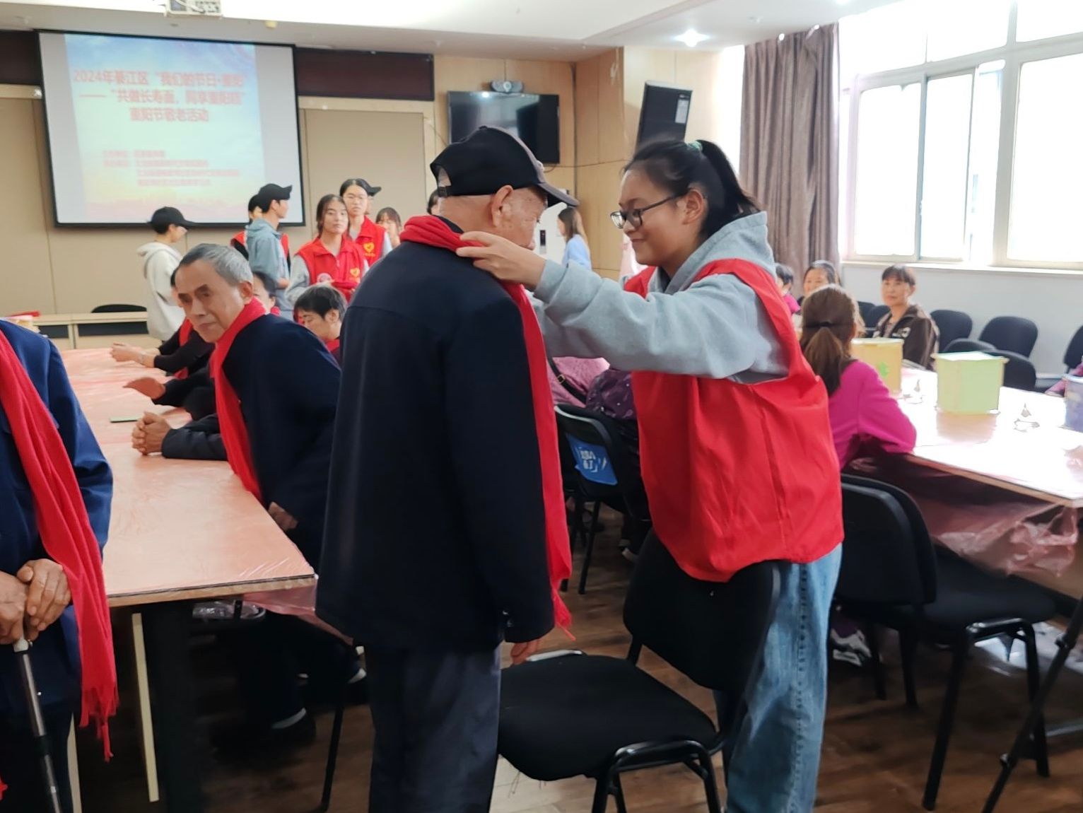 活动的第一项就是由志愿者们为老人献上围巾,在这个美好的日子里,志愿者们用他们的爱心和温暖为老人们献上了围巾。当志愿者们将围巾轻轻地围在老人们的脖子上时,老人们的脸上洋溢着幸福的笑容,那一条条柔软的围巾,不仅为老人们带来了身体上的温暖,更传递着志愿者们对老人们的关爱与尊重。