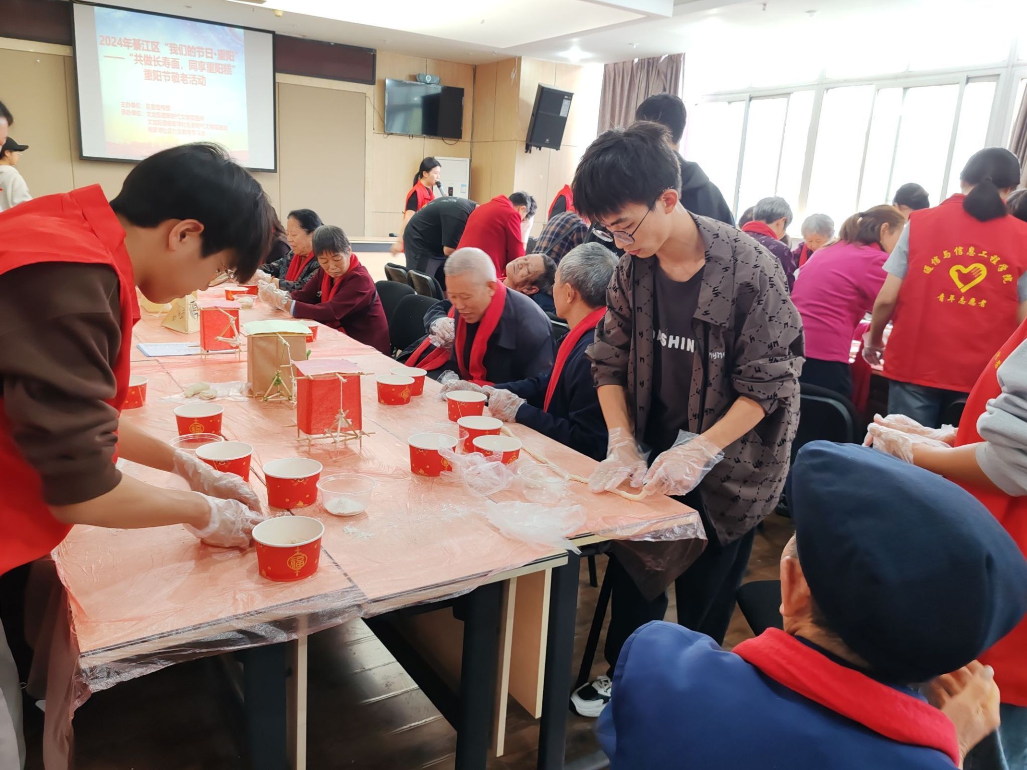 随着社会的发展和人们生活水平的提高,绿色低碳、简约生活的理念日益受到重视。重阳节作为中国传统节日之一,不仅是尊老敬老的象征,同时将绿色低碳的理念融入到了重阳节的传统习俗中,更是传承和弘扬传统文化的重要时刻。在此背景下重庆移通学院綦江校区通信与信息工程学院“绿色指尖”低碳节能志愿服务专项支队携手美食协会、DIY手工社以及杨家湾社区于2024年10月11日下午2:00—3:30在杨家湾社区成功举办了“简约长寿面,朴素重阳糕”重阳节爱老敬老活动。此次活动共计60余人参与,受益人数达120余人。