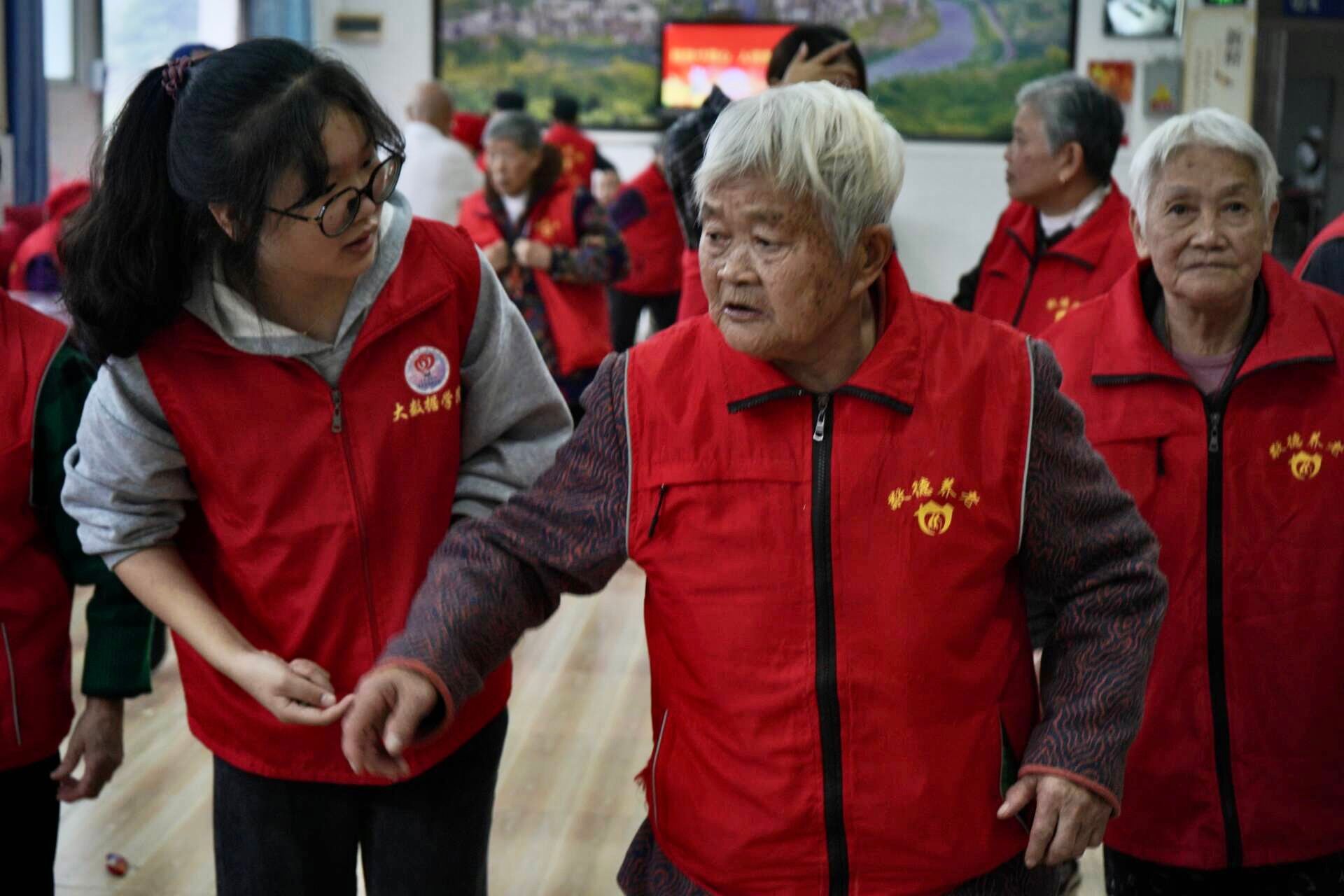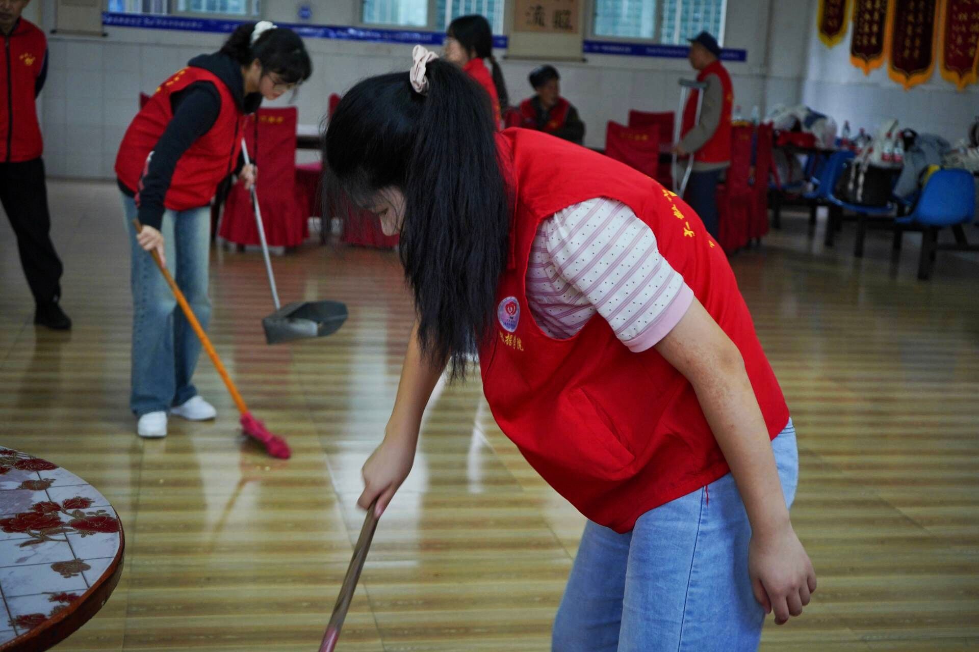 随着老人们与志愿者悠扬歌声的淡去,大数据学院青协精心策划的文艺节目画上了完美的句号。那一刻,空气中弥漫着不舍与温馨,志愿者们与老人们紧紧相依,定格温情瞬间。镜头里,老人们笑容纯真,眼中闪烁着感激与喜悦,有的老人轻轻拍着志愿者的手背,嘴里念叨着“好孩子,谢谢你们”,那份真挚的情感在指尖传递,温暖了每一个人的心房。随着养老院工作人员的轻声引导,老人们缓缓离场,而志愿者们则迅速转换角色,从舞台上的表演者变成了默默无闻的幕后英雄。他们两两一组,或抬桌稳健,或折旗细致,或清扫专注,动作轻柔而专注,不愿打扰到这份难得的宁静。