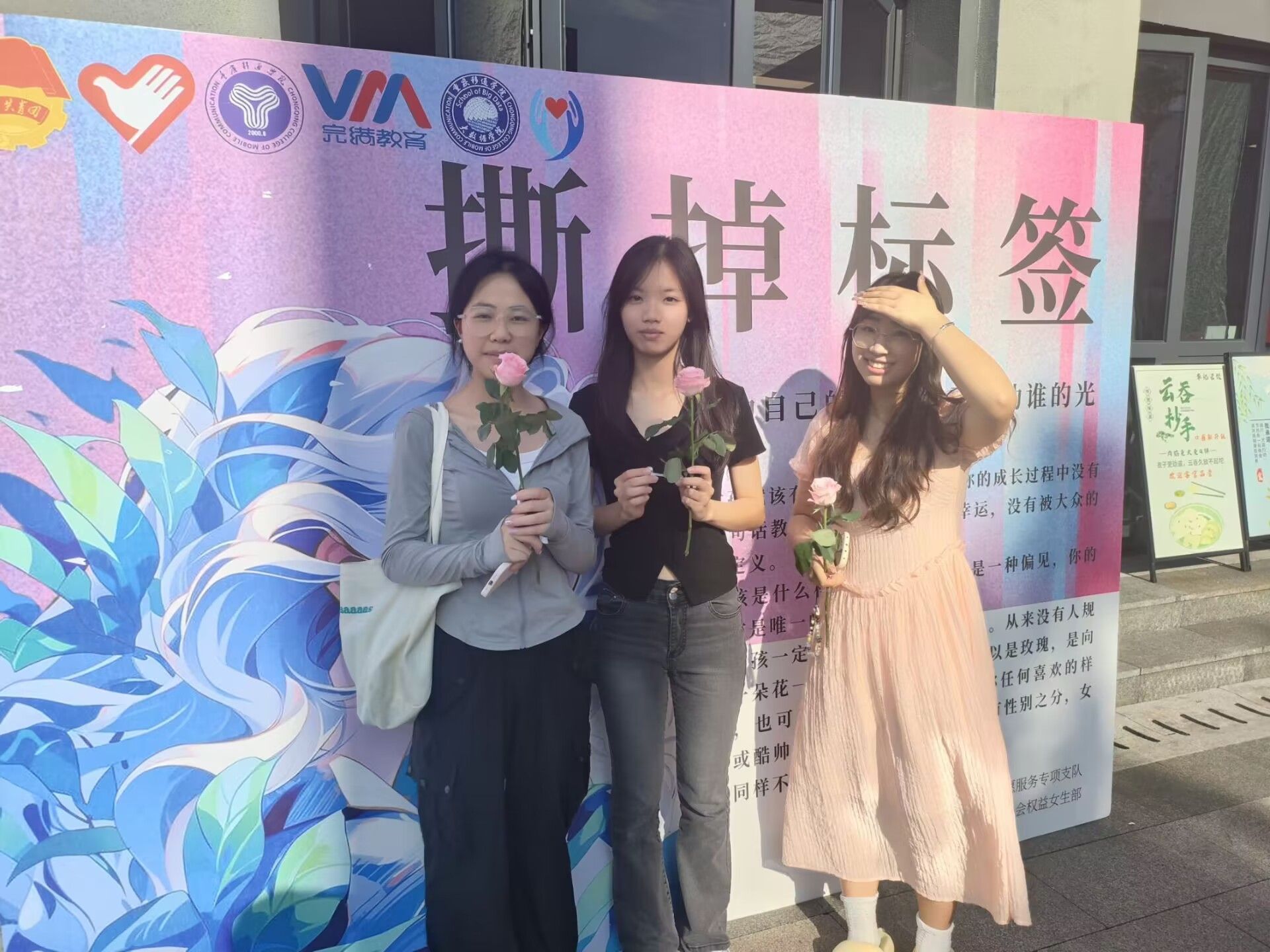 食堂之门洞开,映入眼帘的不仅是香喷喷的饭菜,更有那门口竖立的立牌,其上贴满了这个时代对女性的种种不敬与成见。这些标签,如附骨之蛆,让同学们不禁驻足,有的同学勇敢地伸出手,将这些形形色色的标签撕得粉碎。撕开这些标签,眼前展现的却是一朵朵娇艳欲滴的鲜花,每一朵都象征着女性的美丽与力量,每一朵鲜花上都附着正能量的话语。这样的行为,如磁石引针,吸引着越来越多的人去打破这些束缚,去做那个独一无二的自己,不被任何定义所束缚的自己。