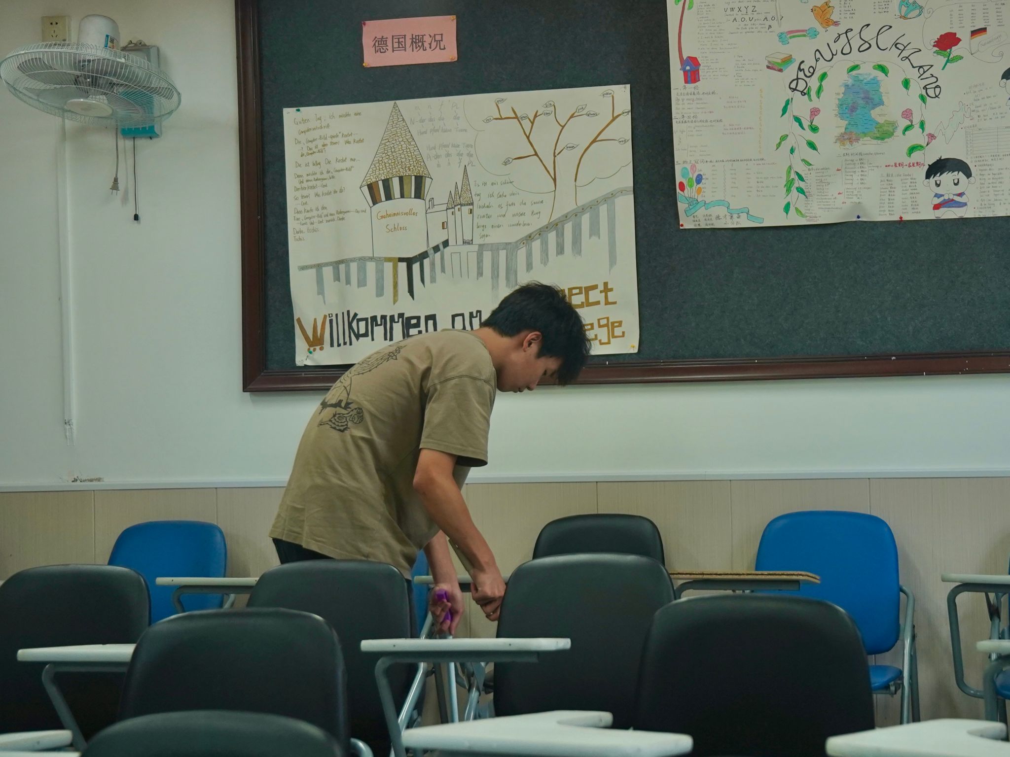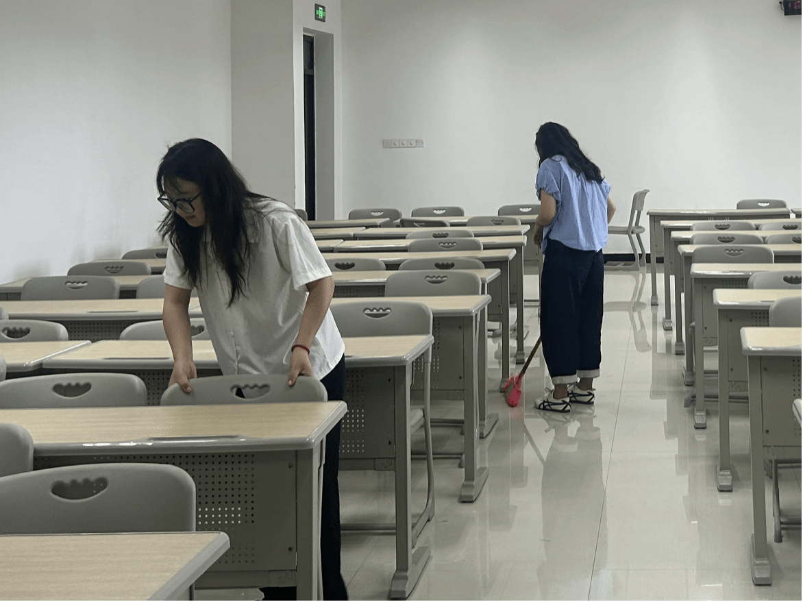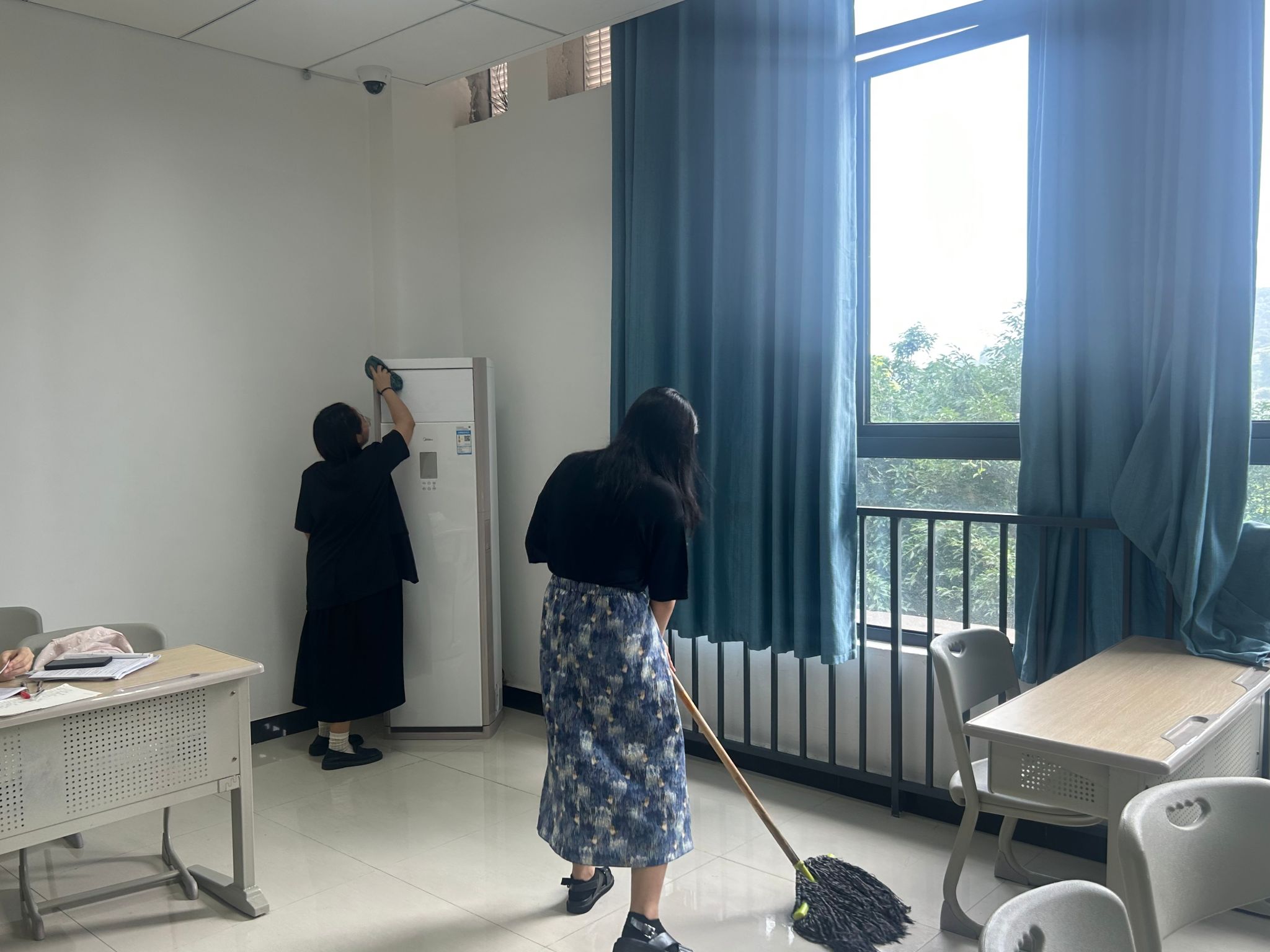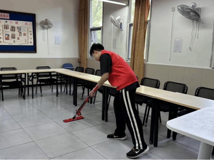 在菩提书院的各个角落,学生党员们忙碌的身影成为了一道亮丽的风景线。他们分工合作,有的拿起扫帚和簸箕,认真地清扫教室的每一个角落;有的拿着拖把,仔细地拖洗地面,确保地面干净整洁;有的站在凳子上,用力擦洗黑板,让黑板焕然一新;还有的攀爬梯子,细心地擦拭窗户。