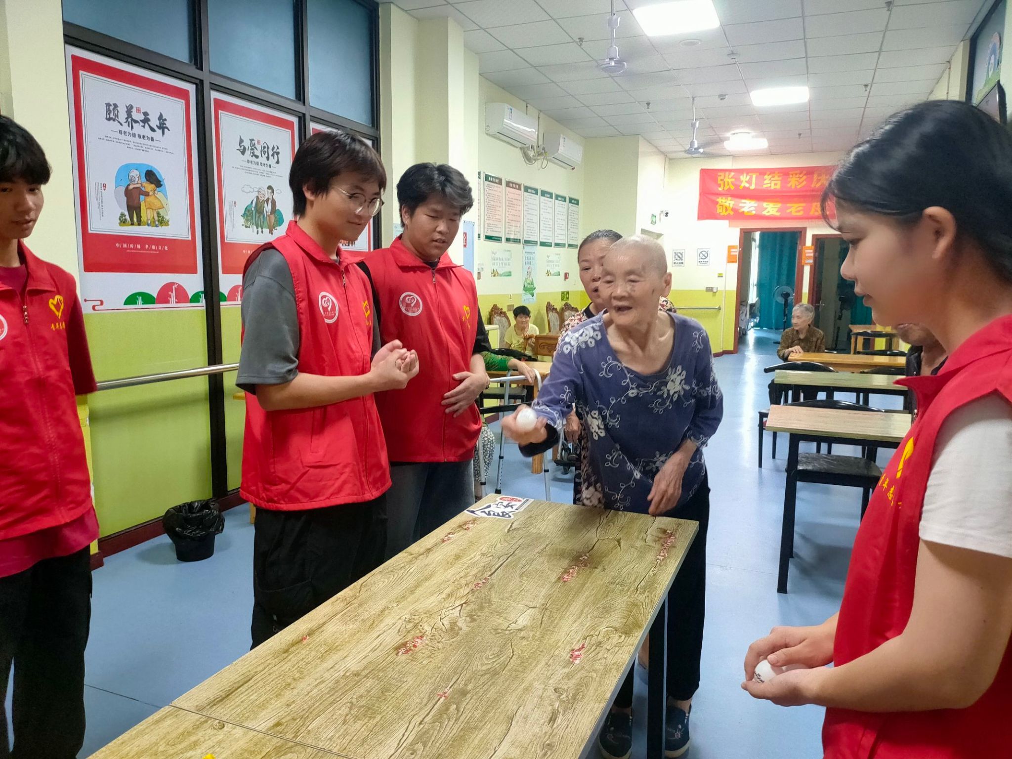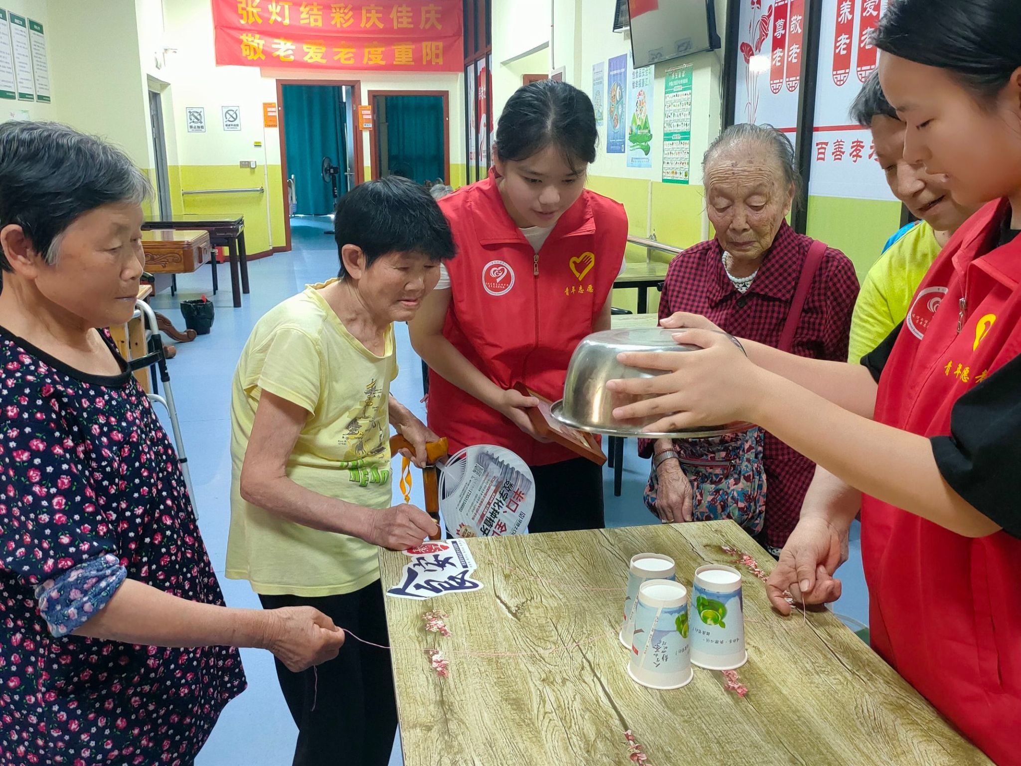 随后,志愿者与老人们共同沉浸在欢乐的游戏时光中。老人们积极参与了摸鱼消消乐、盆子盖纸杯这两个趣味十足的游戏,现场欢声笑语不断,老人们脸上洋溢着幸福快乐的笑容,仿佛回到了充满活力的年轻时光。游戏结束后志愿者为老人送上水果作为游戏奖品。