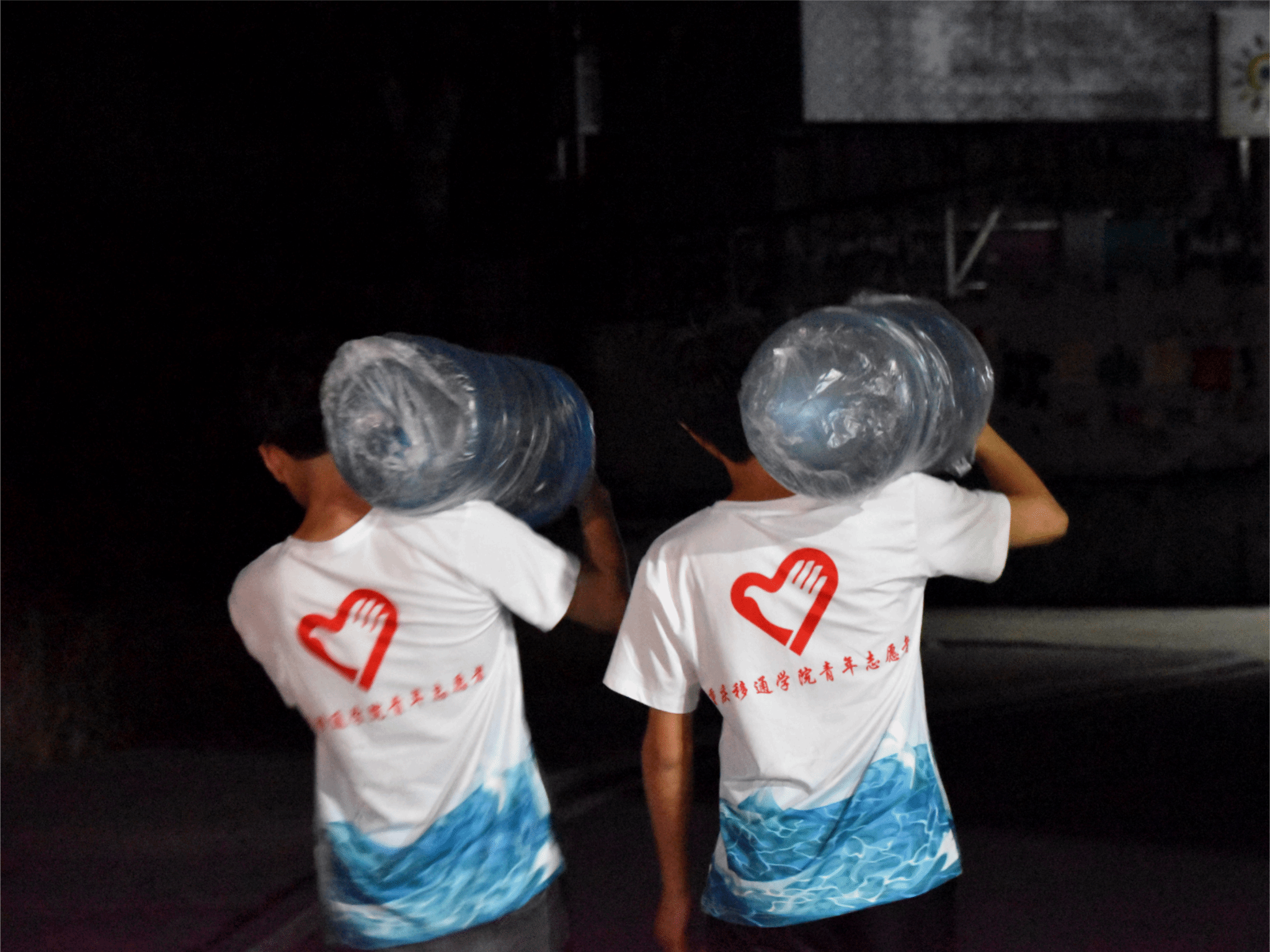 仲夏之夜,石壕街道上充满朴实生活气息,男女老少怡然自乐。志愿者扛着水桶走在乡间小路上,大汗淋漓,但笑容依旧。路灯下志愿者的背影显得格外高大。