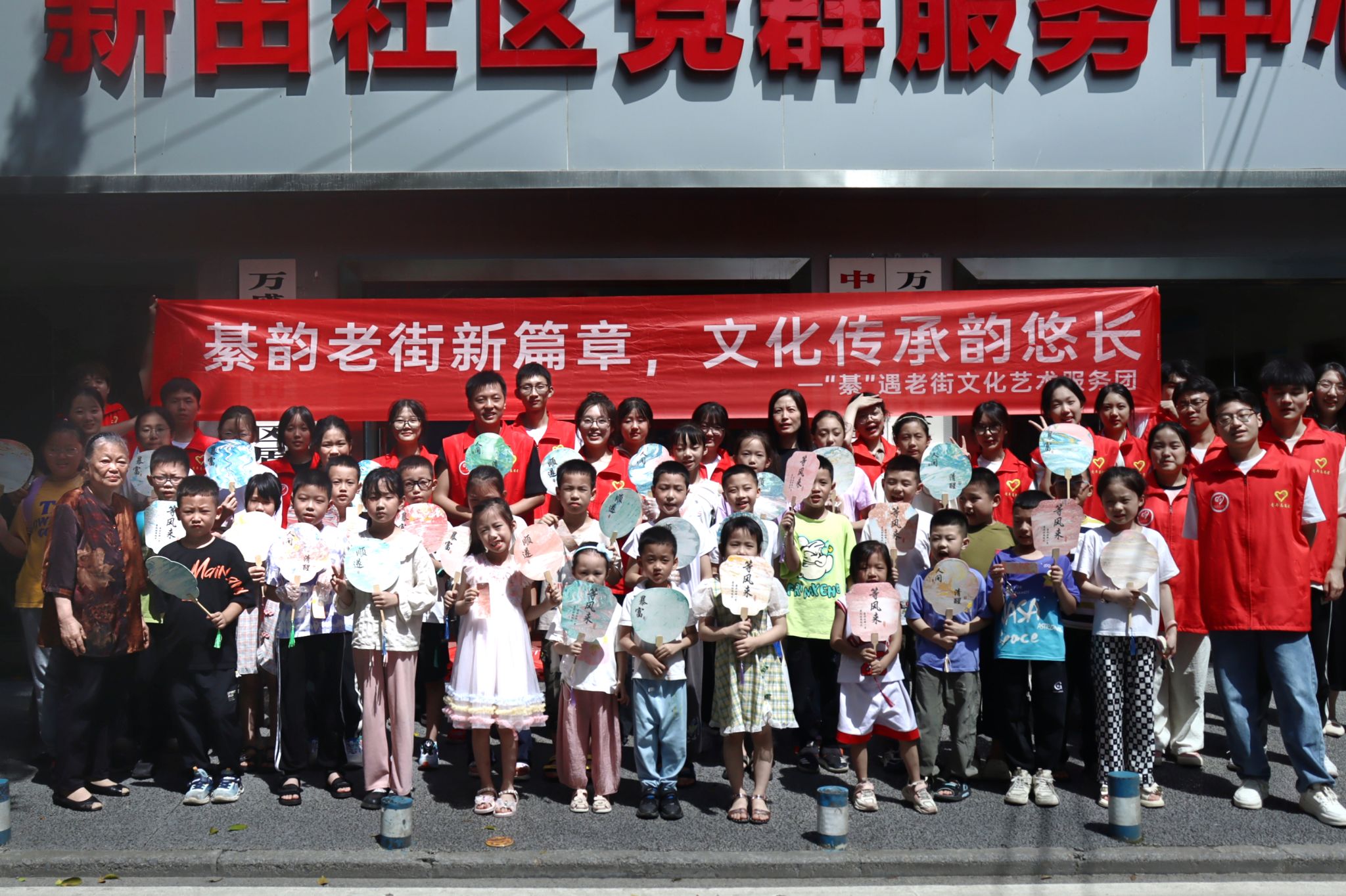 志愿团队的第一站来到了万盛街道新田社区,这个毗邻老街的社区处处充满着历史的气息。在社区团支部书记的带领下,队员们认领了本次实践活动的第一个“任务”——在社区“青少年之家”教授小朋友们制作漆扇。