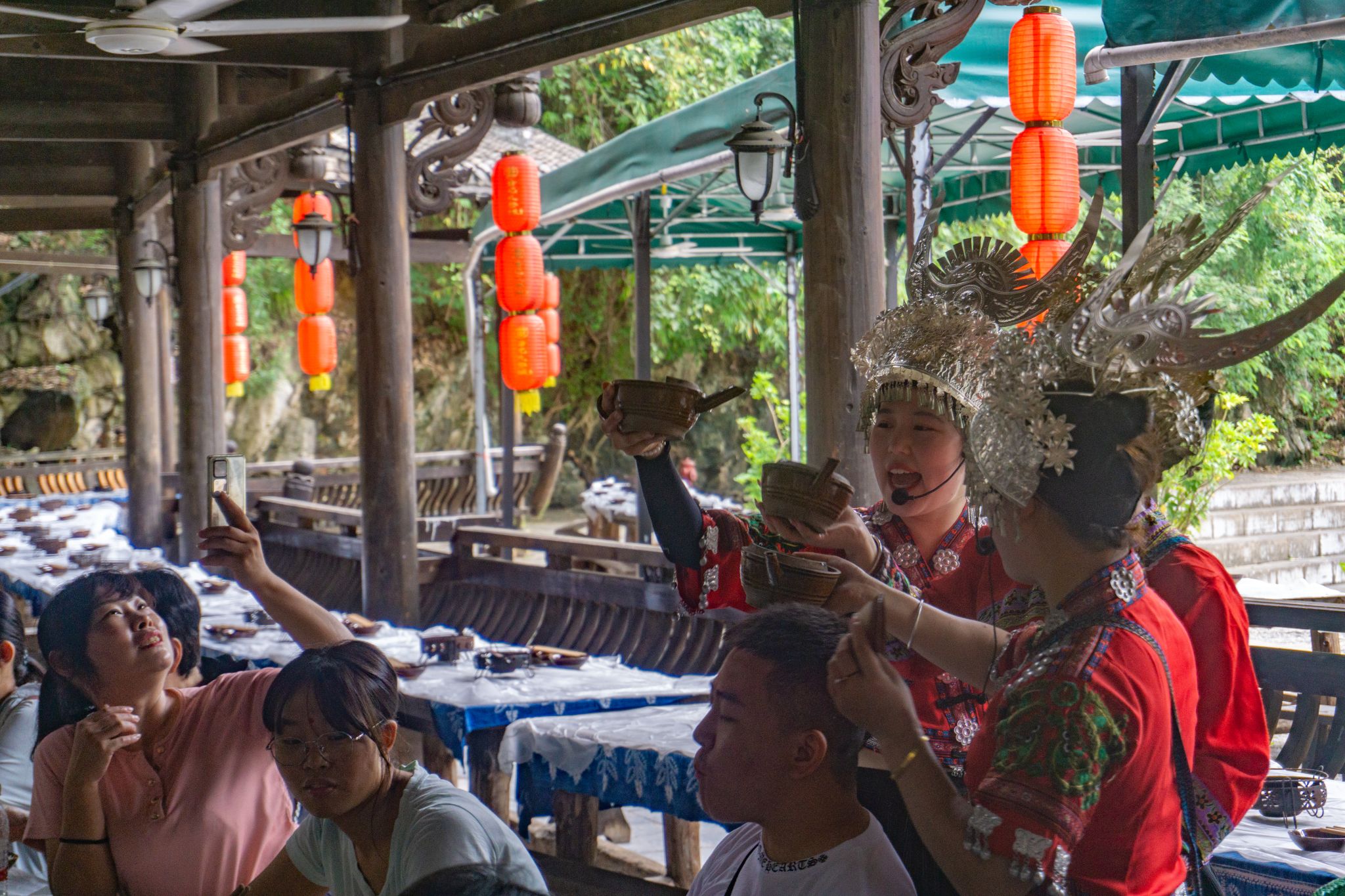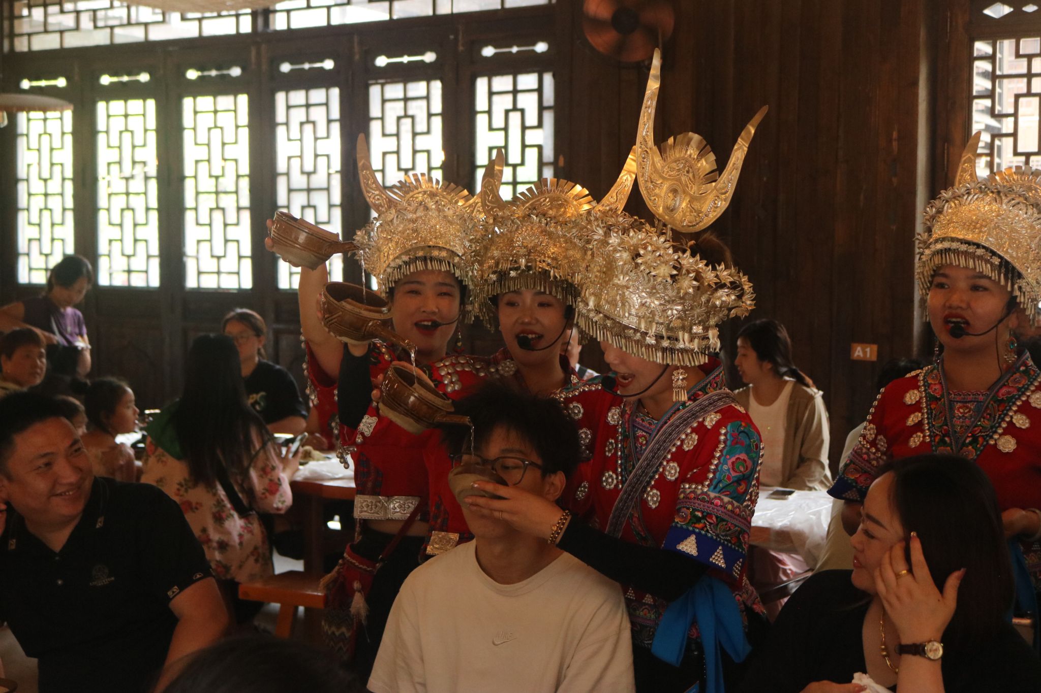 城门启,拦门迎宾酒香溢,苗族热忱如火炽。以酒为媒,表达苗族人民对客人的热烈欢迎和美好祝愿。随后团队成员步入长桌宴盛景,长桌宴是苗族人民待客的最高礼遇,几十张长桌一字排开,桌上摆满了各式各样的苗族美食,如酸汤鱼、苗家腊肉、糯米饭等。团队成员围坐一堂,感受着苗族人民的淳朴与热情。品尝着这些地道的苗族菜肴,每一口都是对苗族淳朴民风与热情好客的最佳诠释。