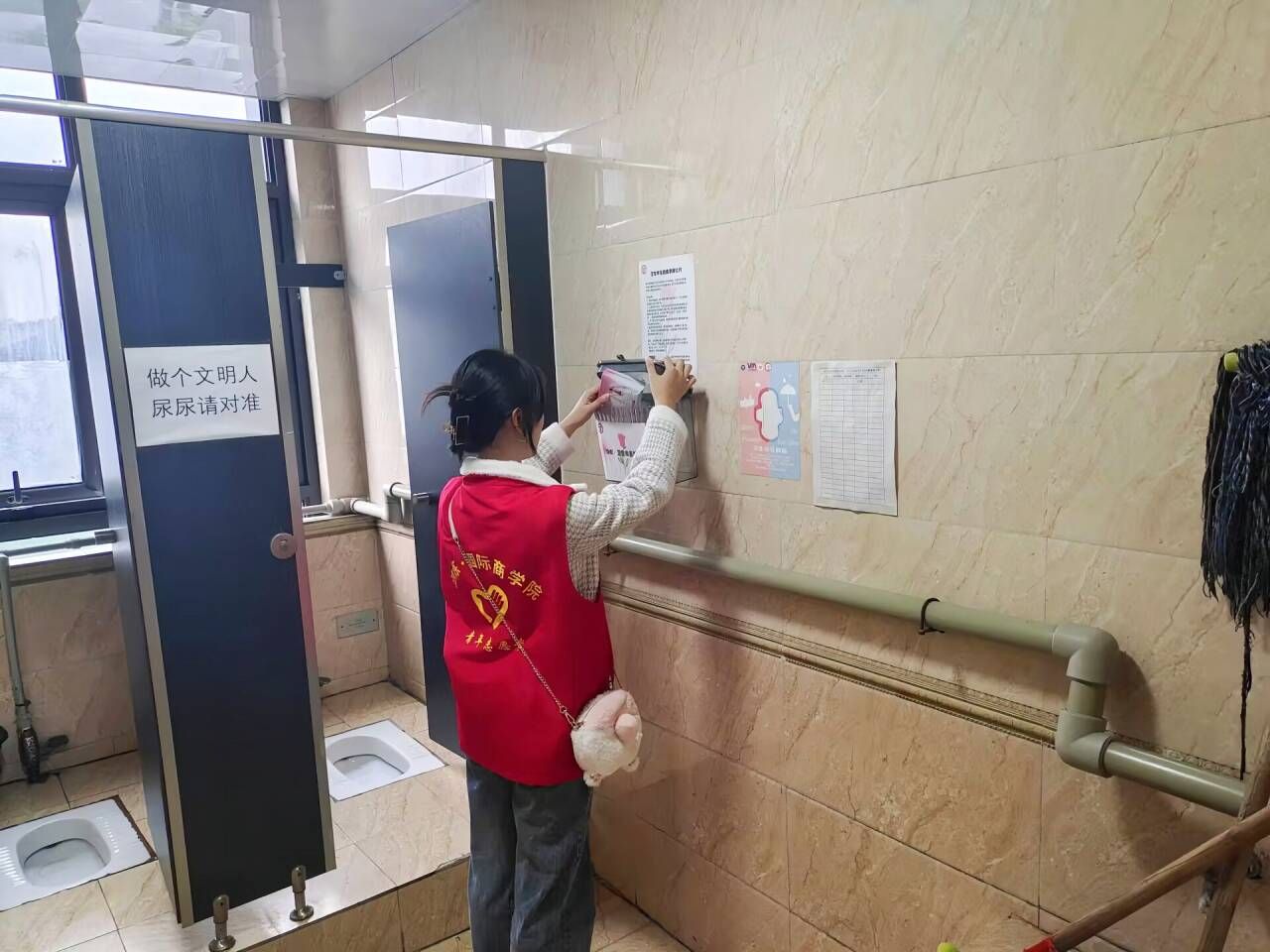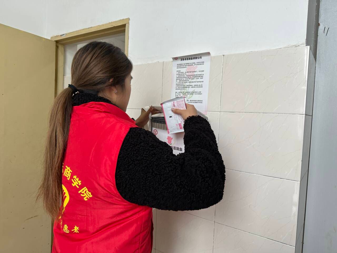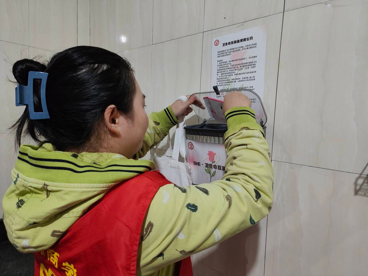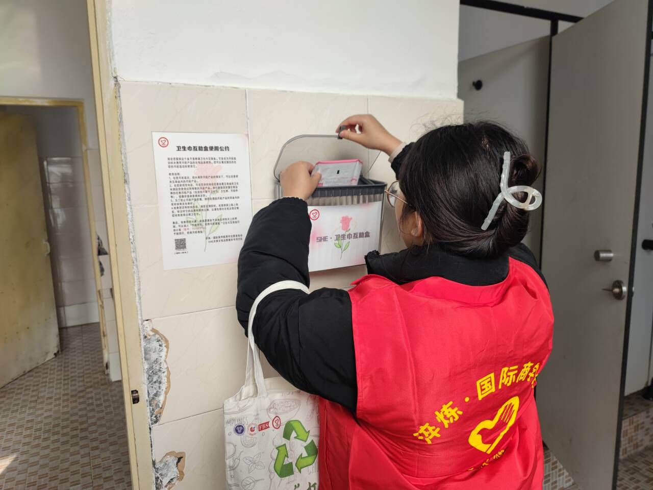寒风瑟瑟,送予温暖。在提前准备下,志愿者们两两分组对南校区所有教学楼女厕所进行卫生巾互助盒地打扫及补充。