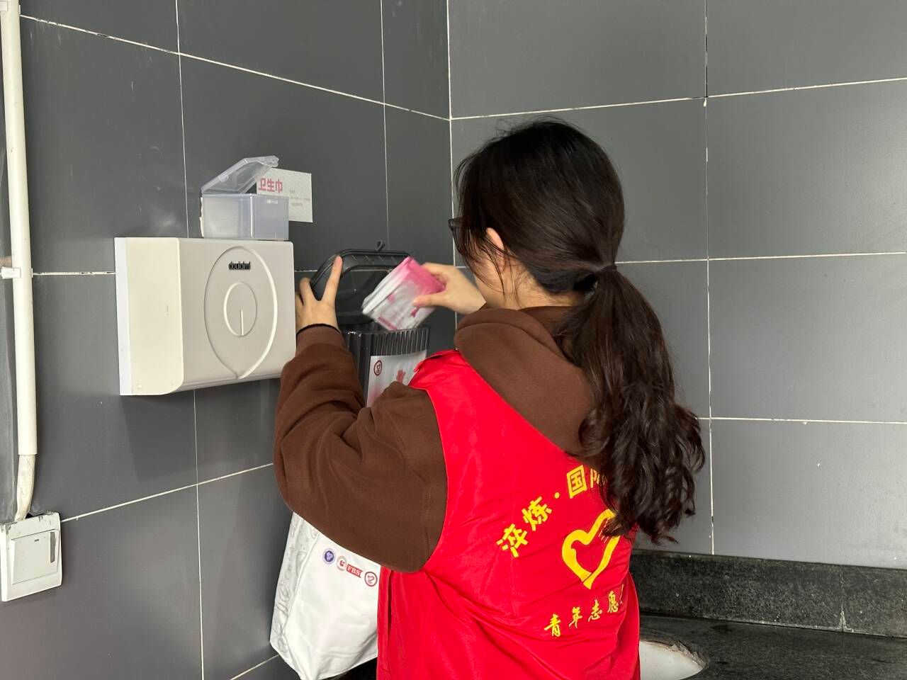 经过一个小时的努力,志愿者们成功完成了重庆移通学院南校区的卫生巾补充,并一起留下了合影。关爱女性的行动不过如此简单,传递的不仅仅是一片一片卫生巾,更是大爱。