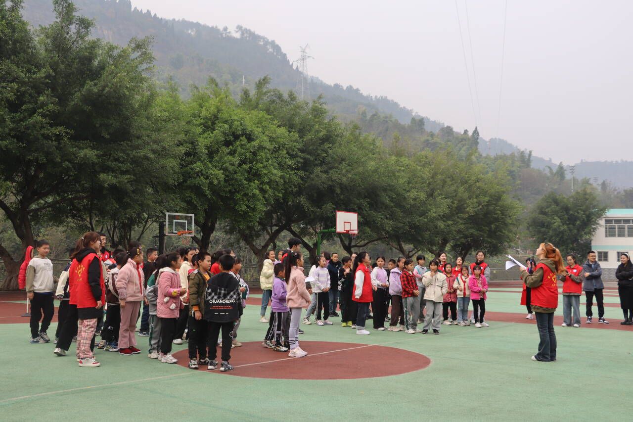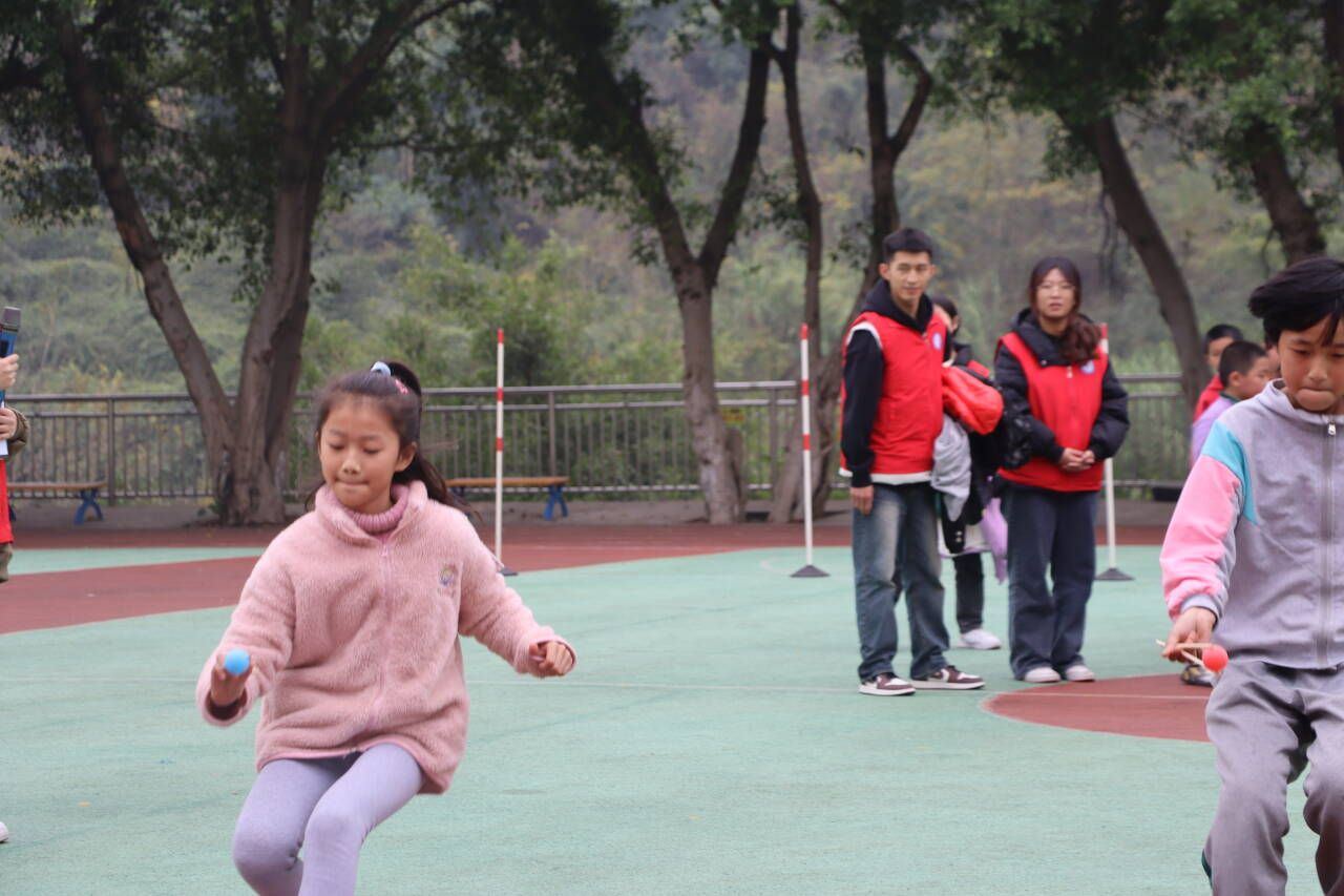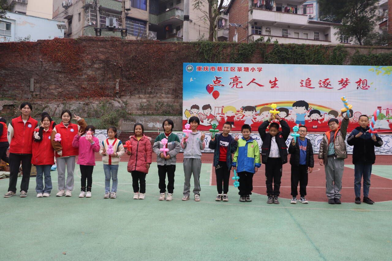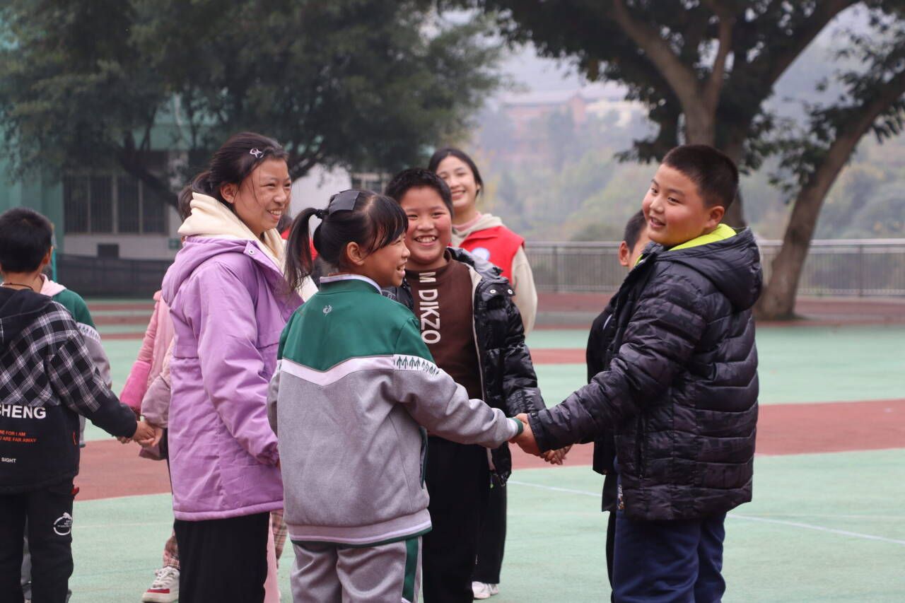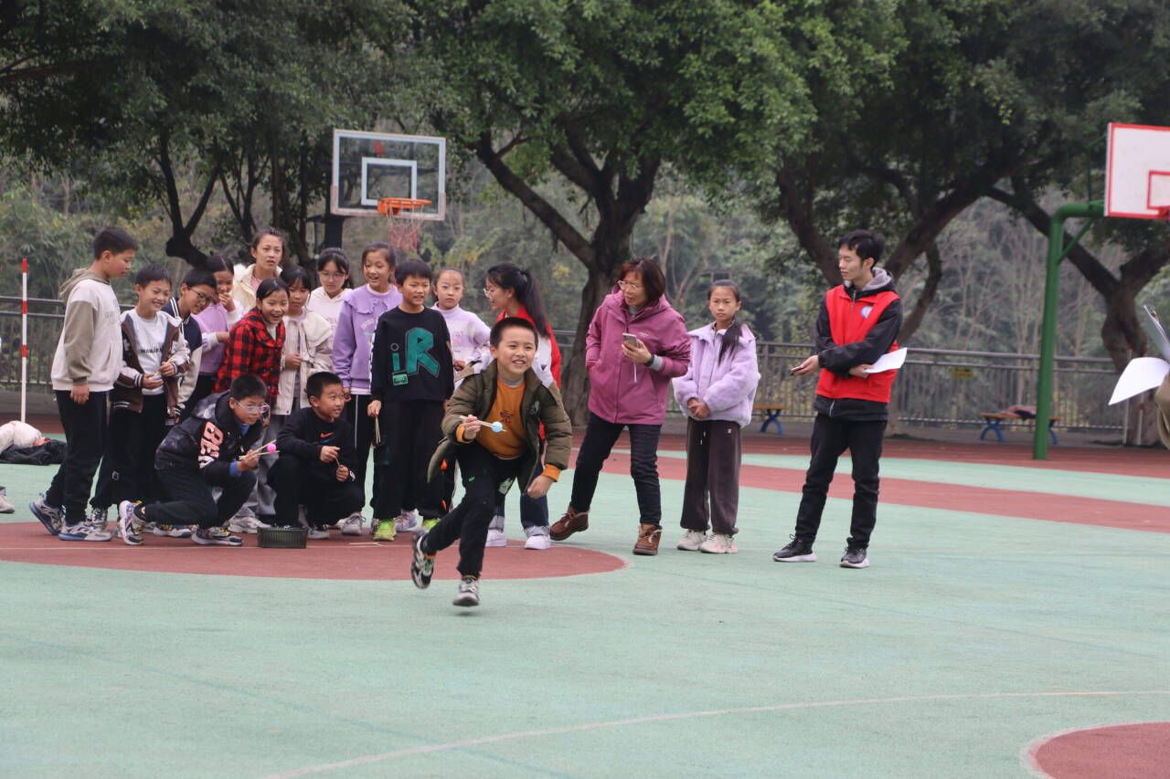 张伟校长带领重庆移通学院老师及支队成员们走进篆塘小学。冬色之下,绿色葱葱,红色的星光,迎面松软的饭香和满墙的荣耀,操场的墙上写着八个大字:点亮人生,追逐梦想。五年级的四十一个小朋友们在老师的带领下步入操场,与四位老师和十七名志愿者们初次相遇欣欣然。活动开始,主持人对此次活动流程作大致的介绍,并将小朋友们分成四个小组参与萝卜蹲、背部运球、夹球接力跑等游戏。一个个鲜活的生命,用智慧,用勇气,用坚持,用团结,与时间赛跑,与自己较量。志愿者与小朋友们配合默契,朝着目标快乐地奔跑,摔倒后爬起,相信中前行。通过紧张刺激的角逐,统分完毕,按排名先后顺序,小朋友们蹦跳着上台领奖。在这些富有趣味性的活动中,在每一个充满星星的眼睛里,压力随着风声远去,他们终将成为大人,用蹦跳的生命,书写稚嫩的青春。满目葱茏,远方传来下课铃,它说,下课时间到了,要放松一下眼睛。本次活动的意义,不仅是释放压力、学会成长,更是诗和远方。