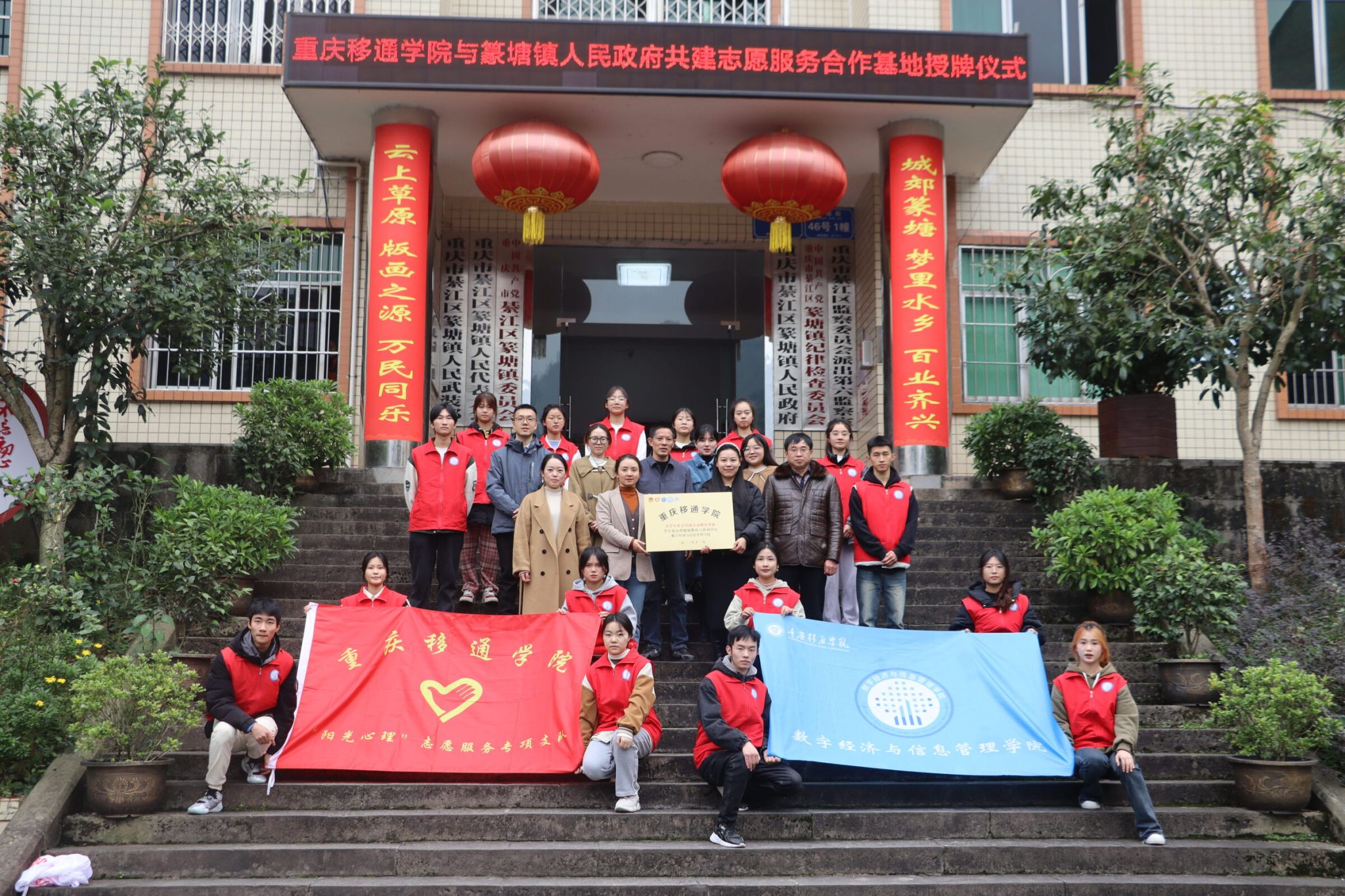 授牌伊始,篆塘镇政府代表与重庆移通学院老师亲切握手,以礼会友,并用笑容和掌声热烈欢迎重庆移通学院老师和学子的到来。微风拂面,红旗飘扬,篆塘镇政府代表敖俊主任与重庆移通学院数字经济与信息管理学院团总支书记潘锐老师亲切交谈,对本次活动表示殷切期待,对于今后的合作以及活动的开展,进行初步规划。山河为证,重庆移通学院潘锐老师郑重地将合作牌匾授予篆塘镇政府,掌声雷动,新程乍起。最后,全体人员在欢呼声中合影留念,以此记录这个具有里程碑意义的时刻。