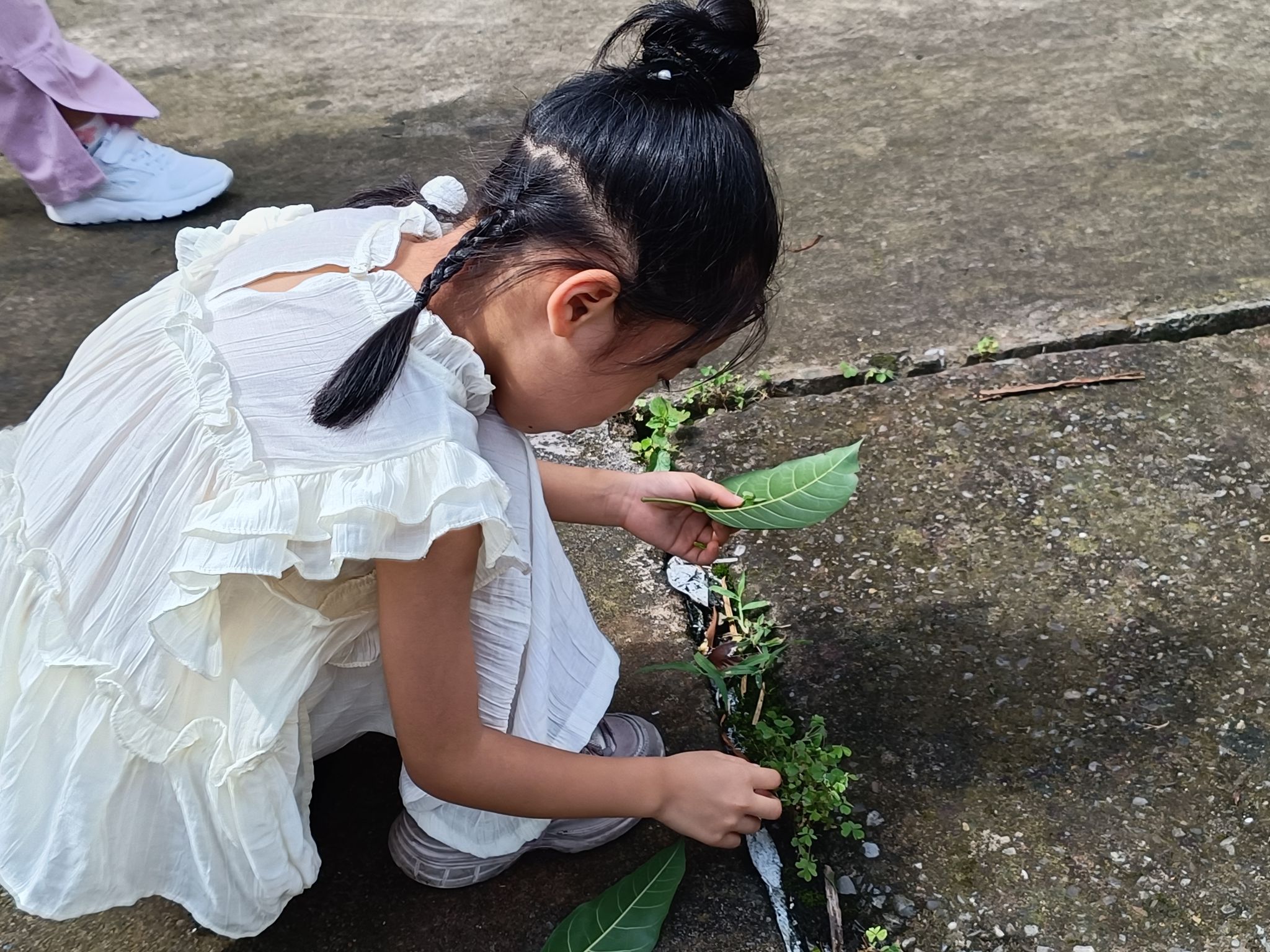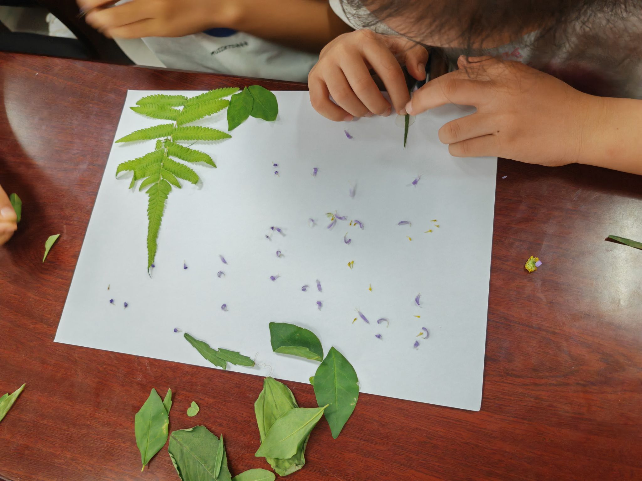 形状各异、色彩斑斓的树叶花朵映入眼眸,孩子们在志愿者的带领下走进户外;寻找贴画材料的同时感受自然之美,激发了他们对美的认知。半小时后,孩子们回到活动场地,将树叶放在白色纸张上,开启了他们的创作。在志愿者的指导和帮助下,每一幅树叶拼贴作品都独具特色,展现着孩子们对大自然的独特观察和理解。让留守儿童浸润于美的作品之中,从而点燃他们对美的热爱,促使他们更加主动地探索美。