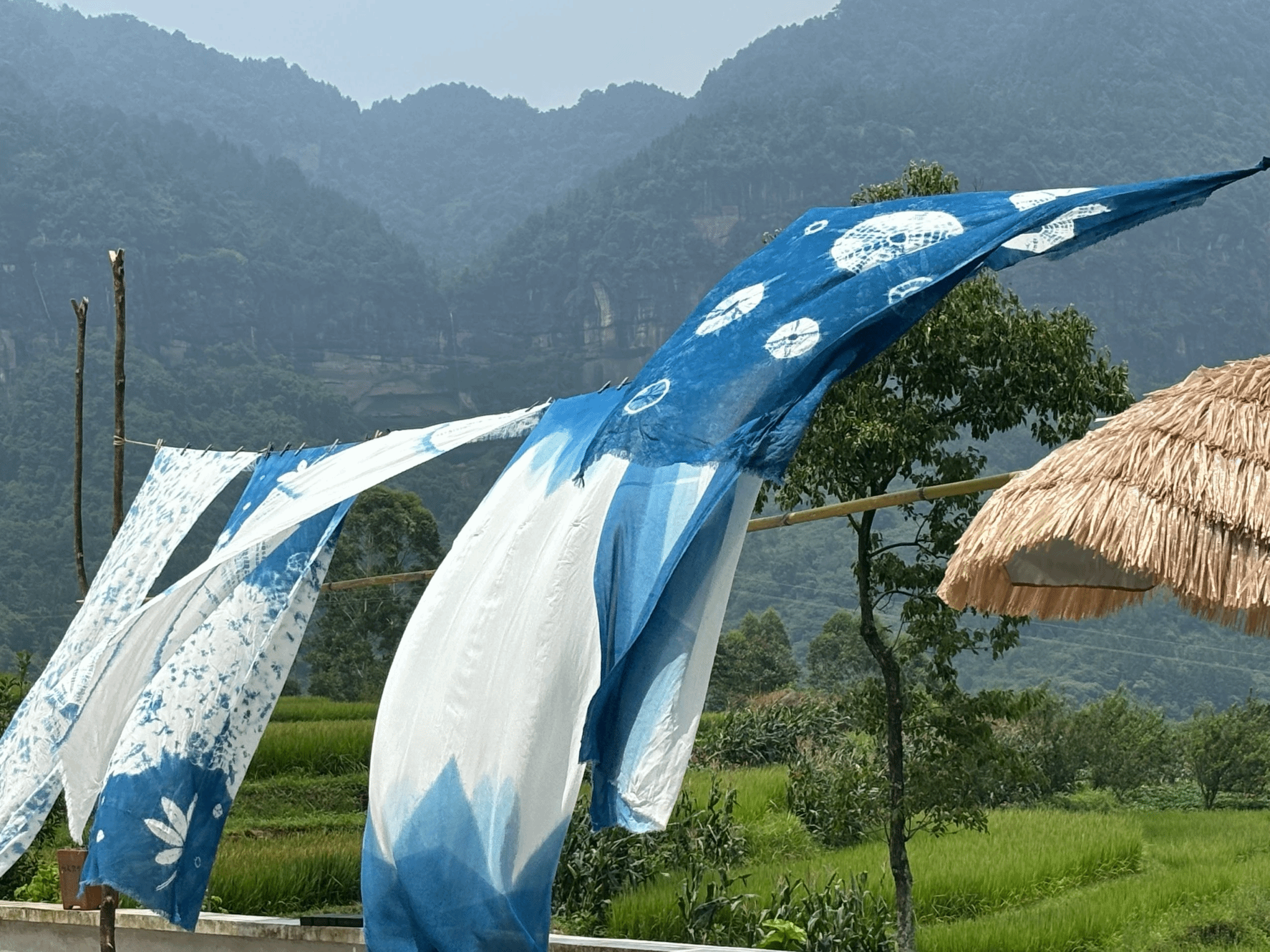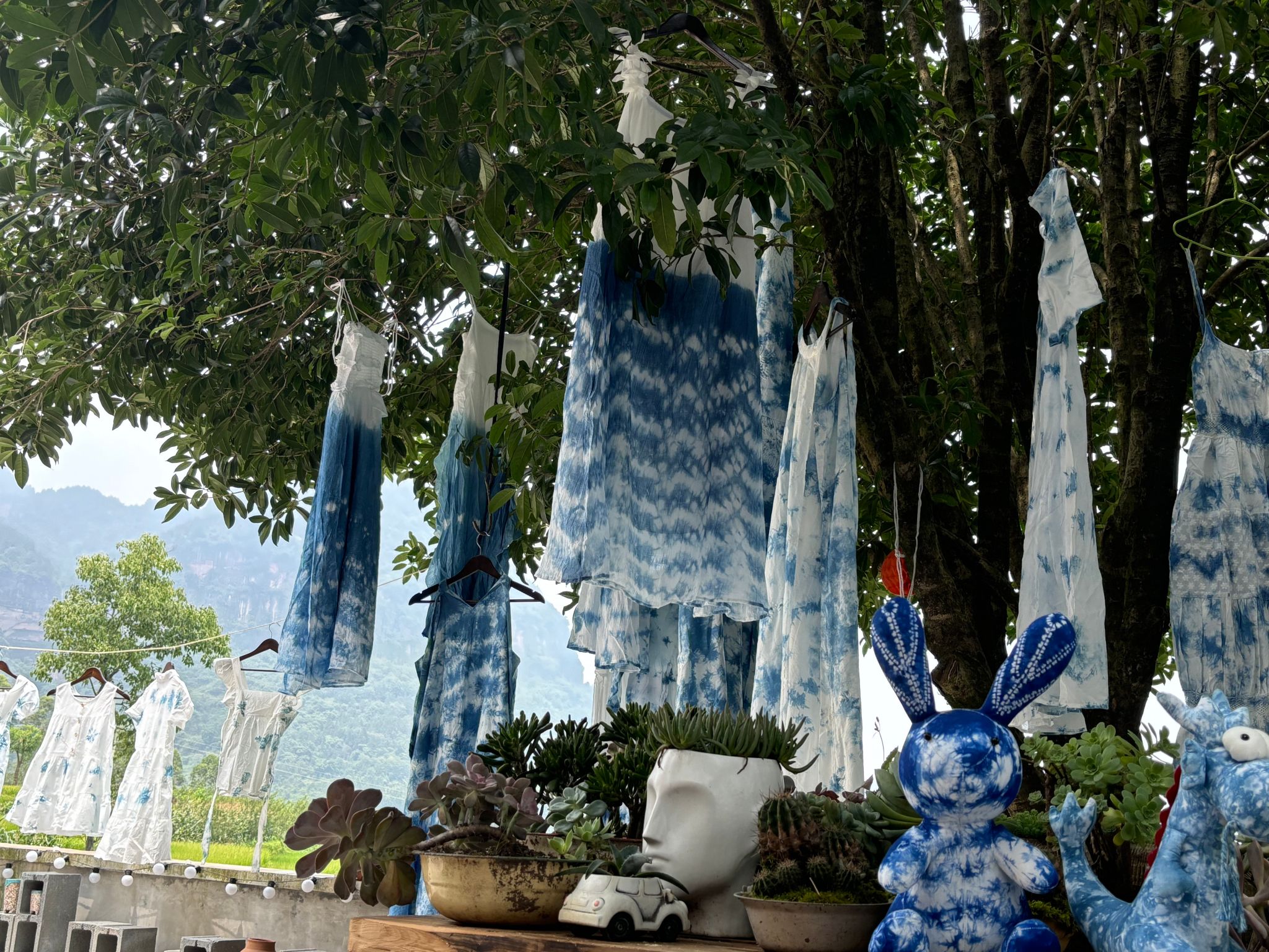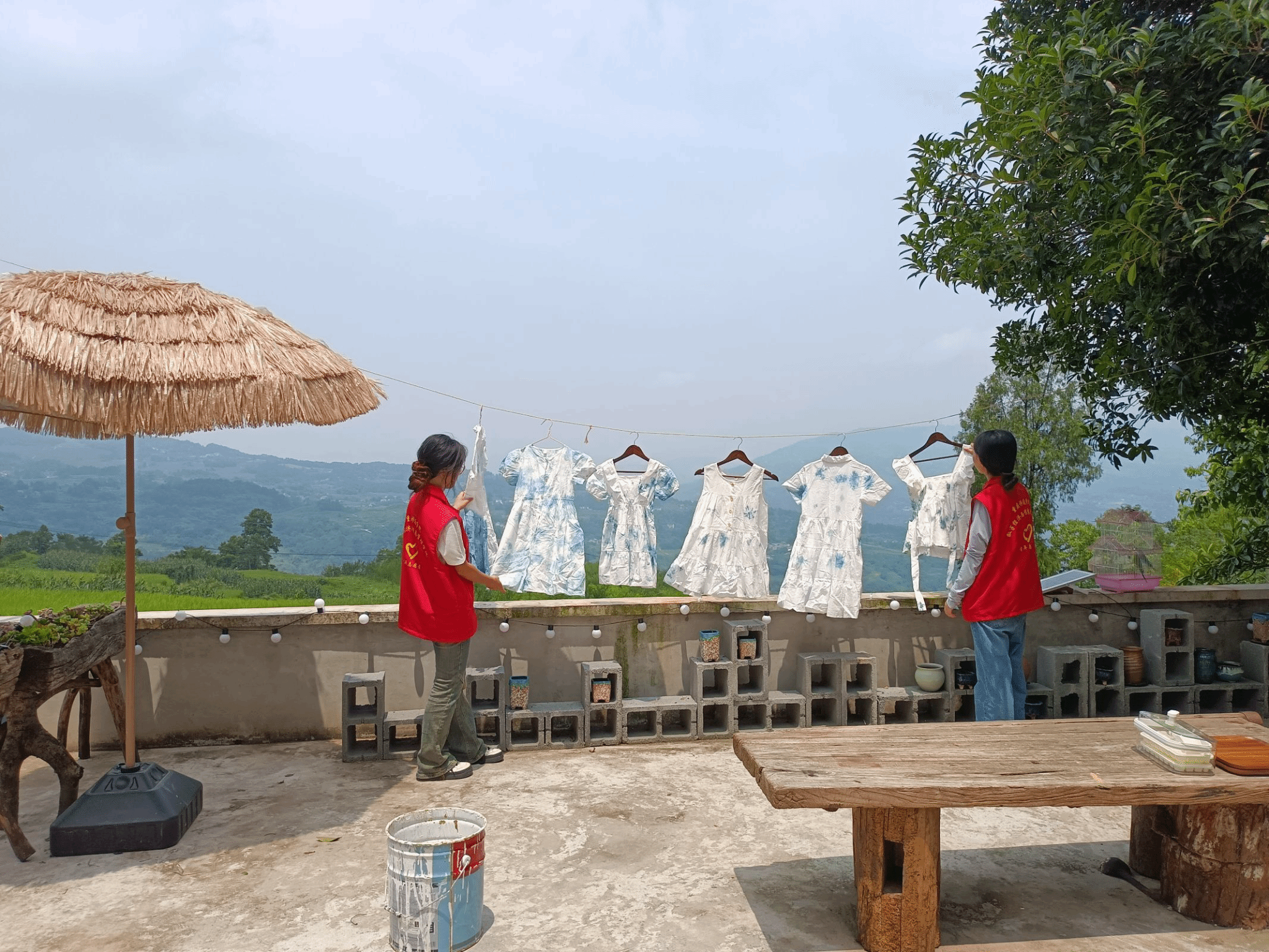 随后,装饰工作缓缓拉开序幕。在张书记的引领下,志愿者们将精心扎染的成品晾晒于小屋门前的绳索上,随着微风轻拂,布料轻舞飞扬,如同自然界中最灵动的音符,奏响了一曲关于美的赞歌。而那些由扎染艺术精心打造的裙子,更是成为了装饰的亮点。它们被志愿者们轻轻挂在古树枝干上,随风摇曳生姿,蓝白相间的色彩与古树的绿叶交相辉映,构成了一幅幅动人心魄的画面。阳光透过树叶的缝隙,洒在这些裙子上,斑驳陆离的光影让每一条裙子都仿佛拥有了灵魂,与古树共同演绎着一场关于时间、自然与艺术的对话。