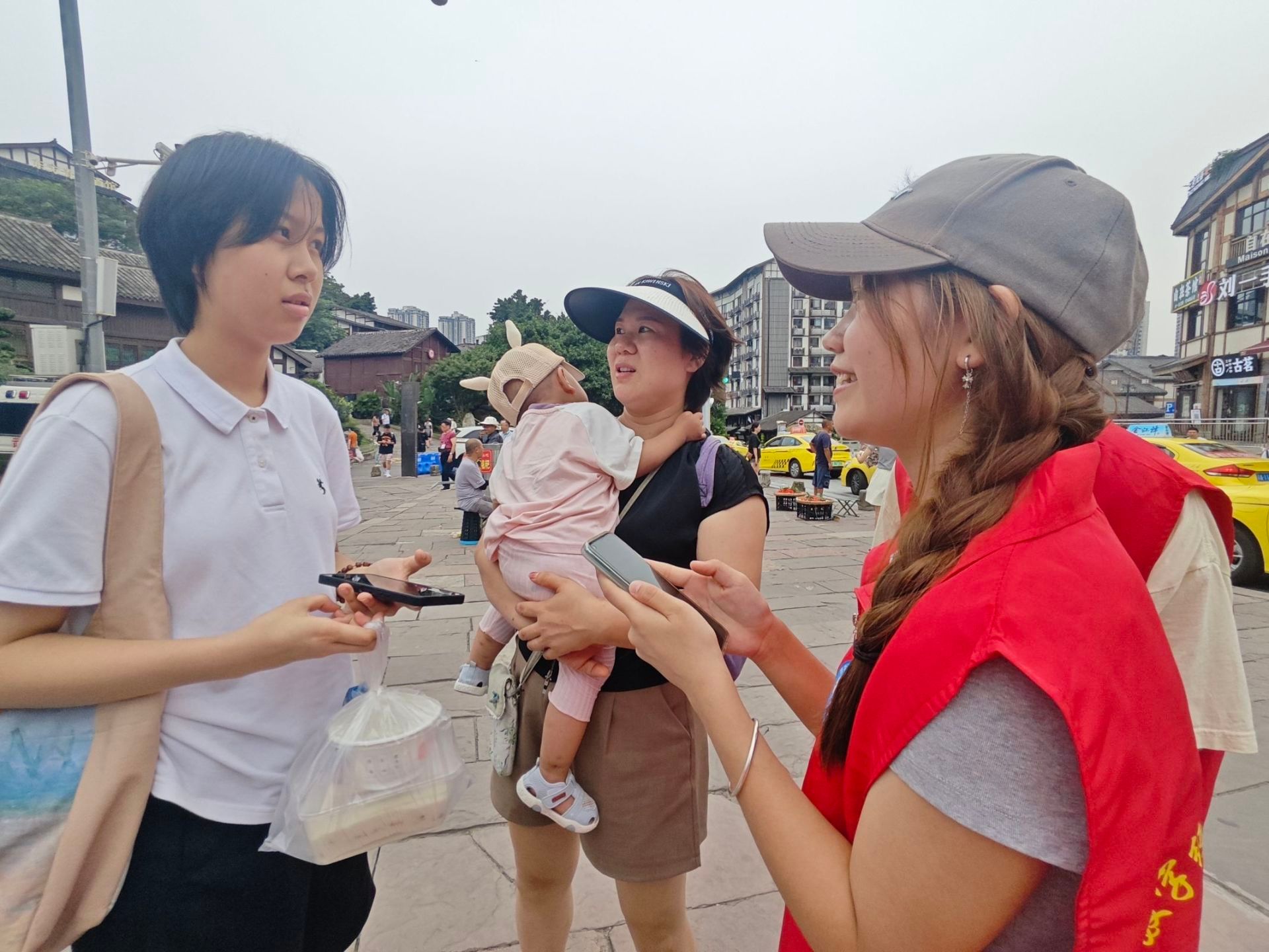 随后,成员们带着这些精心制作的手绘草帽来到了磁器口后街进行义卖。这些草帽一亮相就吸引了众多市民和游客的目光。他们驻足观赏,纷纷赞叹这些草帽不仅美观大方,更承载着丰富的党史文化内涵。市民们争相购买,希望将这些充满红色情怀的纪念品带回家中珍藏。
