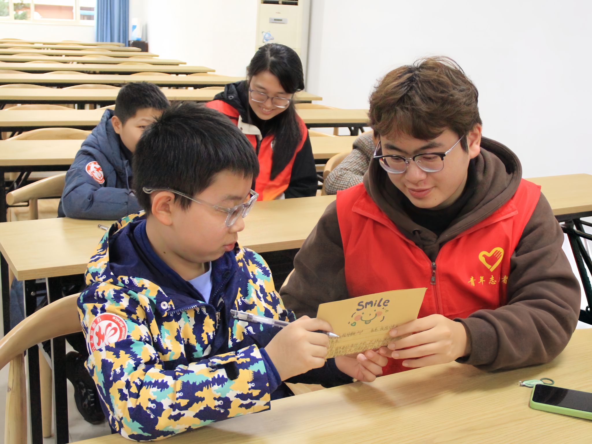 在活动的尾声,志愿者们与孩子们共同在明信片上倾注了深情的留言,这些留言既包含了温馨的祝福,也寄托了美好的愿望。完成书写后,孩子们和志愿者们纷纷主动走上讲台,分享自己亲笔写下的感言。现场充满了温暖和真挚的情感交流,这进一步加深了他们之间的情谊和相互理解。