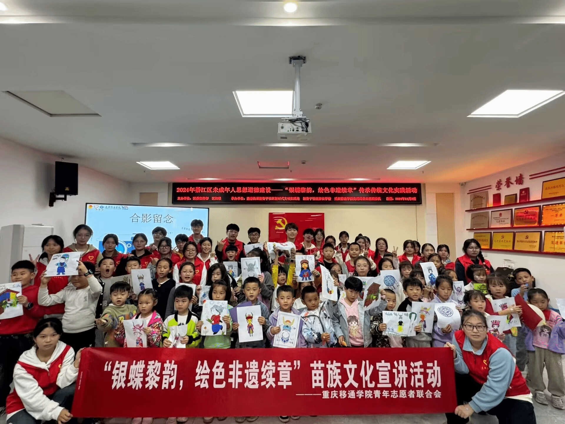 为点燃青少年对各个少数民族文化的探索之心,传承传统文化,筑牢中华文化共同意识,增强中华民族凝聚力,延续学校暑期“三下乡”黎韵传声筒民族团结实践团的衍生系列活动第一期,2024年11月2日,青年志愿者联合会项目孵化中心在重庆市綦江区青少年活动中心开展“银蝶黎韵,绘色非遗序章”志愿主题活动。