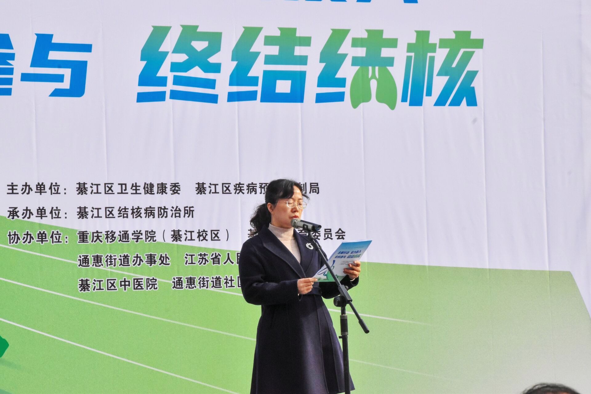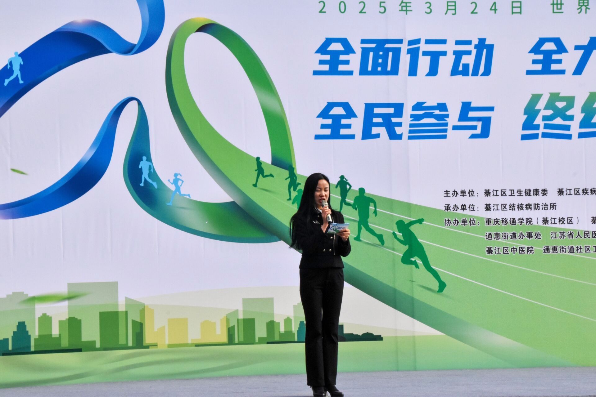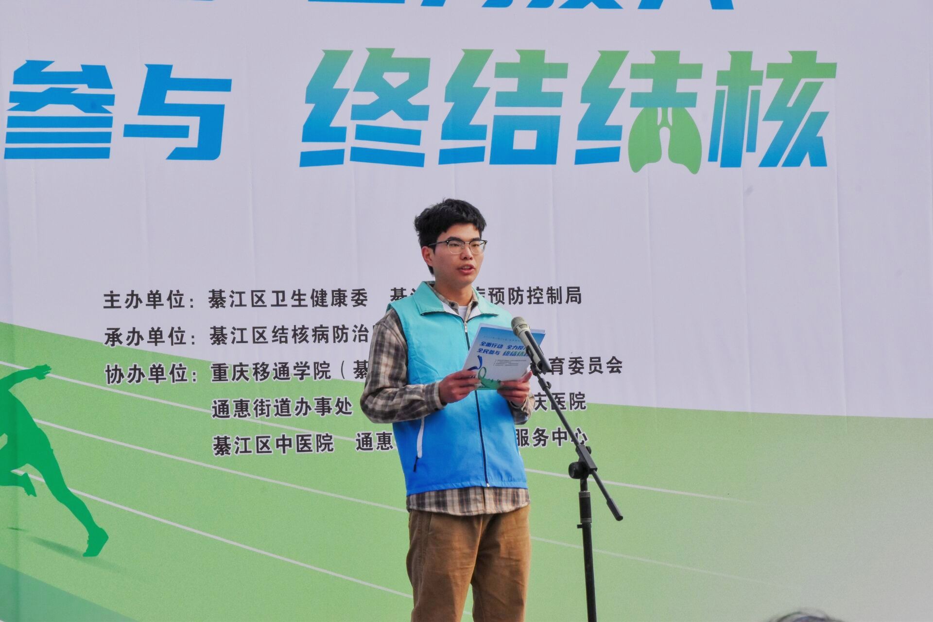 活动现场,“传声筒”防痨志愿服务专项支队成员们以快闪歌舞,结合“防治结核”的主题为活动打开序幕,瞬间点燃了现场气氛。区结核病防治所所长邓峰用详实的数据分享了近年来区域结核病防控的显著成效,并真诚呼吁大家提高科学防护意识。綦江区卫生健康委党委委员、区疾病预防控制局局长刘丽进行致辞,“传声筒”防痨志愿服务专项支队学生志愿者代表陈浩宣读了《终结结核倡议书》。