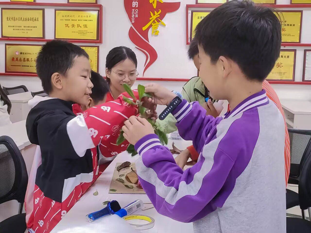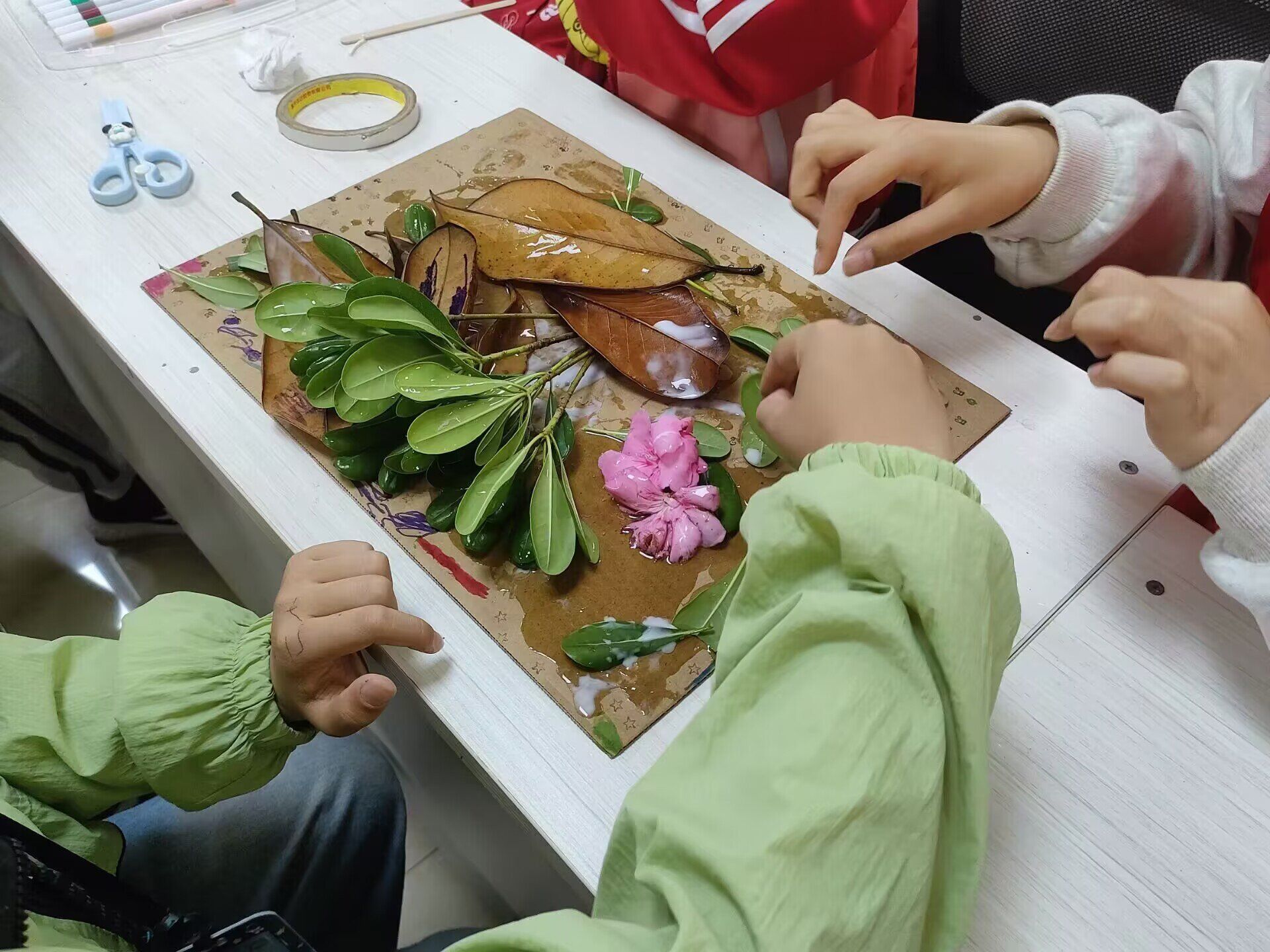 “变废为宝,改旧焕新” 环节将活动推向高潮。孩子们以小组为单位,充分发挥想象力,用枯枝落叶、小木条在纸板或卡纸上创作手工艺品。完成后,每个小组积极展示作品,分享创作思路与感受,其他孩子认真倾听、提问、交流。原本废弃的材料在孩子们手中变成了精美的画作、有趣的摆件,让大家切实感受到环保与创意结合的魅力。