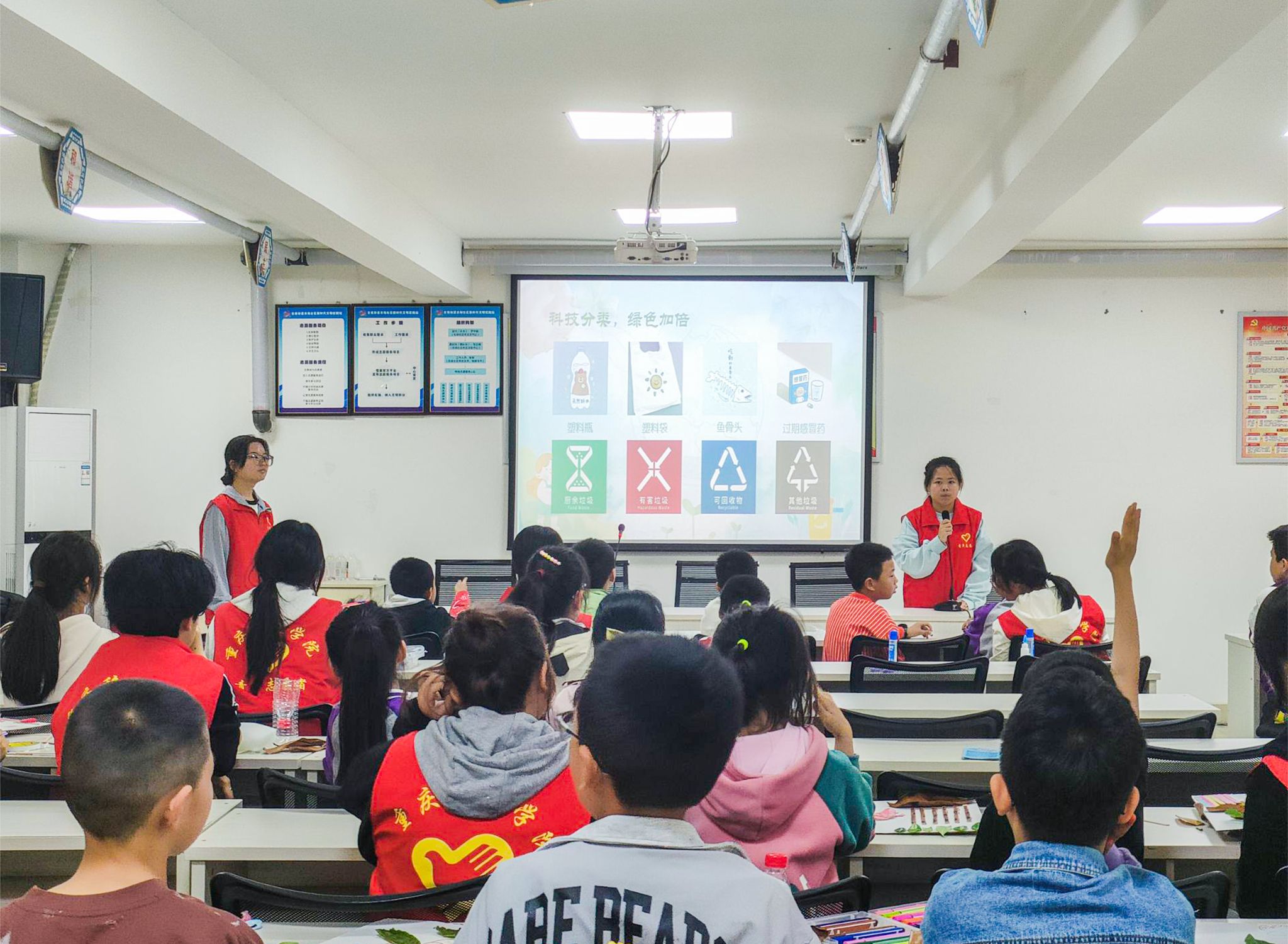 “科技分类,绿色加倍” 环节中,志愿者向孩子们科普垃圾分类知识,介绍智能垃圾分类桶,以问答奖励的方式加深他们对垃圾分类的理解。孩子们热情高涨,积极参与互动,进一步增强了垃圾分类意识,认识到科技在环保领域的重要作用。