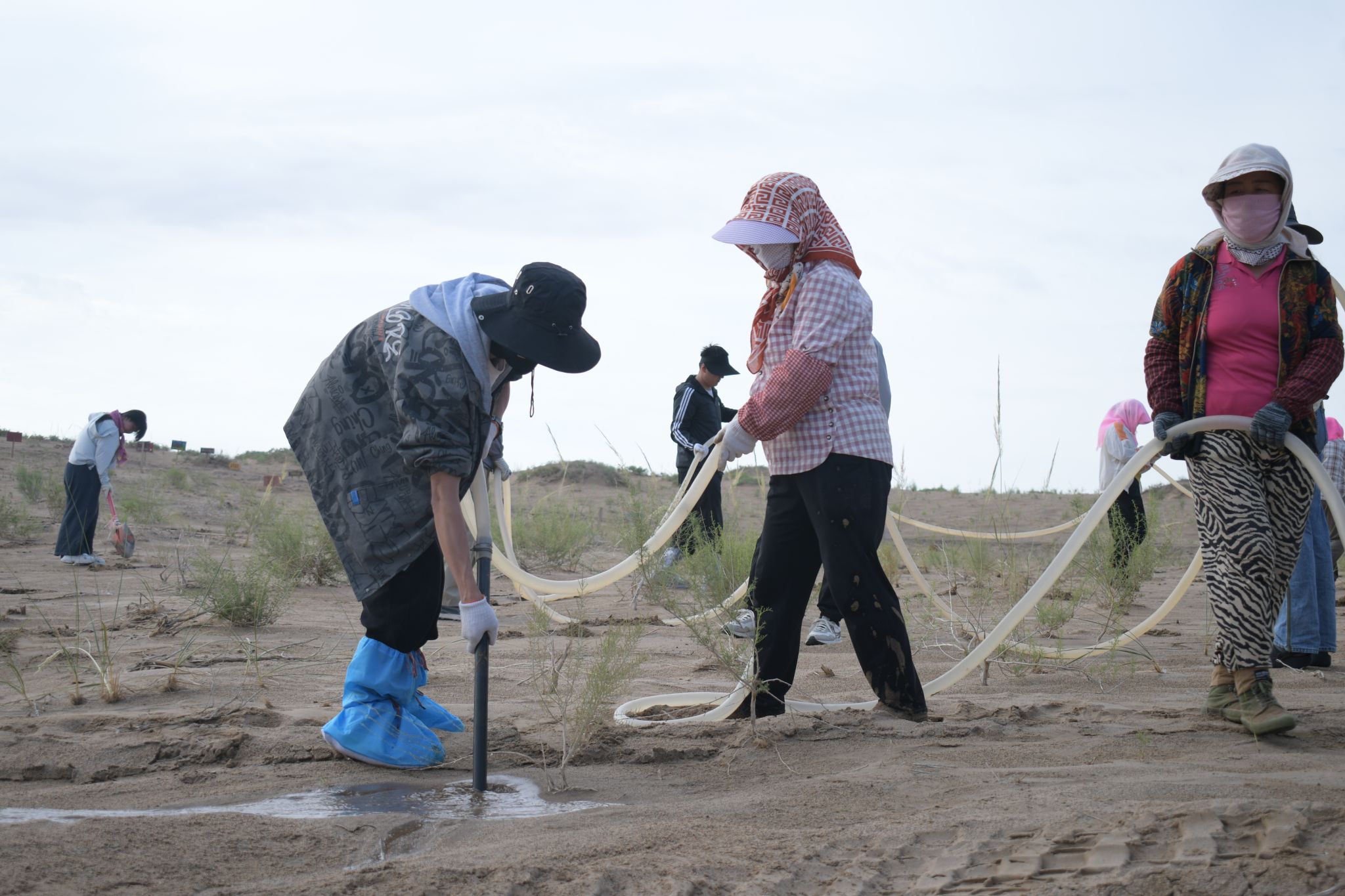 大风吹不走这群青年扎根沙漠治理的心,以及对梭梭树苗维护工作的热情。维护是根基,总结前沿经验,团队成员们分组协作,紧密配合:一组手持铁锹,弯腰回填浇灌留下的坑洞,为保证树苗根系水分充足;另一组肩扛水管,仔细浇灌每一株幼苗,确保水分渗透到位。交替进行让成员对整个治理工作充分了解,并且传递经验与其他高校一同协作。
