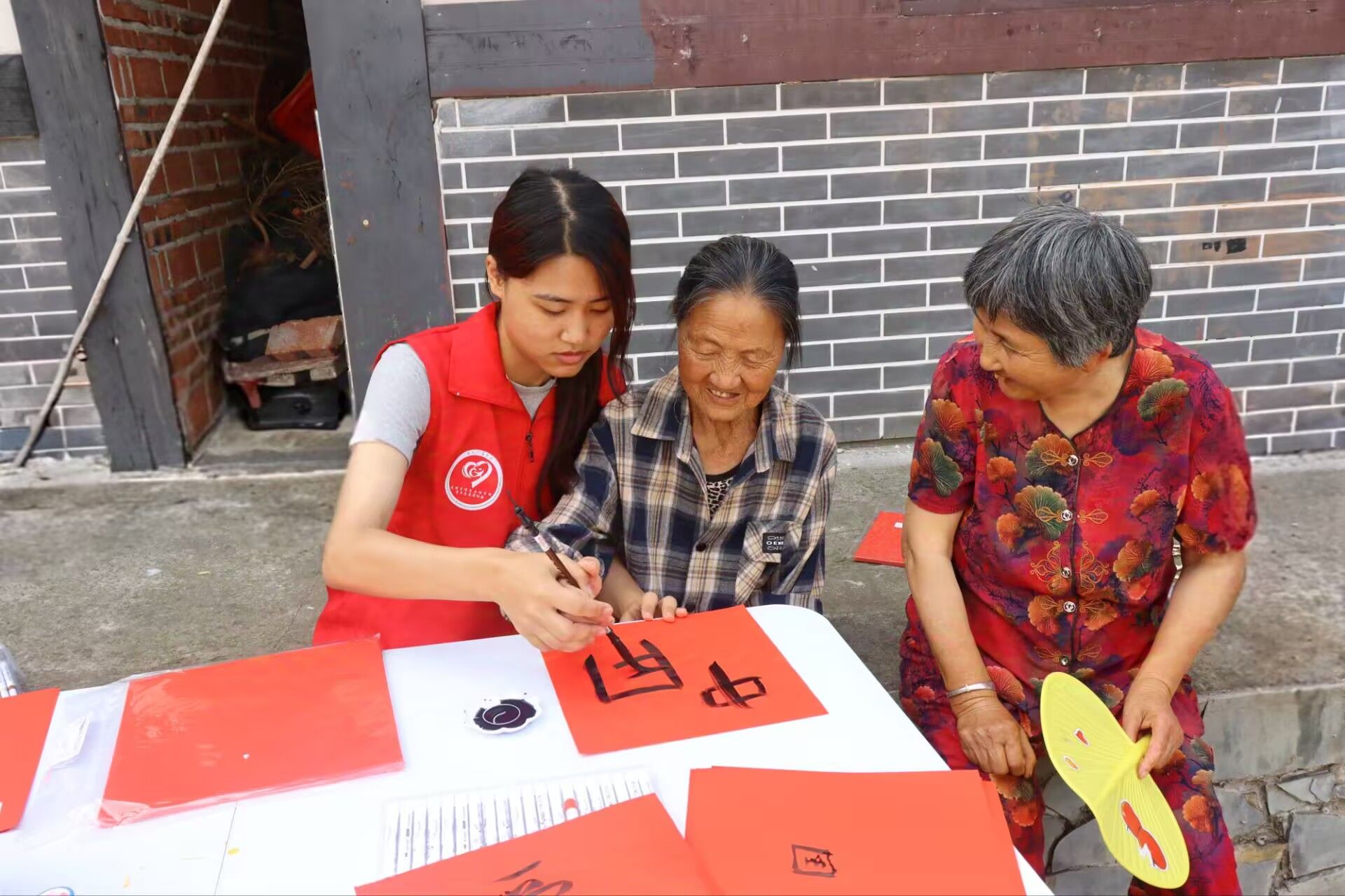 为弘扬红色文化,实践团队成员们支起小摊,热情邀请柳乃夫小院周边的邻居老人。对于这些历经岁月洗礼的老人们来说,这里的一砖一瓦都承载着他们对英雄的珍贵记忆。大家围坐在一起,队员们耐心地手把手教老人们执笔运腕。老人们在红纸上落下的每一笔,虽带着初学的生涩,却饱含着对柳乃夫英雄事迹的深切缅怀,每一笔都是跨越岁月的崇高致敬;墨痕里晕染的不仅是宣纸的纹理,更是深埋心底的爱国情愫。老人们缓缓讲述着柳乃夫为国家和民族事业英勇奋斗的故事,在那战火纷飞的岁月里,英雄的壮举照亮人心。在回忆与畅谈中,老人们也感慨着当今时代的飞速发展,从衣食住行的显著改善到国家实力的日益强盛,字里行间满是对祖国的骄傲与自豪。这跨越代际的交流,让年轻队员们更深刻地理解了英雄精神的内涵,也让大家明白,今日的幸福生活来之不易,是无数像柳乃夫一样的英雄用热血和生命换来的。