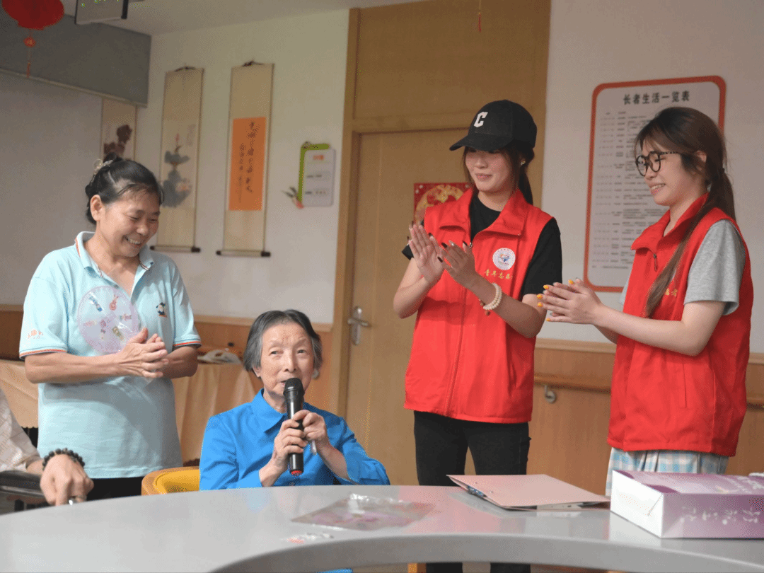 游戏过后,志愿者们带来经典歌曲合唱与简易舞蹈表演。熟悉的旋律响起时,几位长辈忍不住跟着哼唱,志愿者们顺势邀请长辈一同参与,歌声与笑声交织,成为现场最动人的旋律。活动尾声,志愿者为每位参与的长辈送上精心准备的纪念奖品,并组织全体人员拍摄大合影,镜头在此刻定格下一张张笑脸。