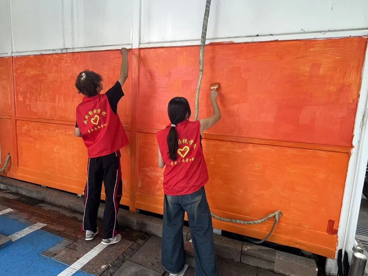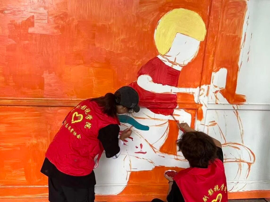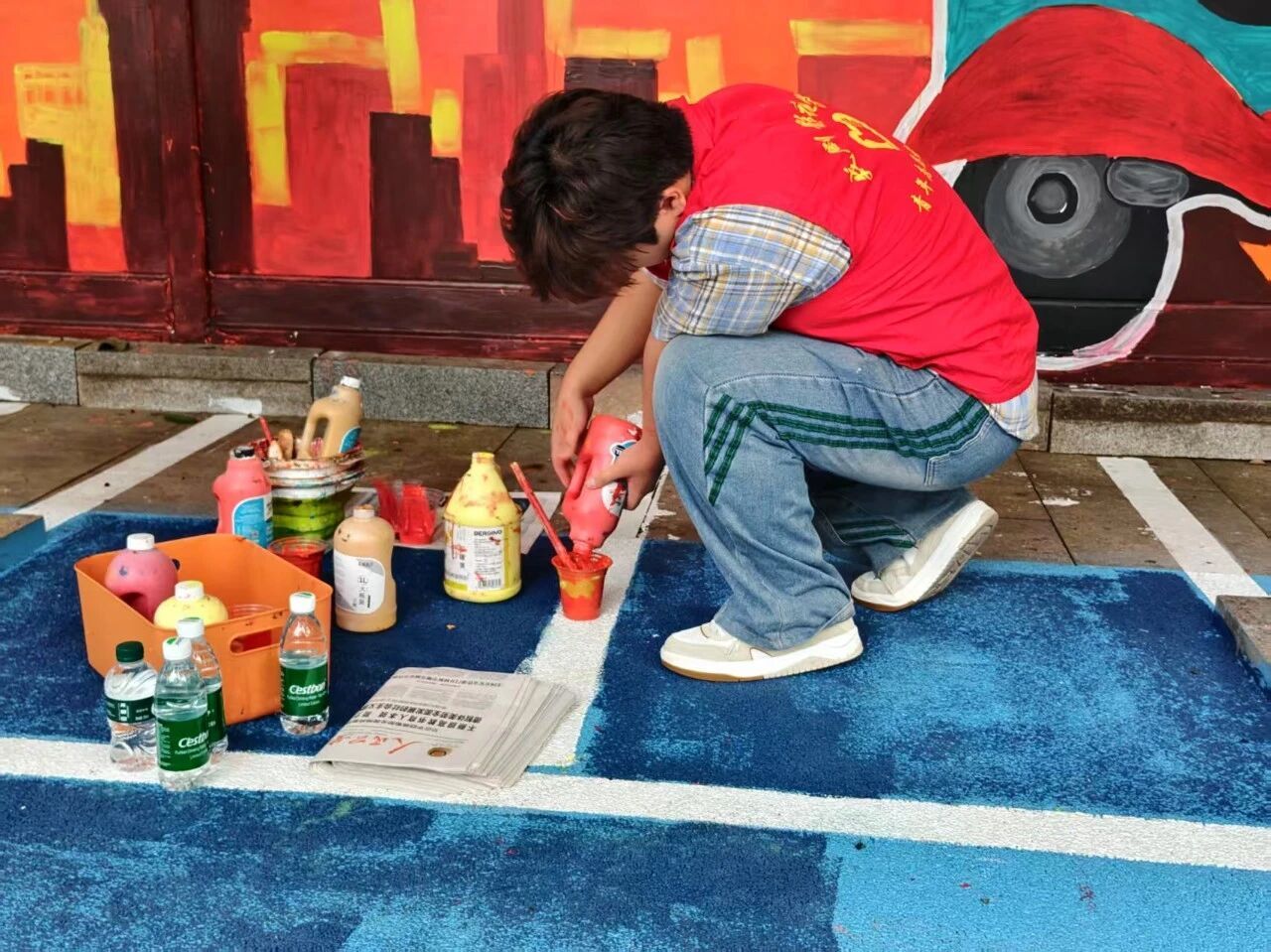 活动当天,志愿者们早早抵达红星广场,在前期充分调研和精心设计的基础上,大家迅速投入墙绘工作。现场分工明确、配合默契;有的用铅笔细致勾勒轮廓,确保图案比例协调、线条流畅;有的专注调色工作,依据设计方案精准调配所需色彩,经过反复调试达到预期效果;还有的负责为轮廓填充色彩,让画面逐步丰满。绘画过程中,志愿者们充分发挥专业特长,展现出扎实的专业功底。