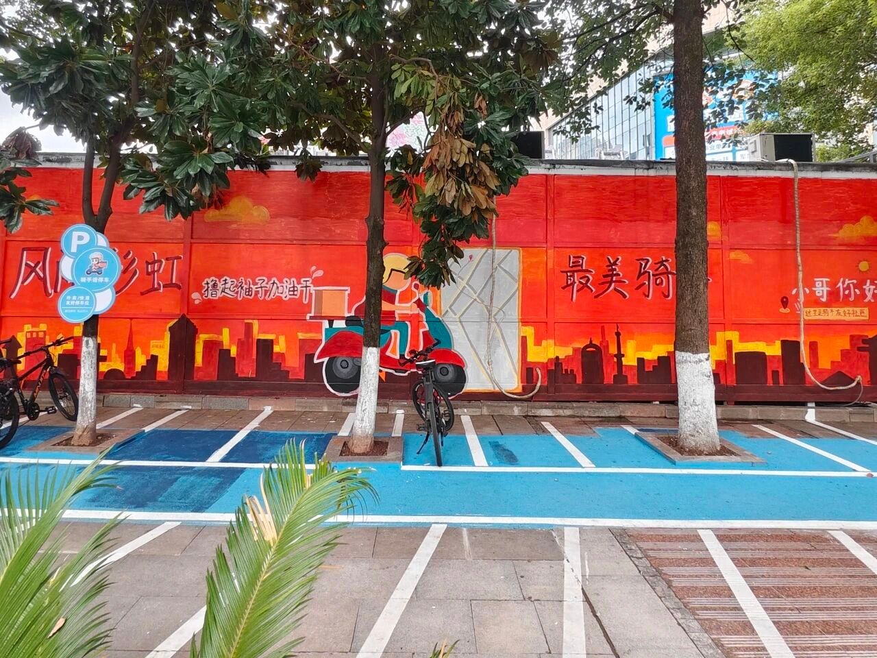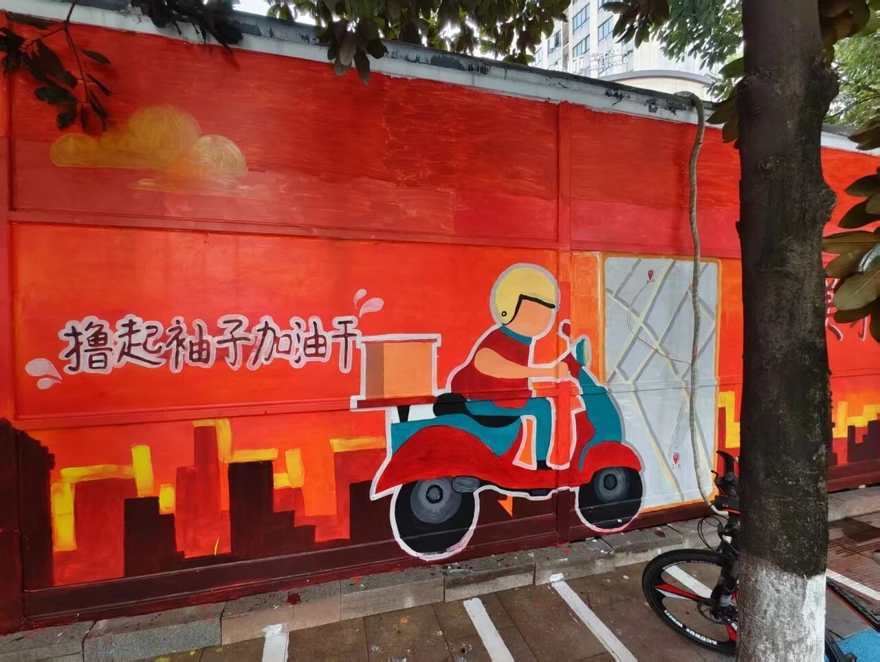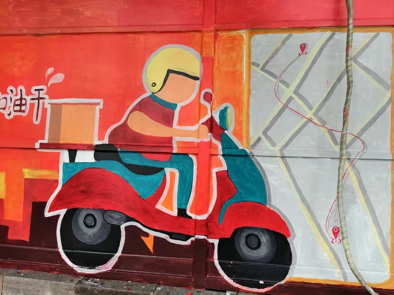 随着时间推进,原本单调的墙面,在志愿者们的绘制下,渐渐被丰富的色彩与生动的图案覆盖,有了明显的变化,增添了不少生气。图案内容围绕“骑士友好社区”展开,有骑手规范停放车辆的场景、居民为骑手递水的画面,还有清晰的骑行安全标识和社区服务站点示意,每一笔都融入了志愿者们对构建和谐社区关系的美好祝愿。