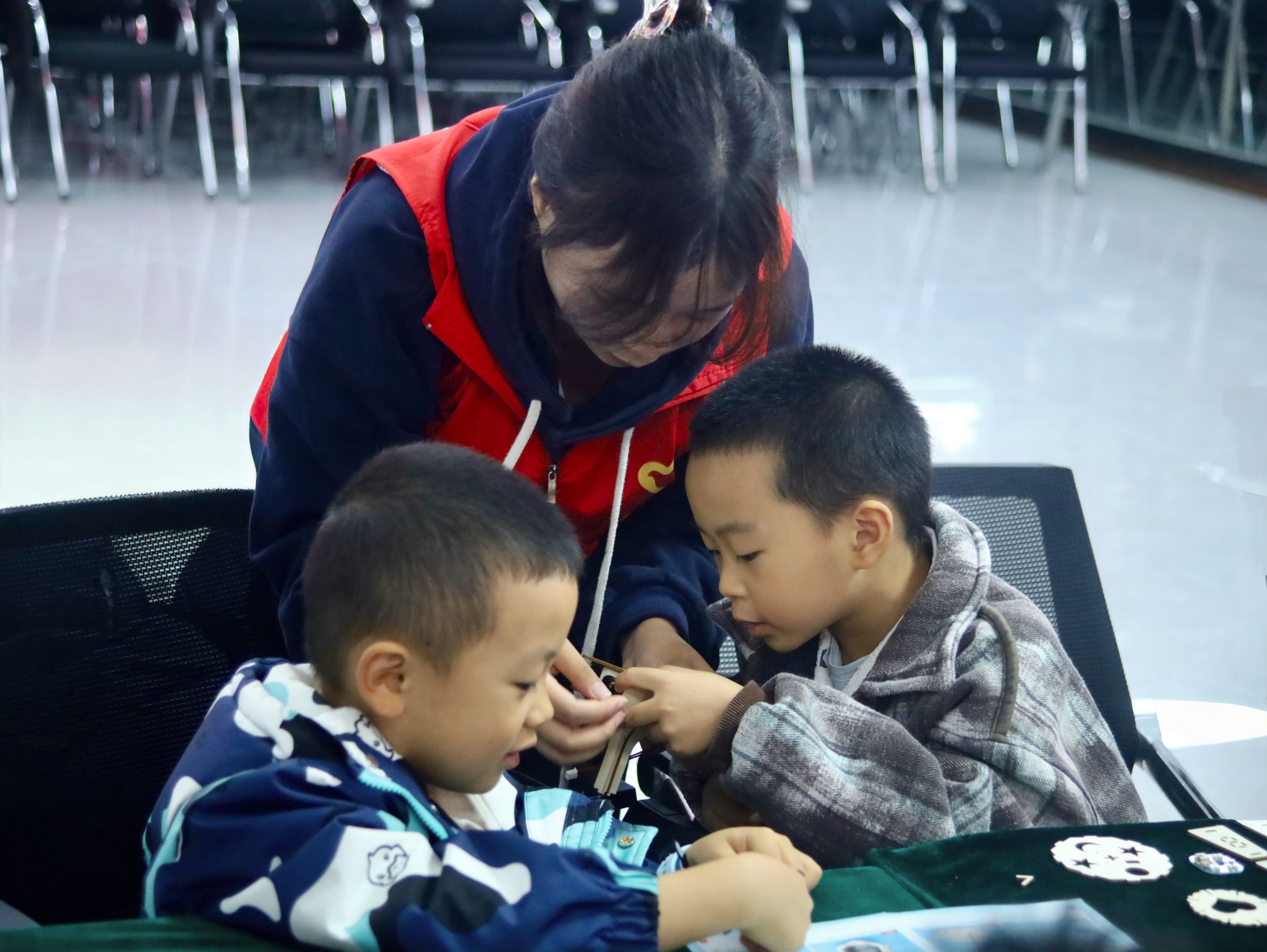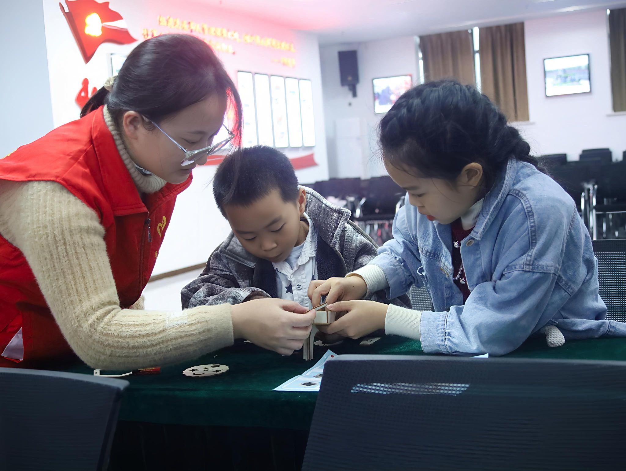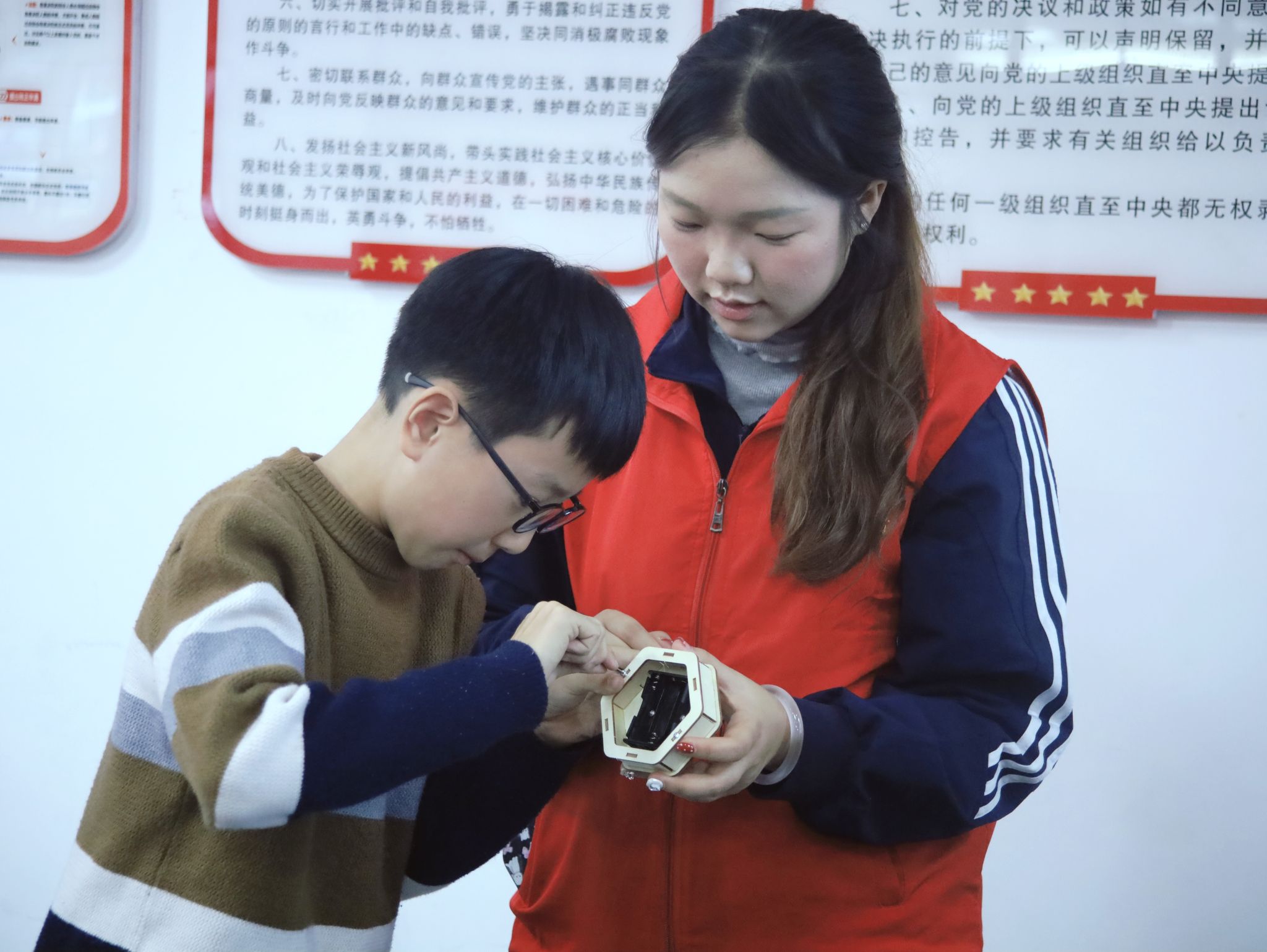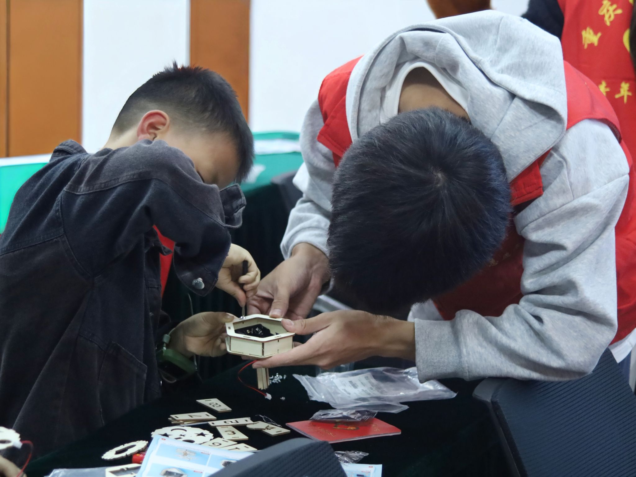志愿者为每位孩子们分发了语音智能小夜灯核心套件、空白灯座。现场采用“一对一”的精准陪伴模式。在志愿者的陪伴下,孩子们慢慢完成了夜灯小作品,孩子们现场对自己的小夜灯发出语音指令,亲身体验声控开关的便捷与神奇。当一声“开灯”的指令后,自己亲手组装的小夜灯应声而亮,孩子们的脸上瞬间写满了惊喜与成就感。志愿者们则穿梭其间,解答孩子们心中的疑惑,让科技的种子在亲手实践中深深植根于童心。