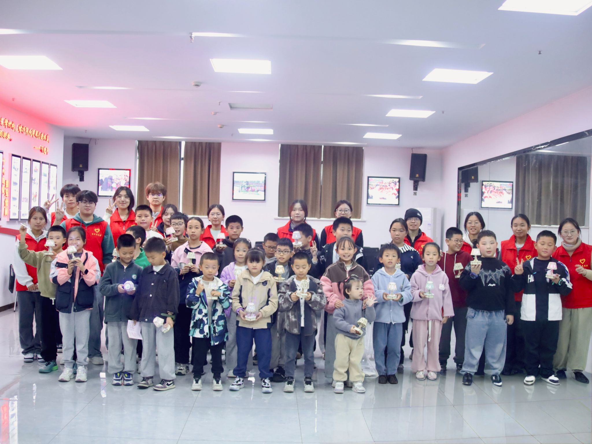 最后,所有小朋友自豪地举起自己亲手制作的智能小夜灯集体合影留念。镜头之下,一盏盏创意闪耀的灯盏与一张张灿烂纯真的笑脸相互辉映,构成了一片温暖而充满未来感的星海,为这场充满智慧与温暖的探索之旅画上了圆满的句号。这次活动不仅让孩子们收获了快乐的体验和独一无二的科技作品,更在他们心中播下了探索科学、热爱创新的种子。未来,完满课堂将持续开展此类智慧创新志愿服务活动,让更多青少年在潜移默化中提升科学素养,让科技梦想与青春童心在时代的浪潮中双向奔赴、共同成长。