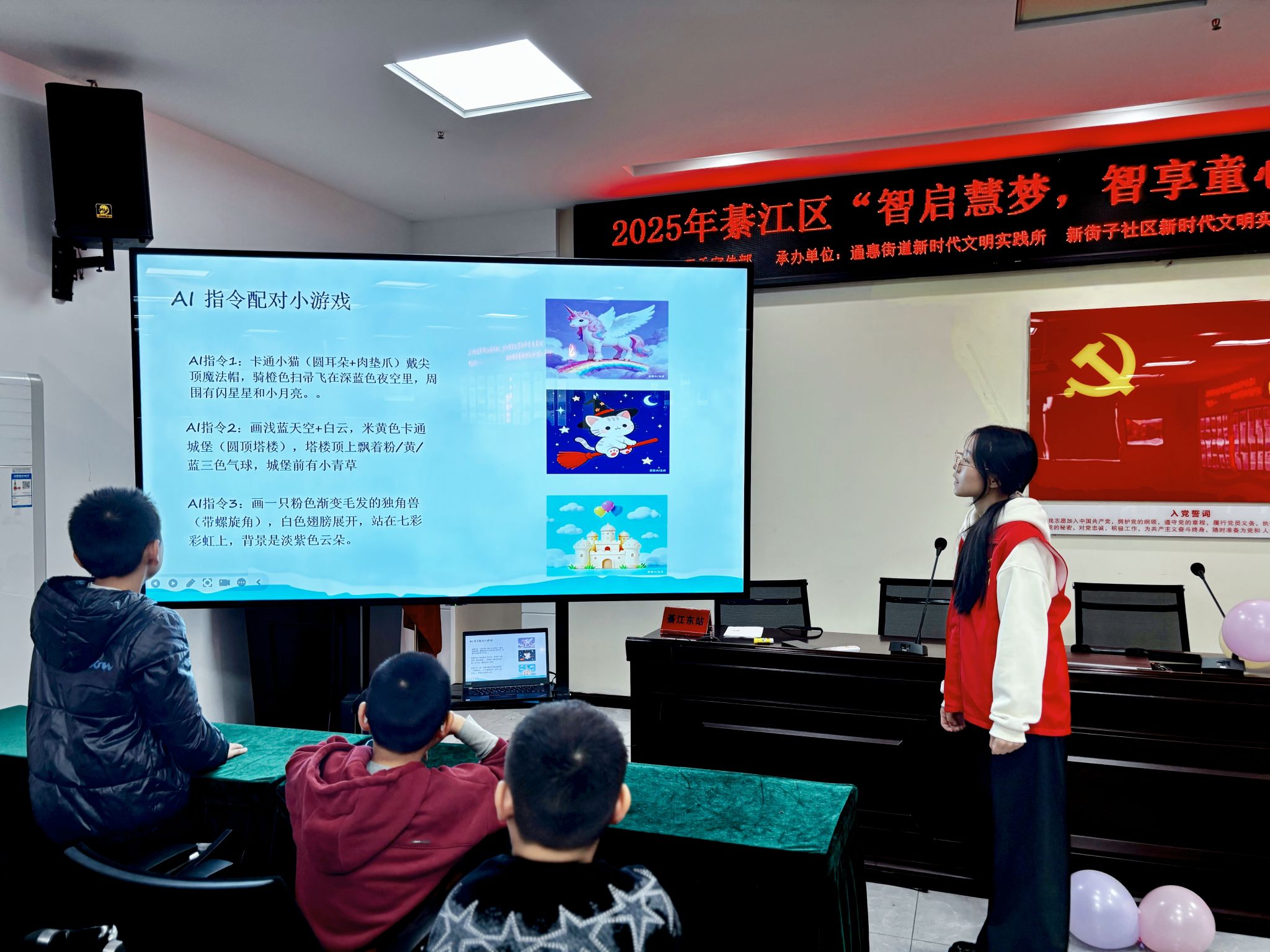 “AI科技小讲堂”为孩子们推开科技世界的奥秘。主持人借助PPT与动画结合,将AI“接收指令—分析处理—输出成果”的核心逻辑具象化,搭配AI绘画、智能助手,让抽象科技变得可触可感。孩子们的目光似被磁石吸引,紧追屏幕上的每一处细节,这为孩子们的AI认知之旅播下好奇的种子。