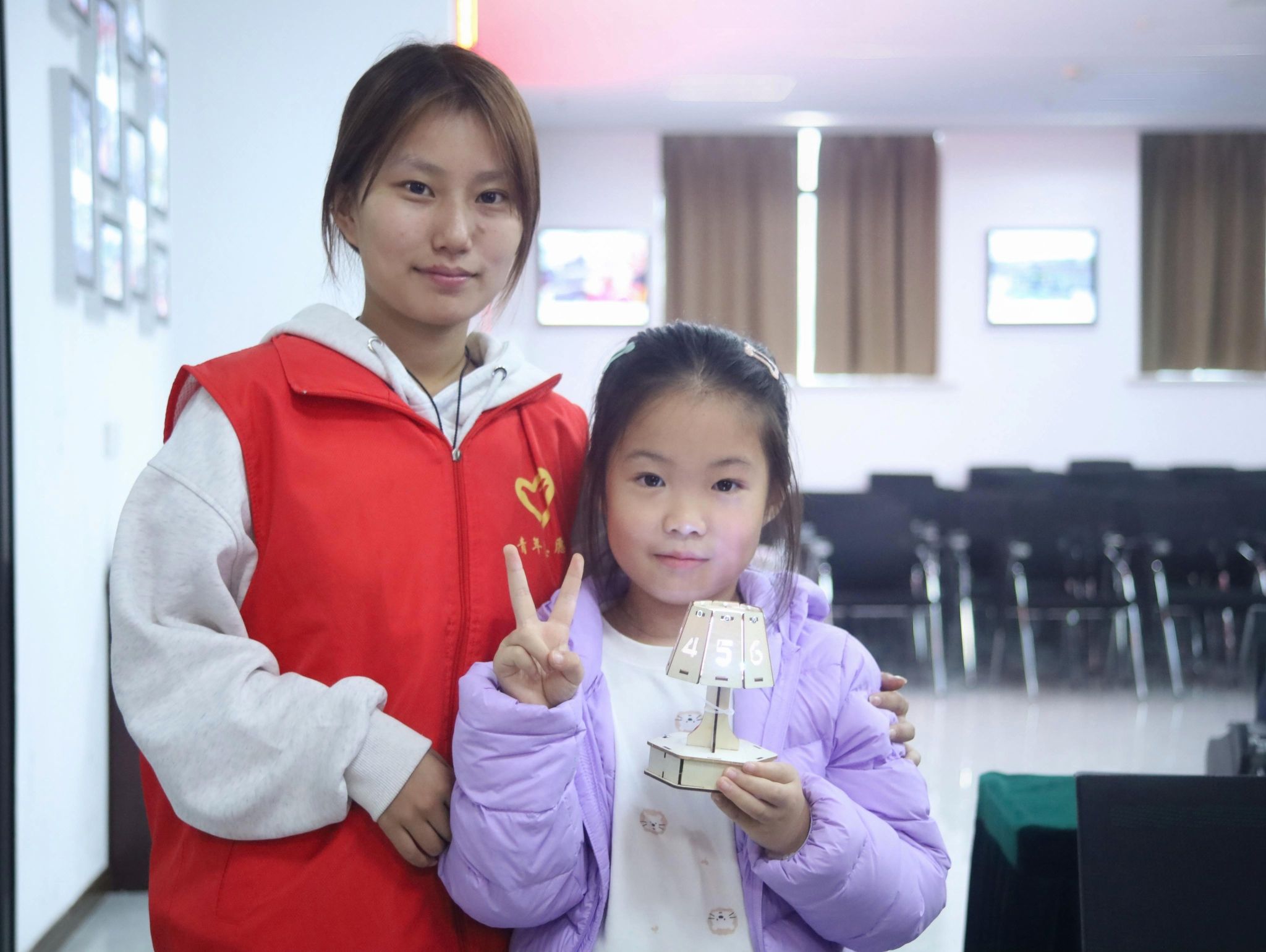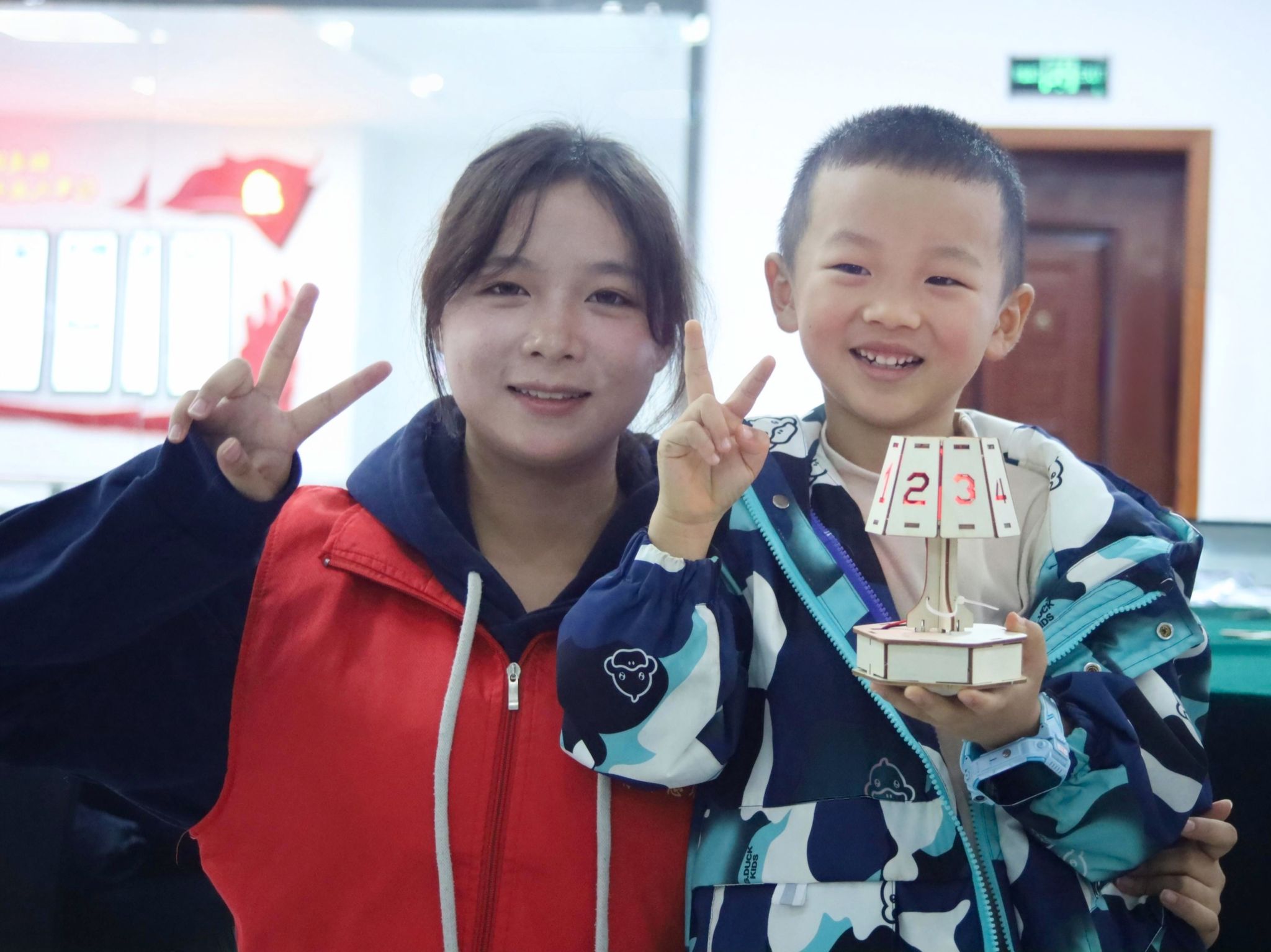 开场讲解AI,小朋友们满眼好奇、踊跃互动,让我懂了科技从来不远。小夜灯制作时,帮孩子们拧螺丝、拼零件,有人说要送给妈妈,亮起的彩光在他们脸上跳跃,才知我们带的是AI知识,收获的是“技术变陪伴”的温柔。合影时,灯光揉着笑意,原来志愿从不是单向付出,而是和孩子们一起,把冰冷科技捂成了有温度的回忆。