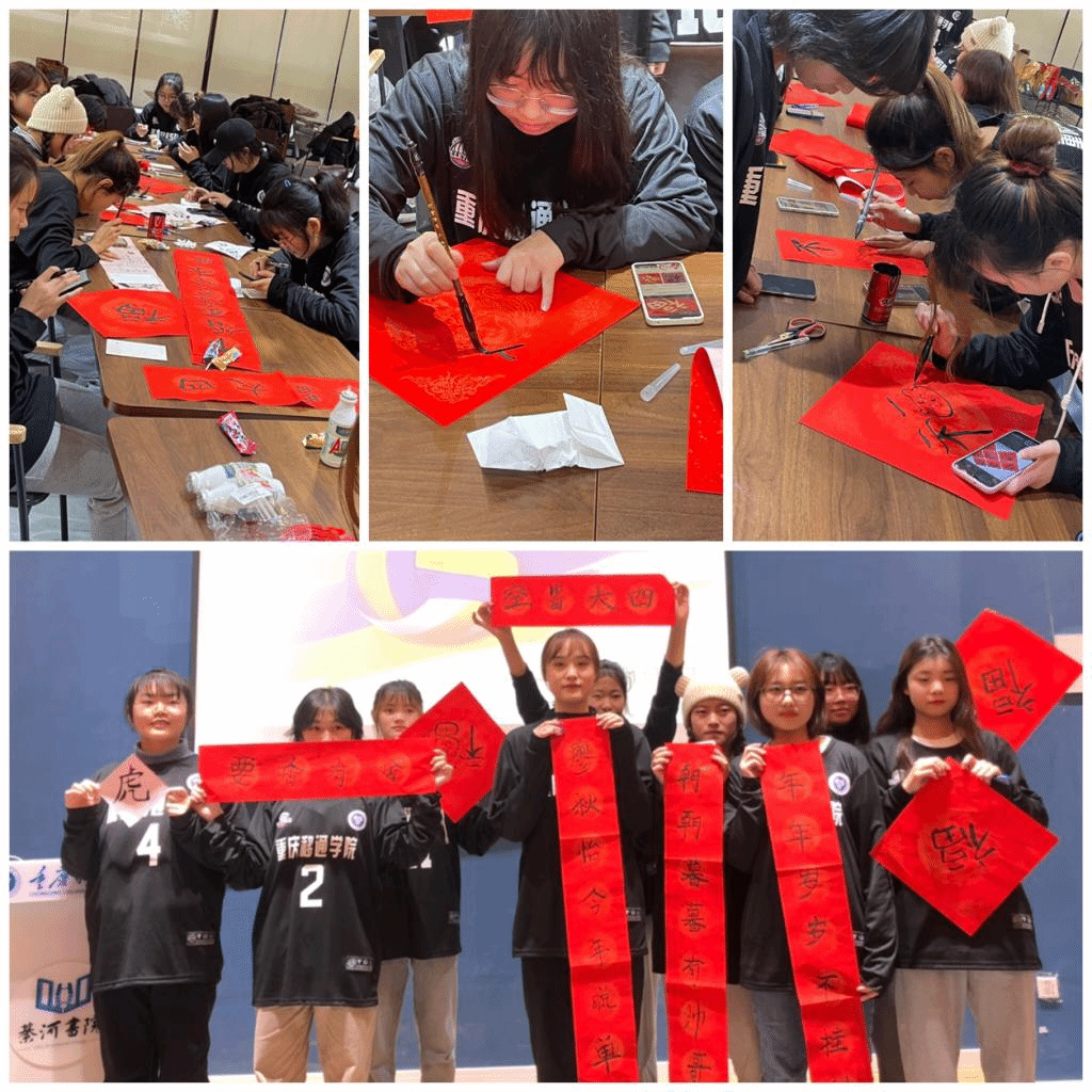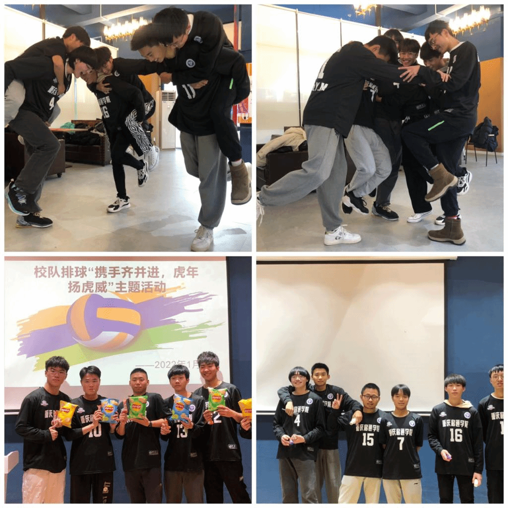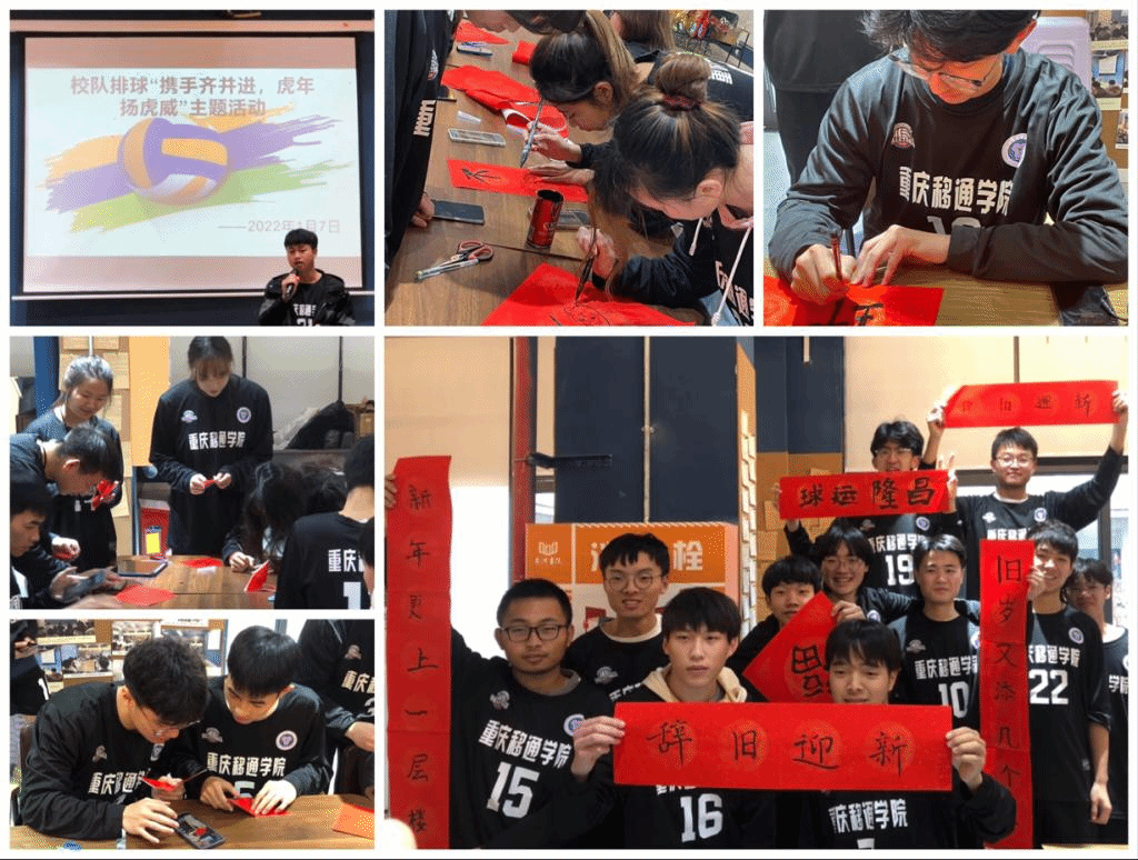 2022年1月7日下午14:00,重庆移通学院(綦江校区)排球校队。在辞旧迎新之际特此策划了校队团建活动——“携手齐并进,虎年扬虎威”本次活动包含:写对联,福字,猜灯谜,心有灵犀,几条腿游戏,谱写新年祝福,教练和队员们欢聚一堂,喜迎新年。