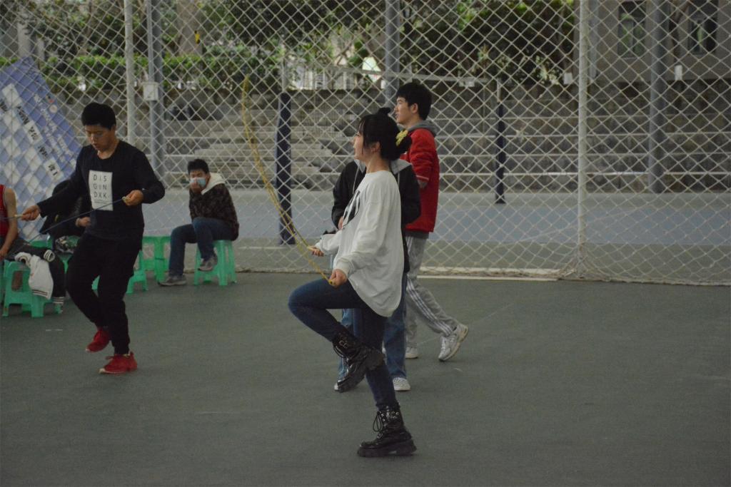 接下来的便是单人跳绳和双人跳绳。其中双人跳绳对于两位同学有着极大的默契要求。在试跳时,失误不断出现,但两位同学们渐渐形成默契,在跳动中找到最佳频率,跳绳个数也是飞快增长,最后双人跳也取得了不错的成绩。参加单人跳绳的同学最为卖力,从一开始就使足全力,使出一脚跳一个的“绝技”,引来一旁同学们的阵阵喝彩。