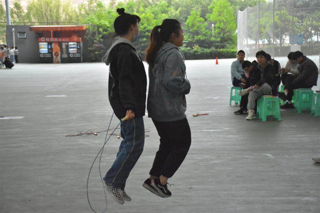 专升本电及4班首先进行的是集体8字绳,只见8个同学快速从班级群里走出进行试跳。在进行几次简单的试跳过后,随着一声开始,他们飞快的挥动着绳,在空中舞出阵阵虚影,6名同学看准时机不断的在绳中穿入穿出,场下的同学则是全神贯注。